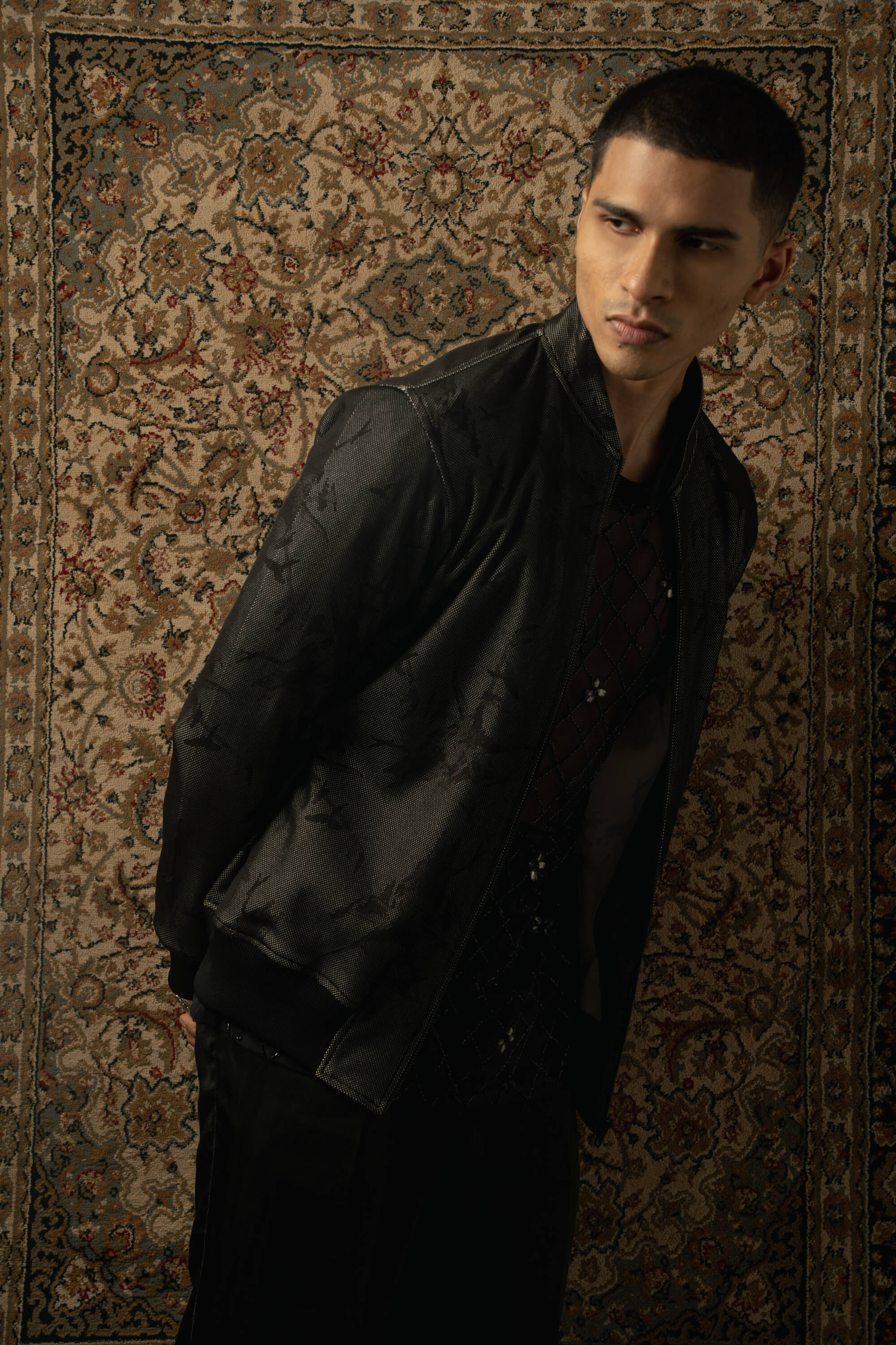 This 3-piece black layered set blends rugged sophistication with a biker edge. The jacket, crafted from premium digital printed lycra, features tonal hand embroidery for a touch of luxury. Paired with a sleek double net shirt and matching pants, the ensemble combines edgy charm with timeless style. Perfect for making a statement with a hint of rebellion, this set offers a striking balance of ruggedness and elegance for any occasion.