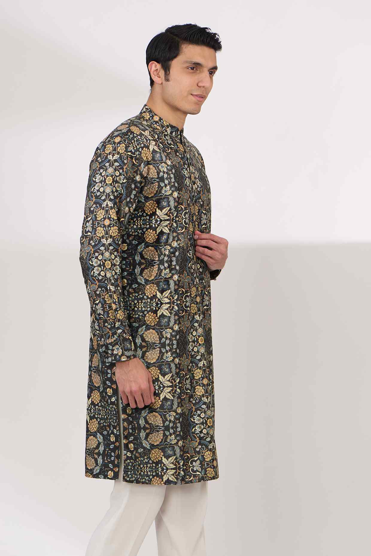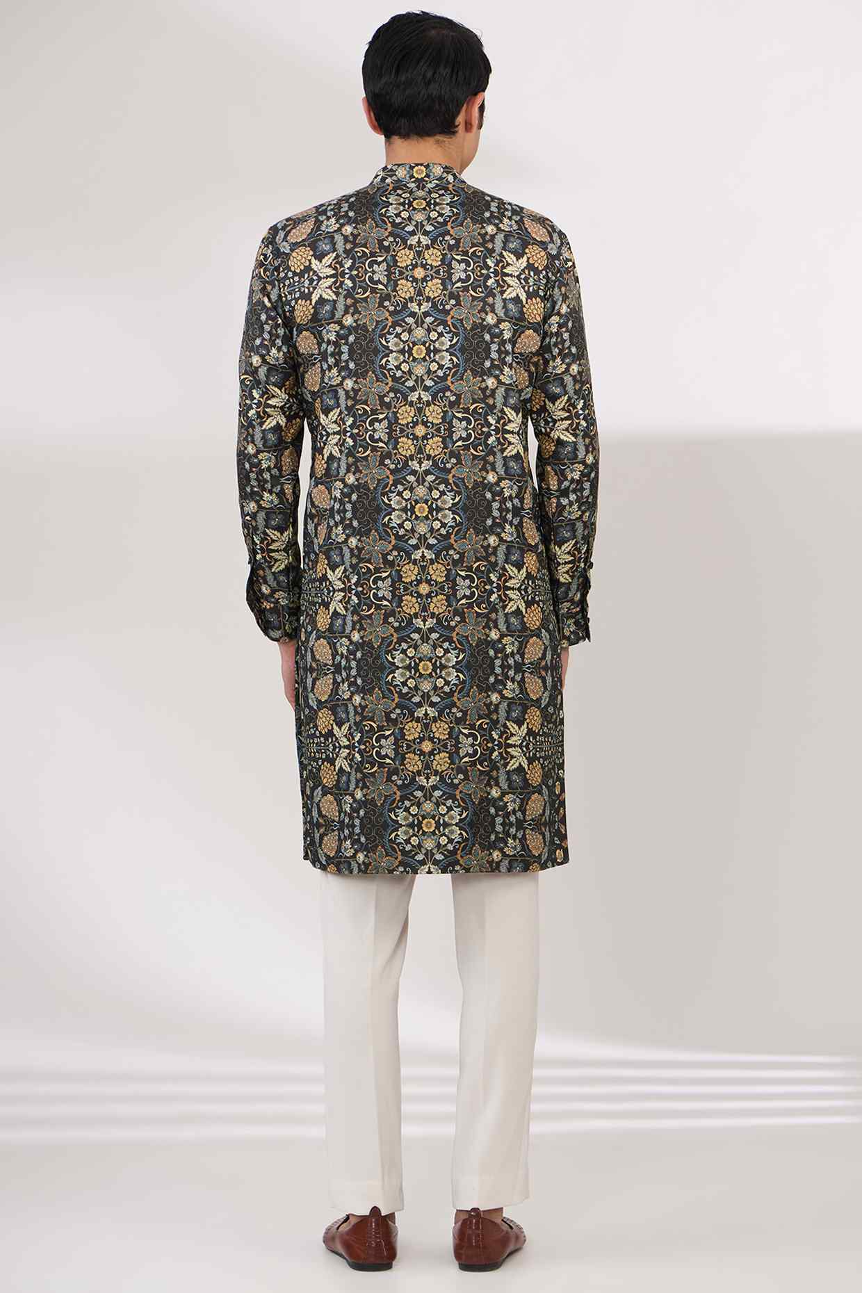 Discover refined elegance with our black print kurta and pant set. The kurta features a striking black print, crafted from a luxurious blend of velvet and pashmina for a rich, textured look. It is lined with smooth crepe for added comfort and a polished drape.
