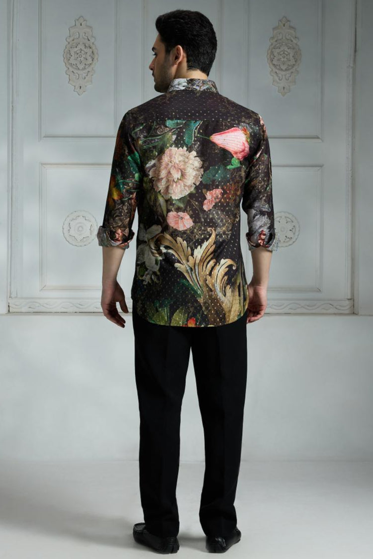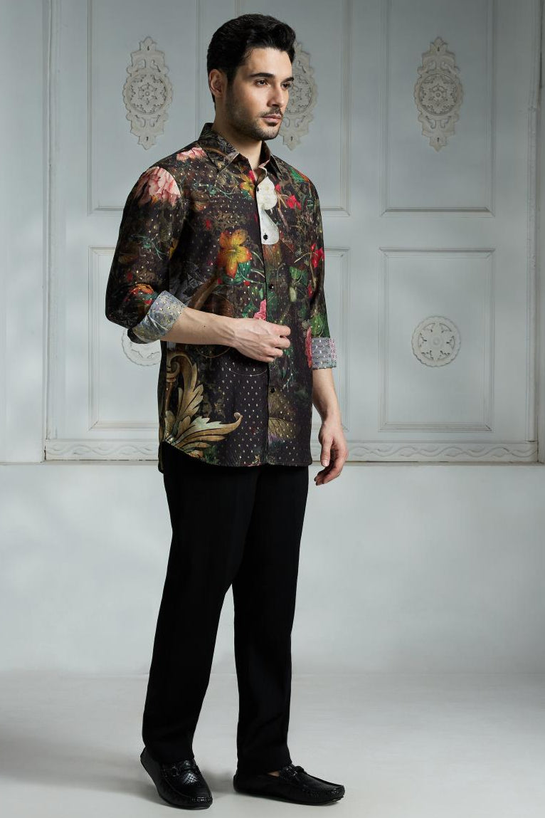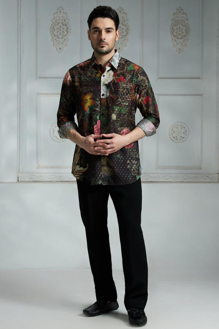This stylish long-sleeved shirt features a vibrant signature floral print that brings a bold yet elegant touch to any look. Crafted from soft, breathable fabric, it includes a left-side chest pocket and a full button-up design to the collar. Ideal for both formal and semi-casual occasions, it pairs beautifully with tailored trousers for an effortlessly refined and polished appearance that stands out with minimal effort.