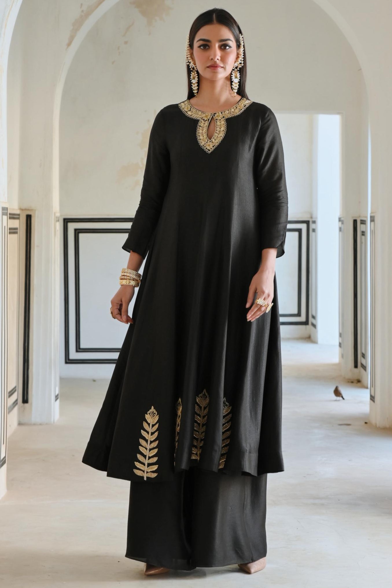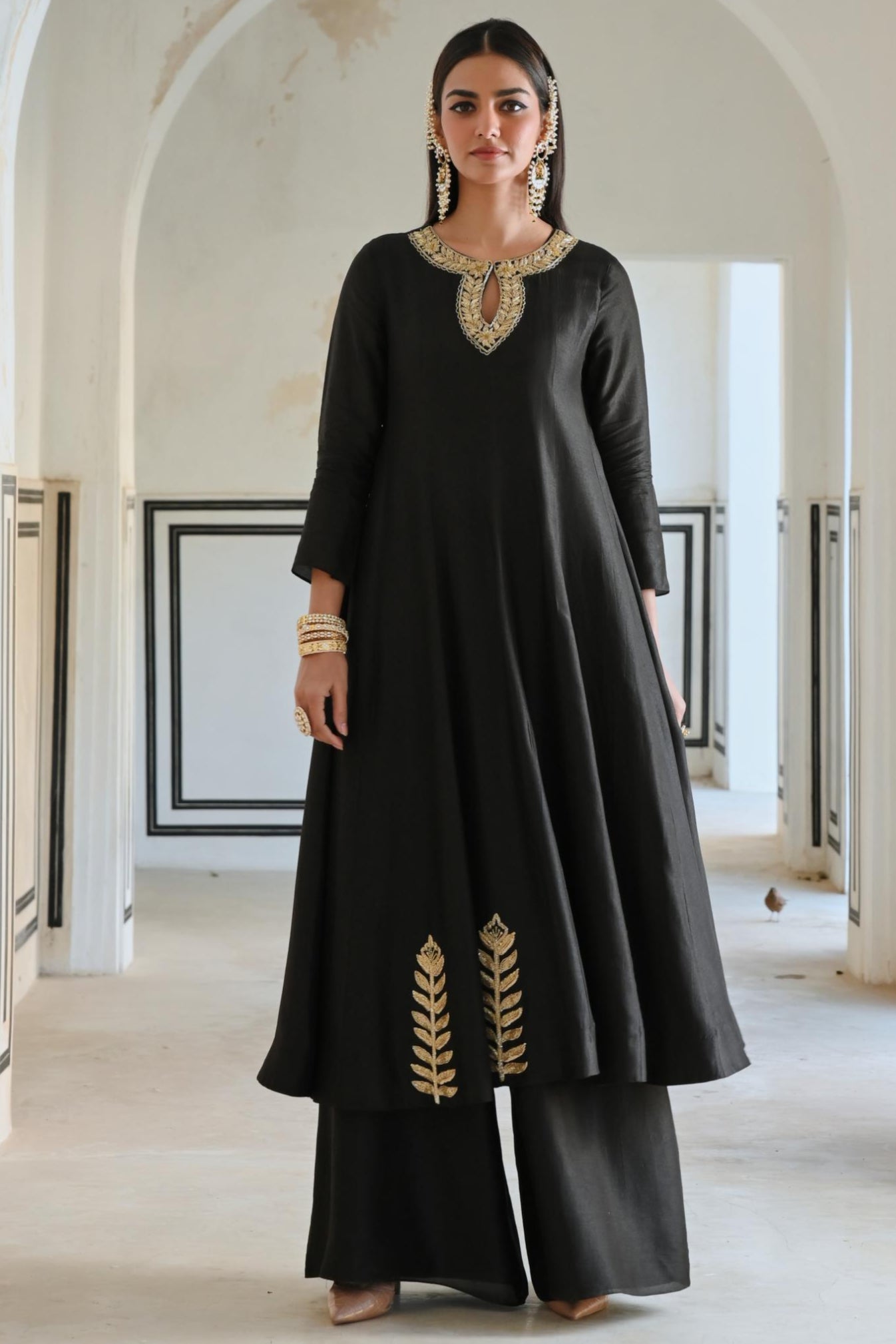 Make a timeless statement in the Black Rahi Anarkali and Palazzo Set. Featuring a graceful flow and elegant design, this ensemble is perfect for weddings, festive celebrations, and special occasions.