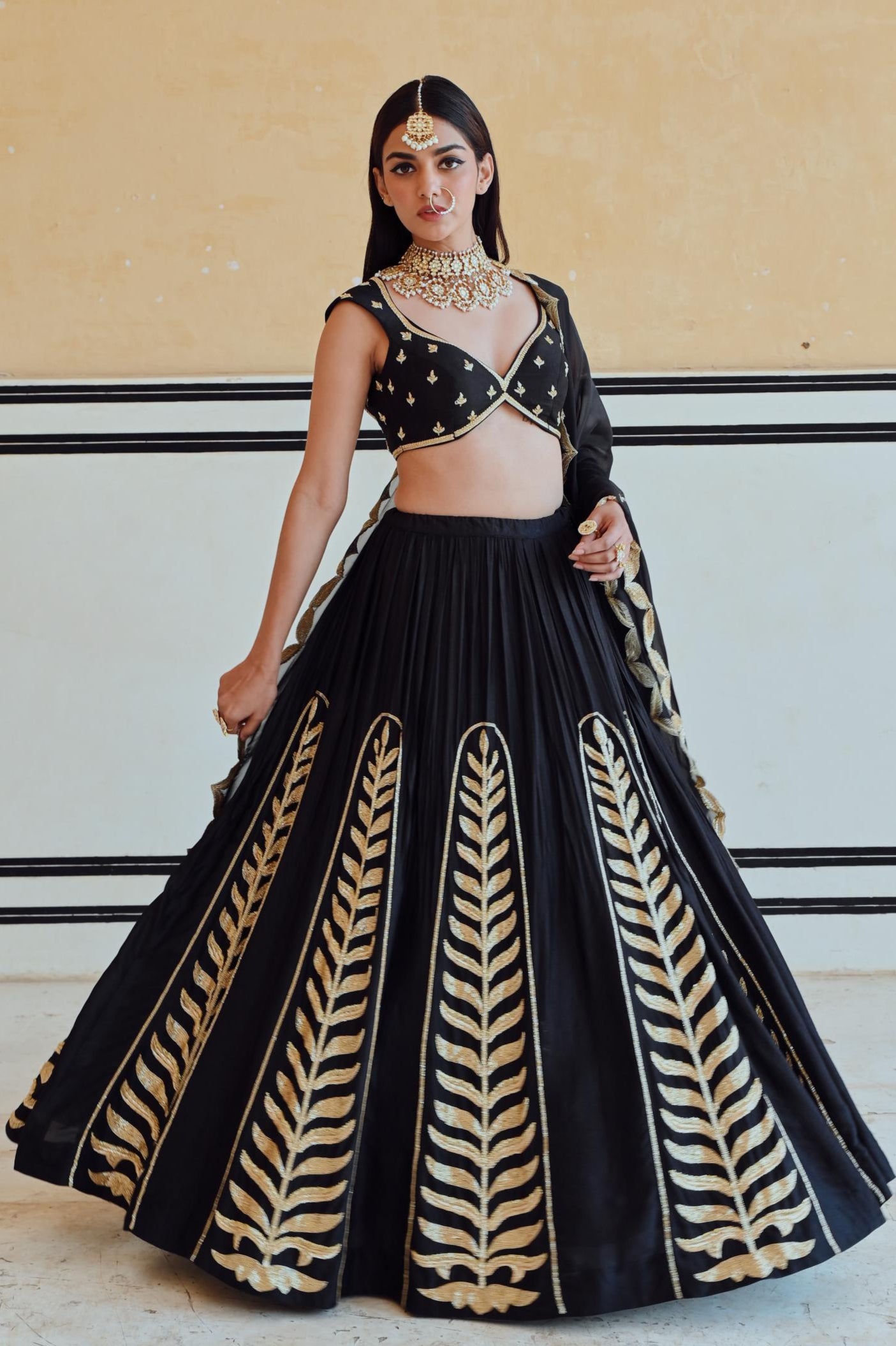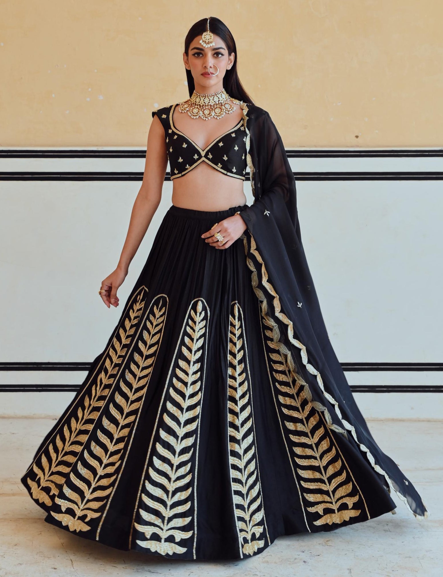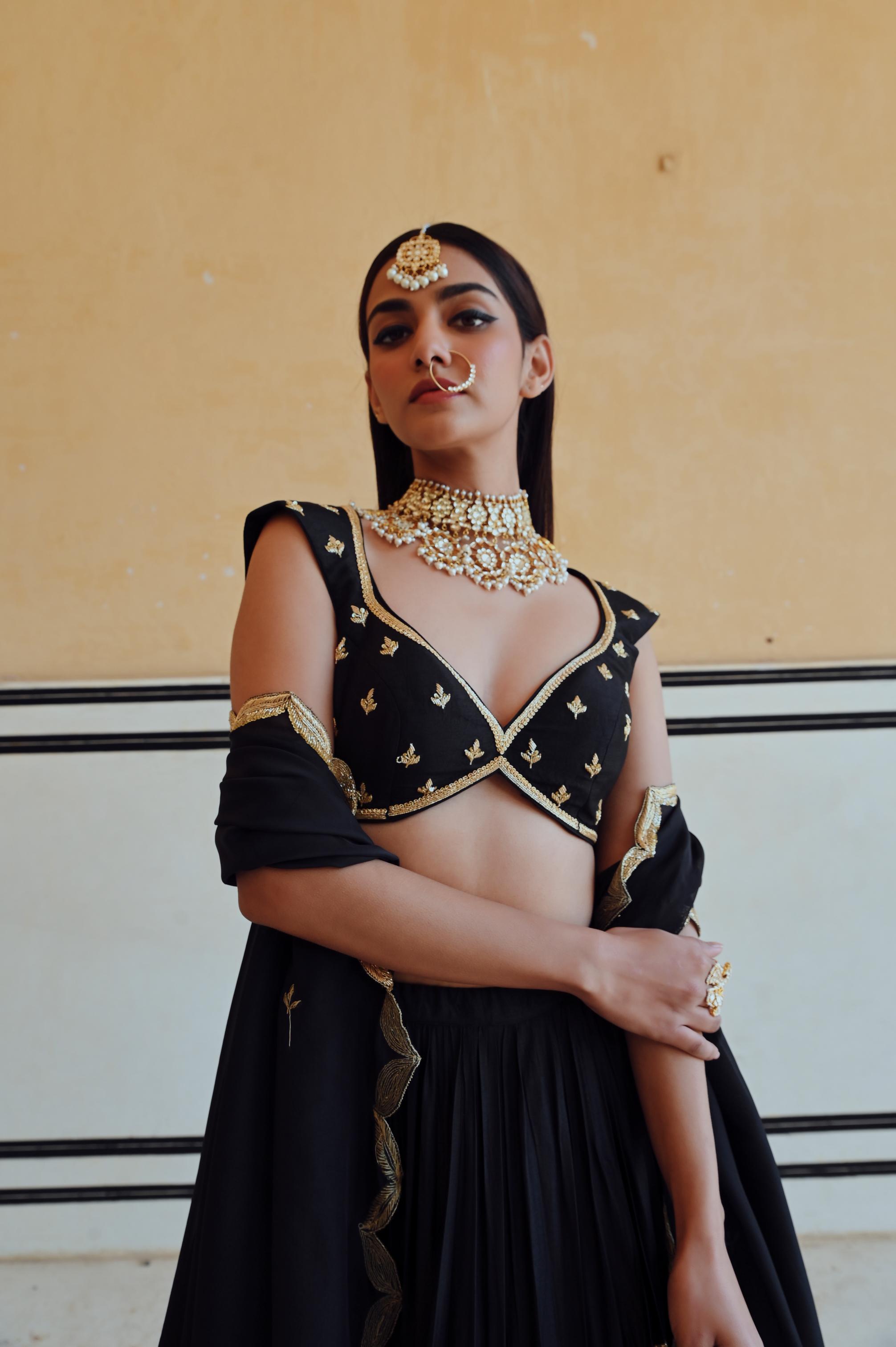 Make a striking statement in the Black Rahi Lehenga with Blouse and Dupatta. Featuring timeless elegance and a bold silhouette, this ensemble is perfect for weddings, festive celebrations, and special occasions.
