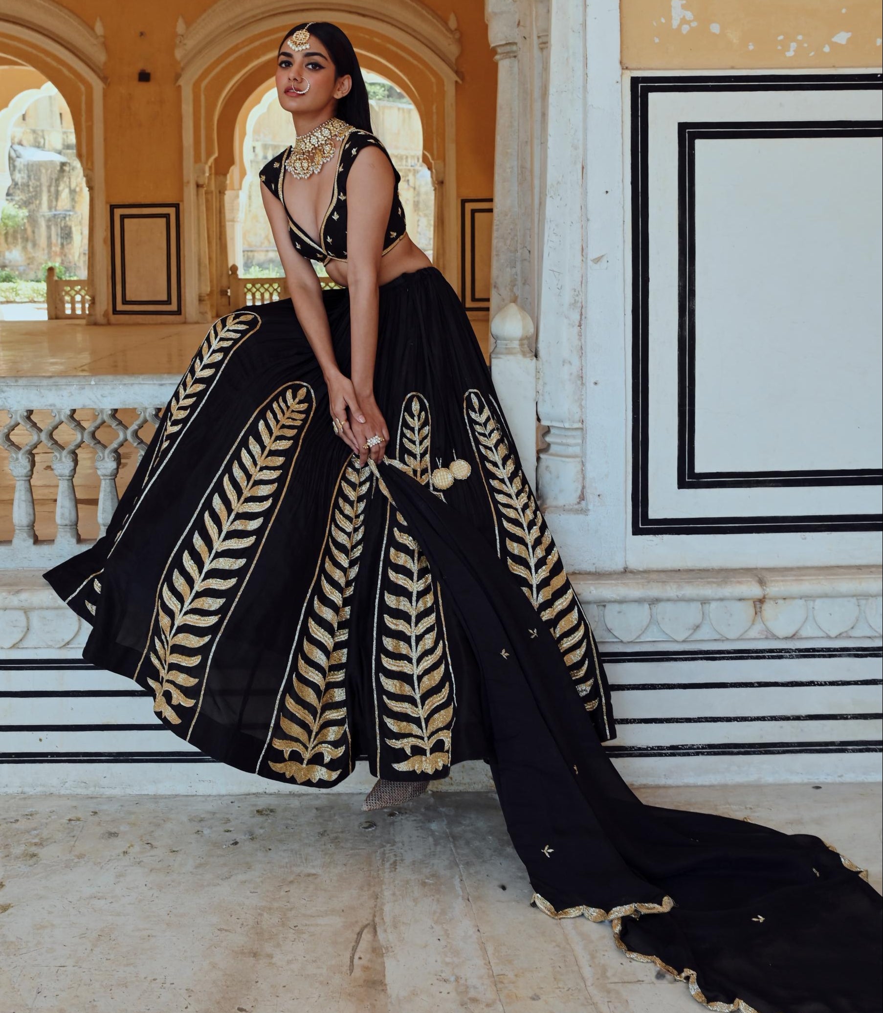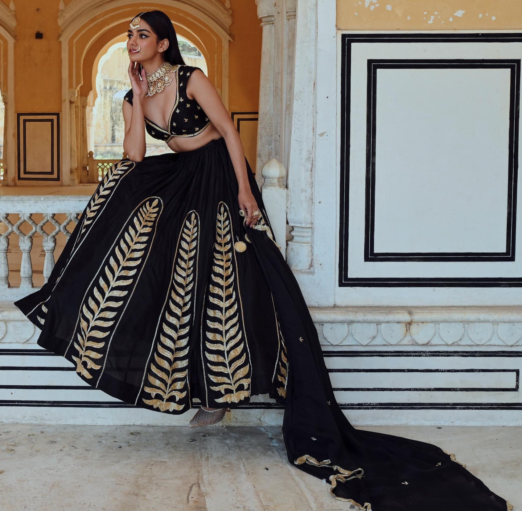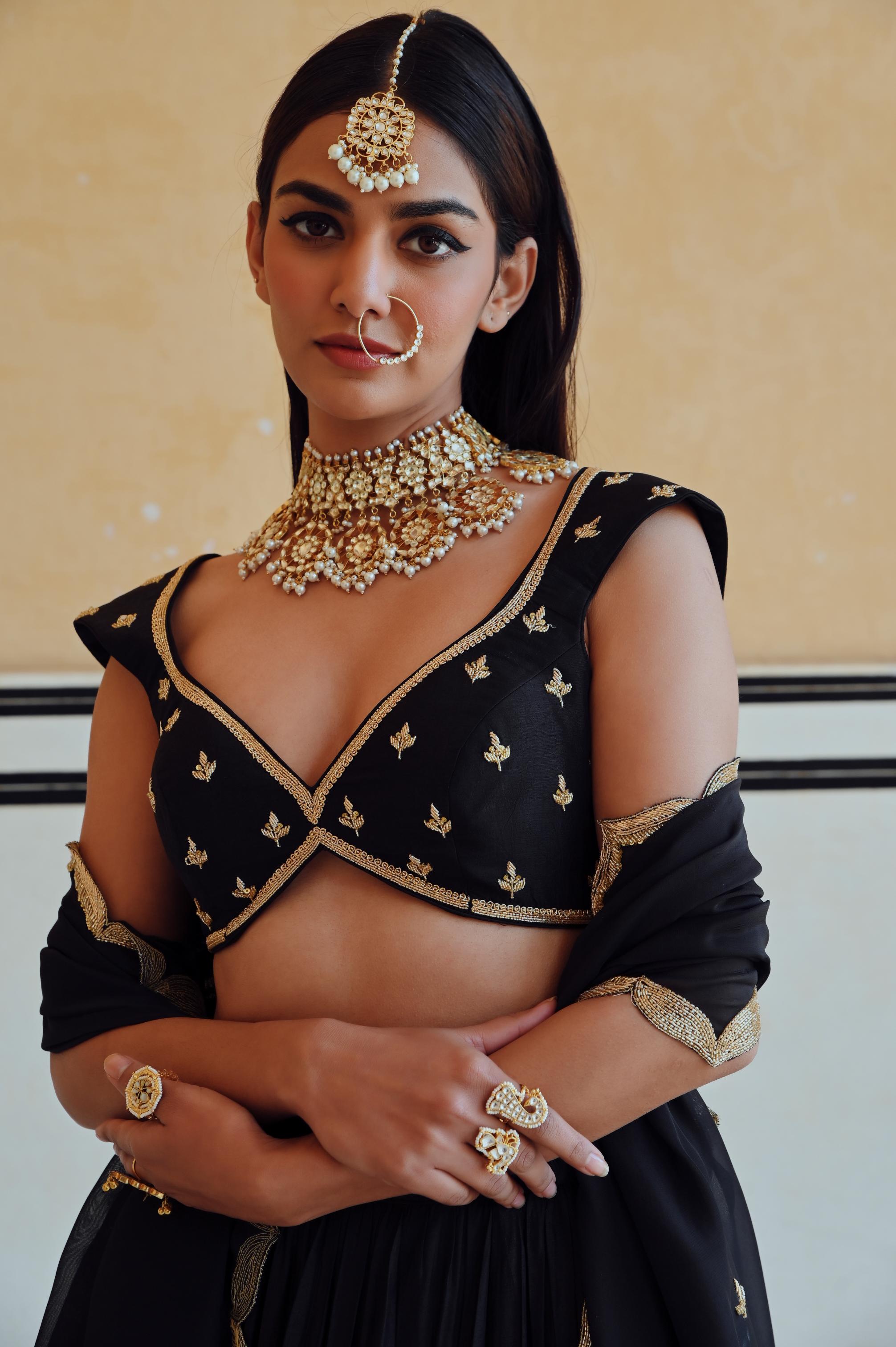 Make a striking statement in the Black Rahi Lehenga with Blouse and Dupatta. Featuring timeless elegance and a bold silhouette, this ensemble is perfect for weddings, festive celebrations, and special occasions.