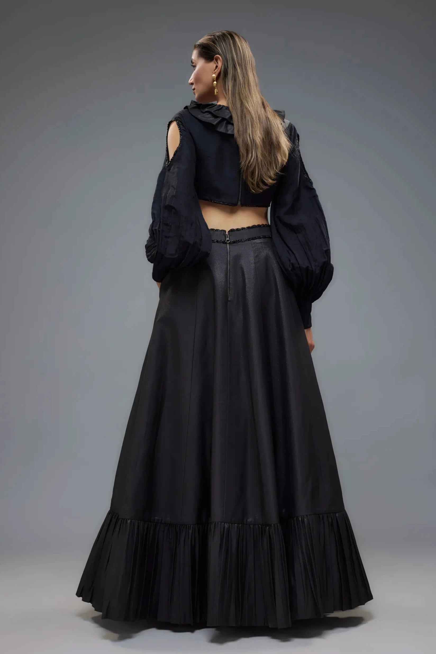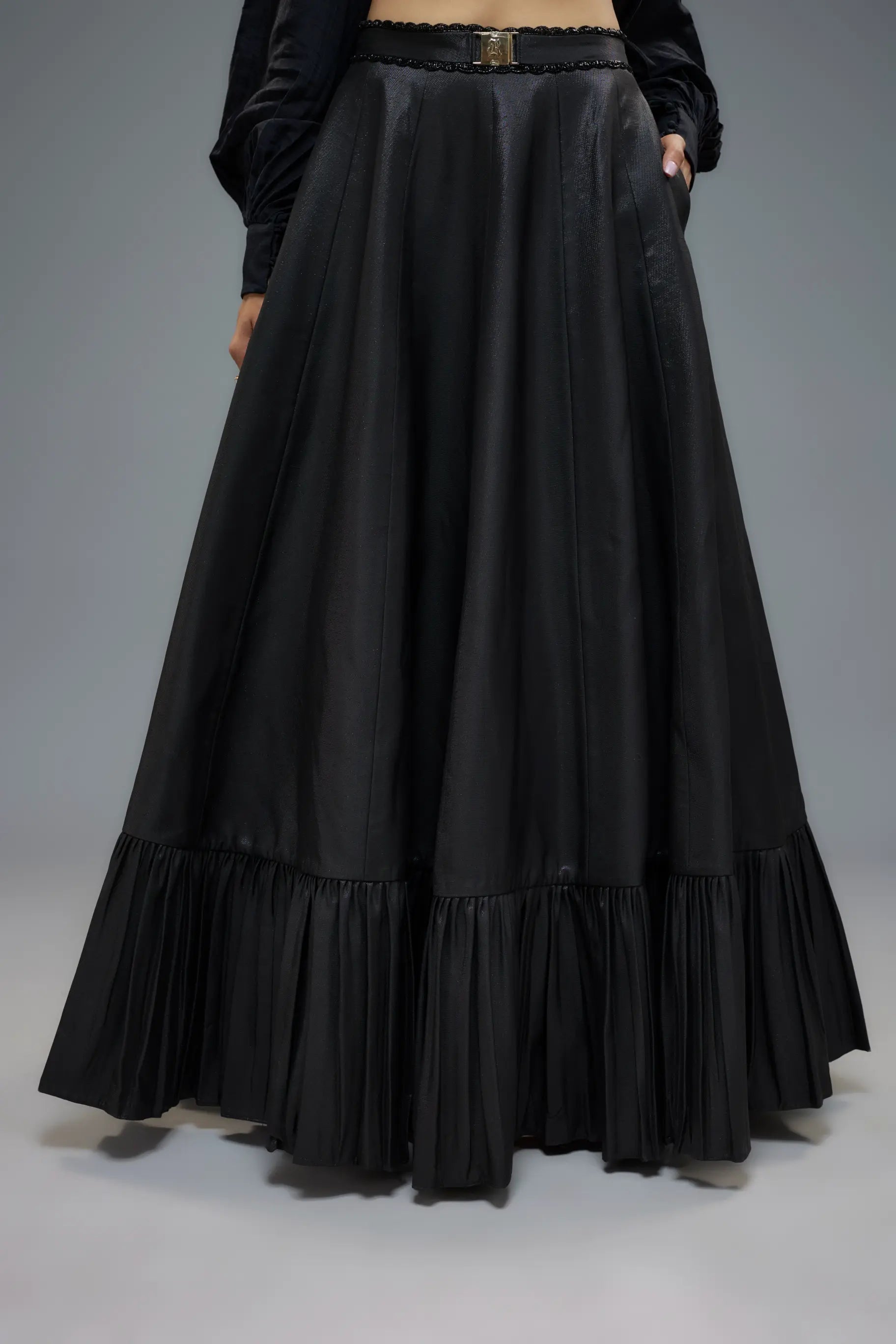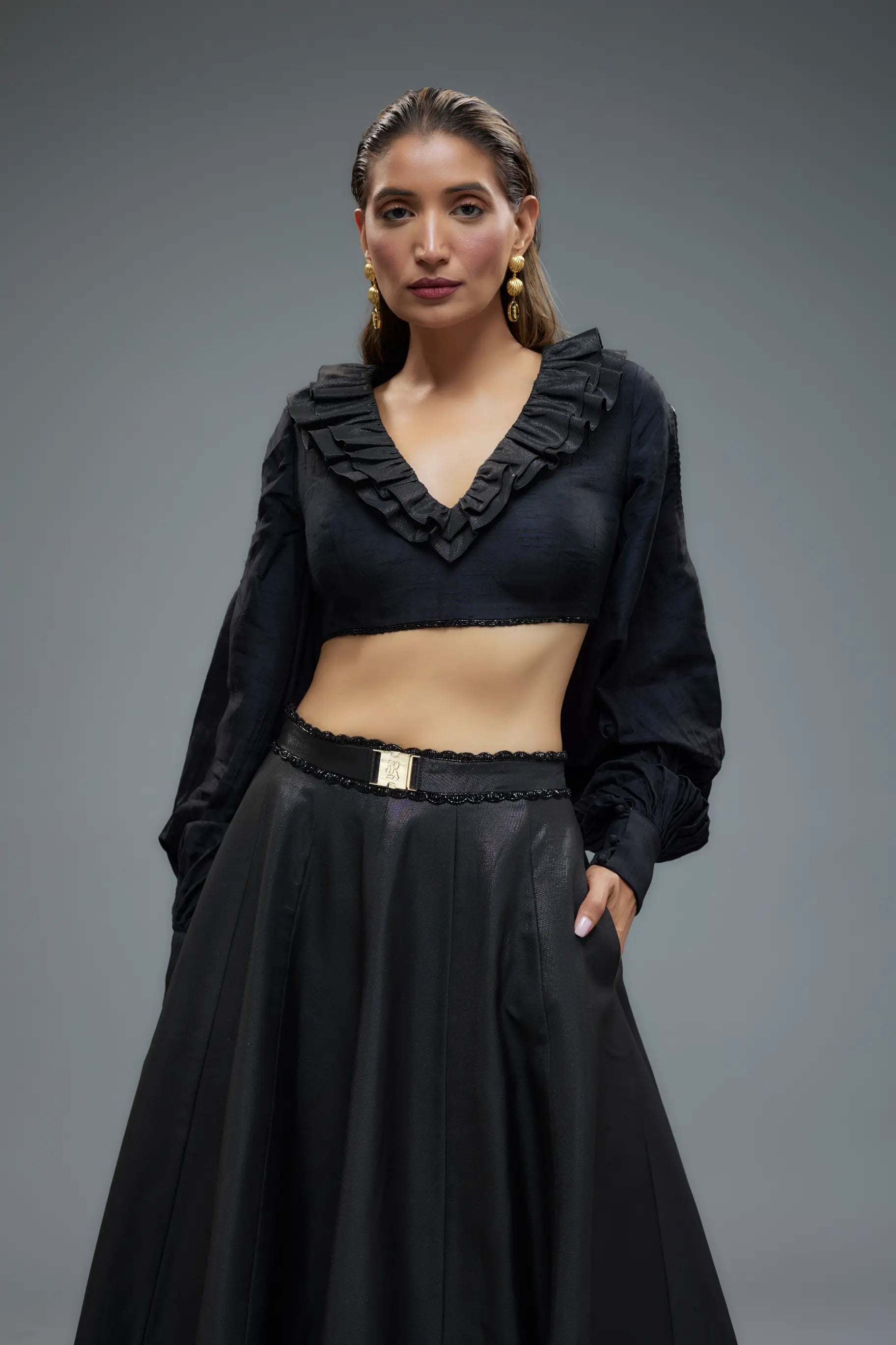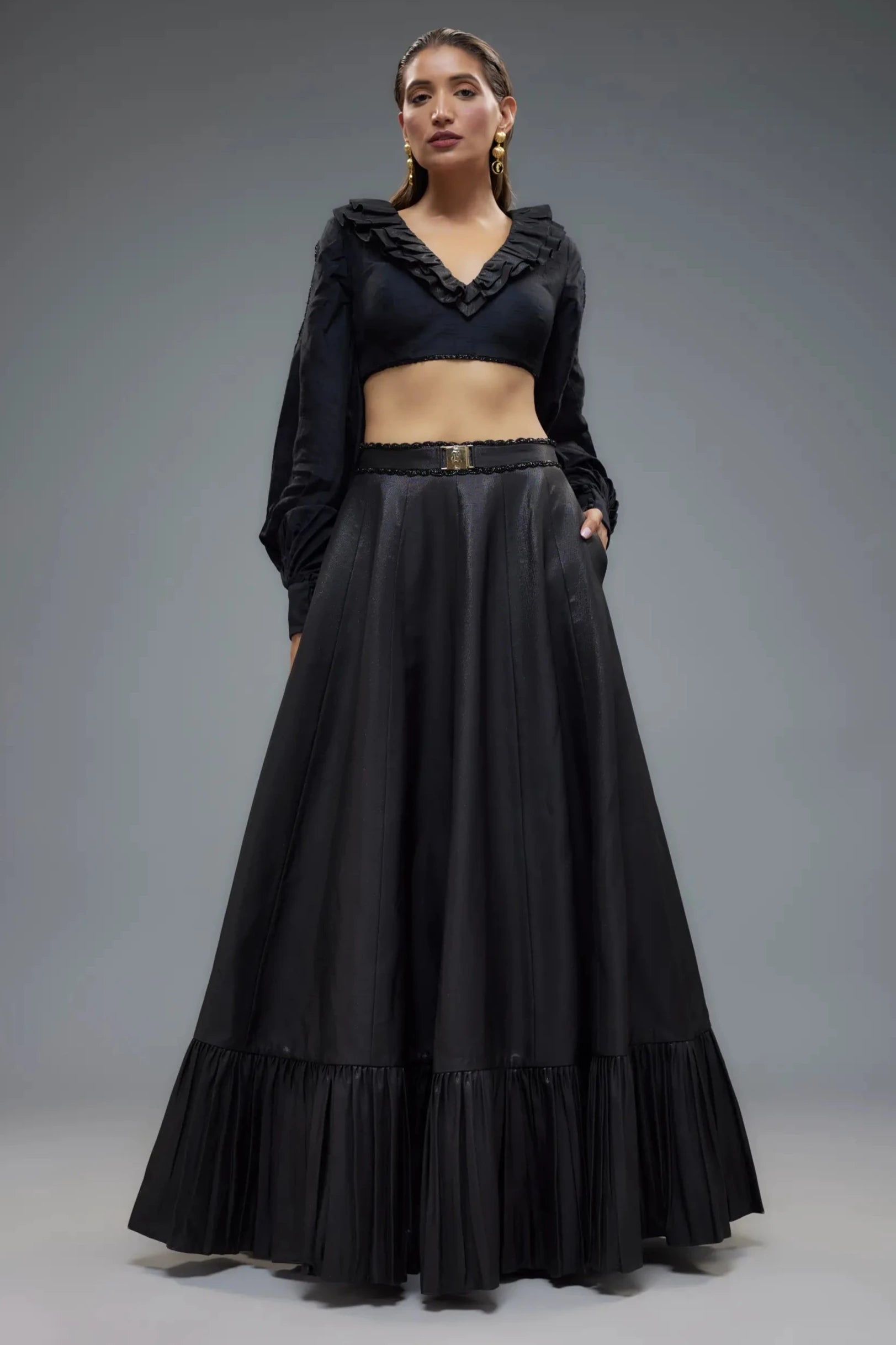 Discover the beauty of traditional craftsmanship with this stunning Black Raw Silk Frilled Lehenga. Designed to captivate this exquisite piece combines the luxurious texture of raw silk with a modern frilled silhouette that exudes sophistication and grace. Ideal for special occasions weddings and cultural celebrations this lehenga features intricate detailing and a rich bold black hue that is both classic and versatile. The flowing frills add a dynamic touch to the overall look offering a contemporary twist on a traditional style.