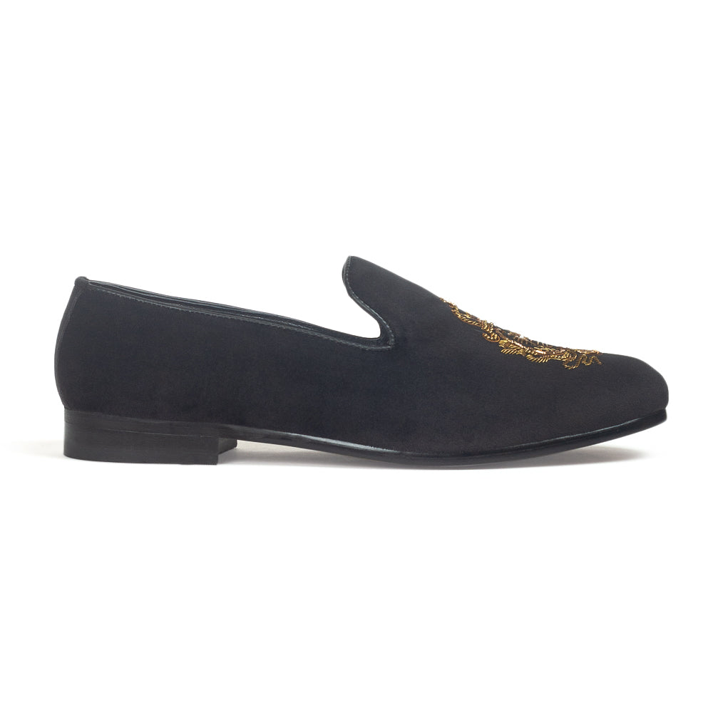Elevate your footwear collection with the Black Royal Bee Slip-Ons, a symbol of power, prestige, and refined craftsmanship. Featuring a luxurious black velvet base, these slip-ons are adorned with an intricately embroidered royal bee motif, representing nobility and grandeur. Designed for men who appreciate elegance with a touch of heritage, this pair is perfect for weddings, festive occasions, and high-profile gatherings.