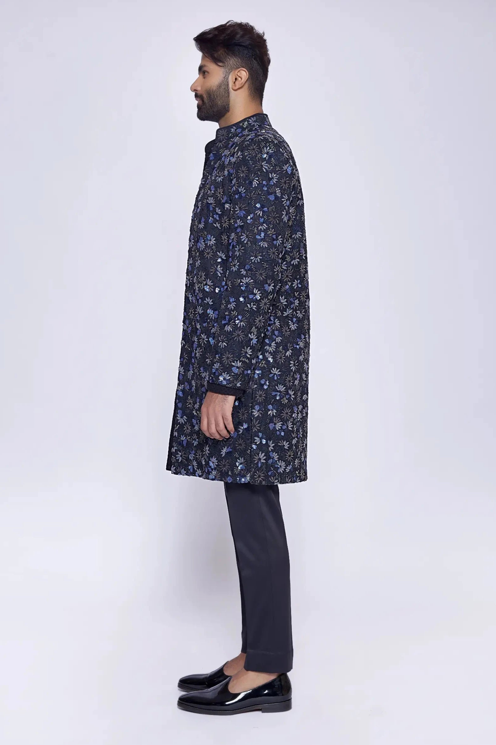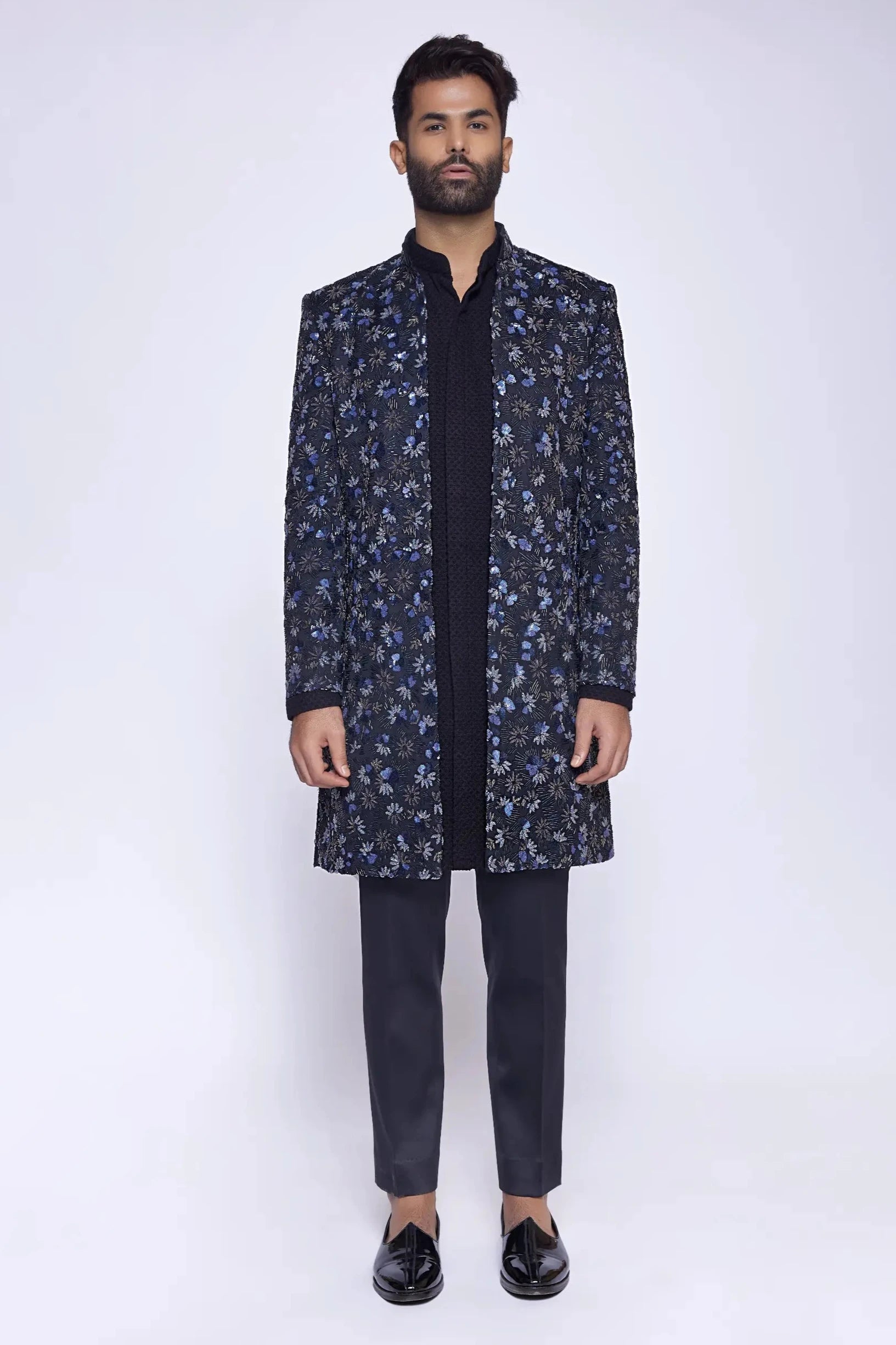 Step into a world of sophistication with the Black Salli Cut Dana Embroidered Open Sherwani, a striking fusion of timeless craftsmanship and contemporary design. The rich black hue offers a bold, elegant foundation, while the intricate Salli cut dana embroidery adds texture, depth, and opulence to the piece. This sherwani is perfect for weddings, receptions, or any formal event where you want to make a lasting impression.
