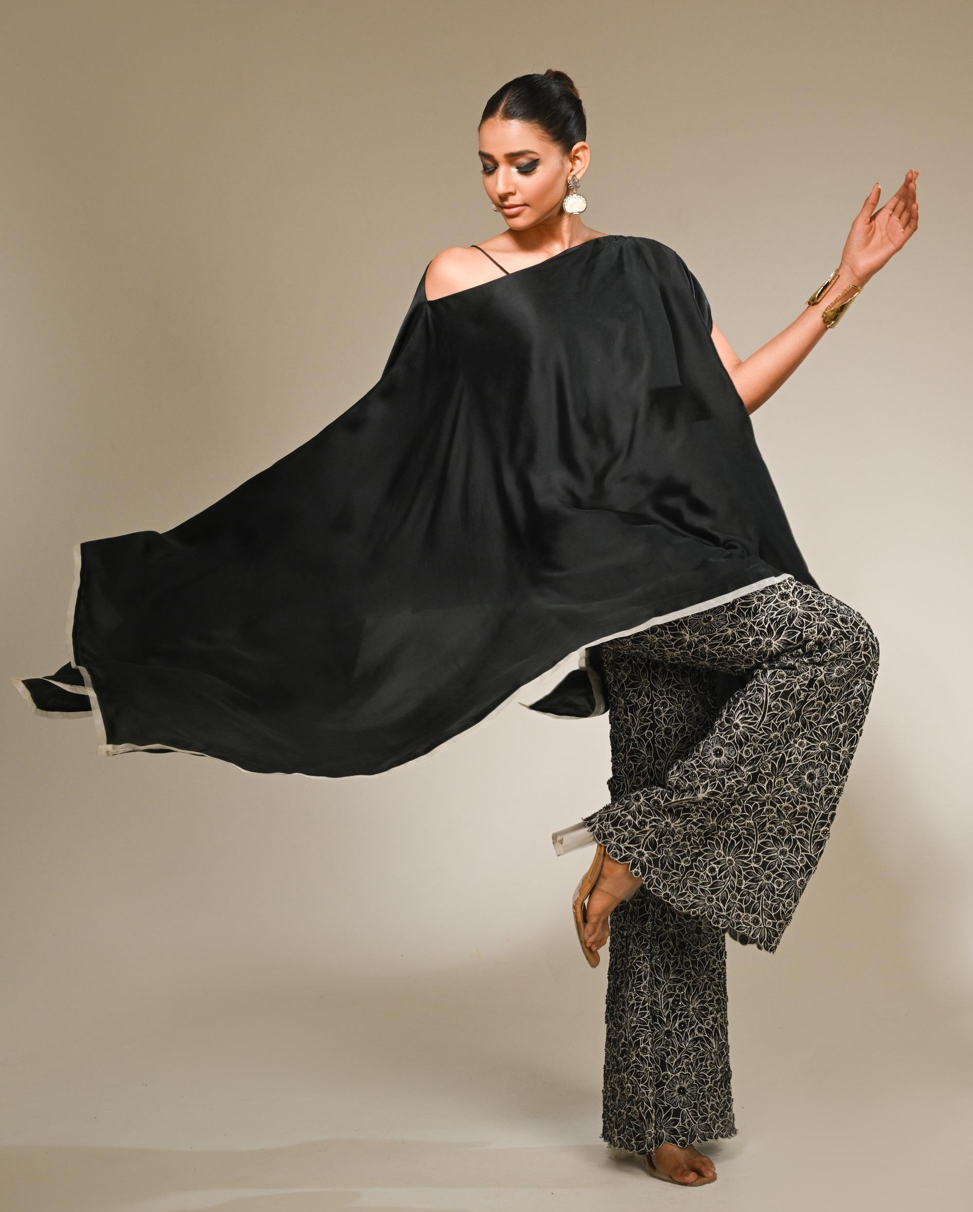 Sleek, fluid, and unapologetically bold—the Black Satin Asymmetric Kaftan Set redefines relaxed elegance. Crafted from lustrous satin, this kaftan features an asymmetric hemline that adds modern structure to its free-flowing silhouette. The rich black hue exudes sophistication, while the lightweight fabric ensures effortless movement and comfort. Ideal for evening gatherings, festive lounging, or destination celebrations, the Black Satin Asymmetric Kaftan Set is the perfect blend of drama and ease for the woman who dresses with quiet confidence.
