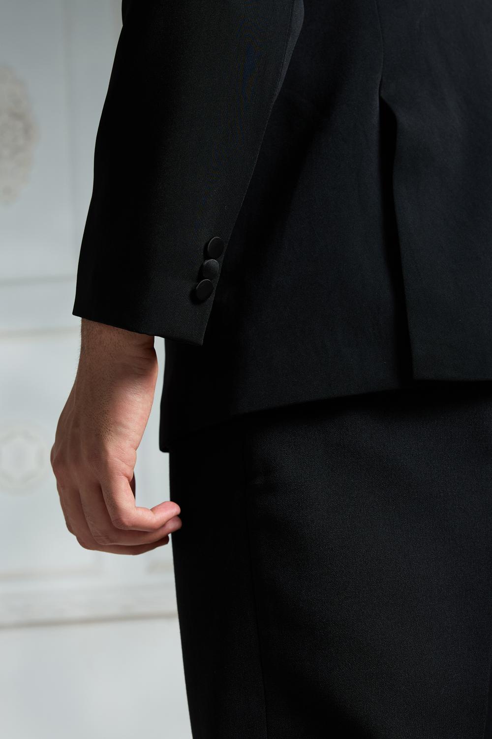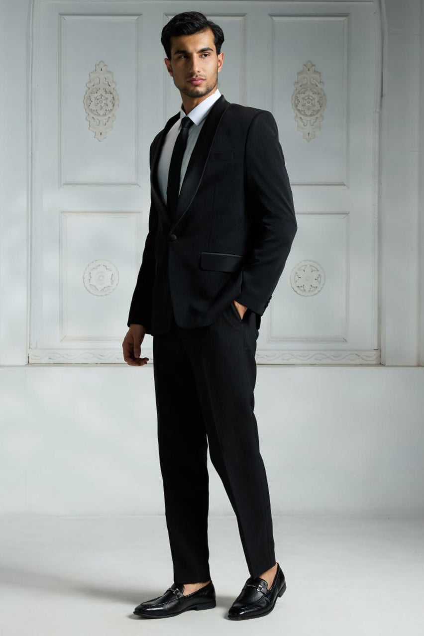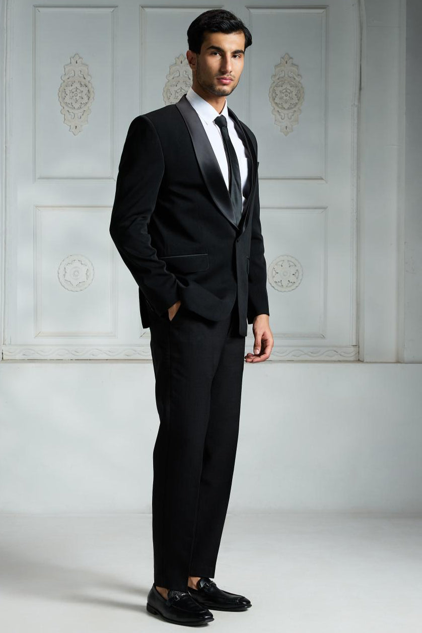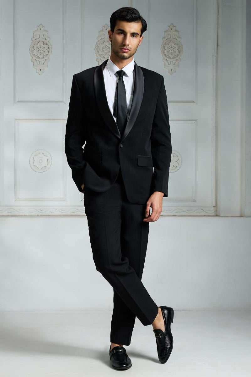 This black satin blazer showcases a stylish shawl lapel and a single-button closure for a sleek silhouette. It includes two front flap pockets and a breast pocket on the left side for added sophistication. The crepe inner lining adds comfort and a subtle edgy appeal, complementing the blazer’s clean-cut design. Pair it with a sleek watch, cufflinks, or a simple bracelet to elevate your look without overpowering the outfit’s elegant simplicity.