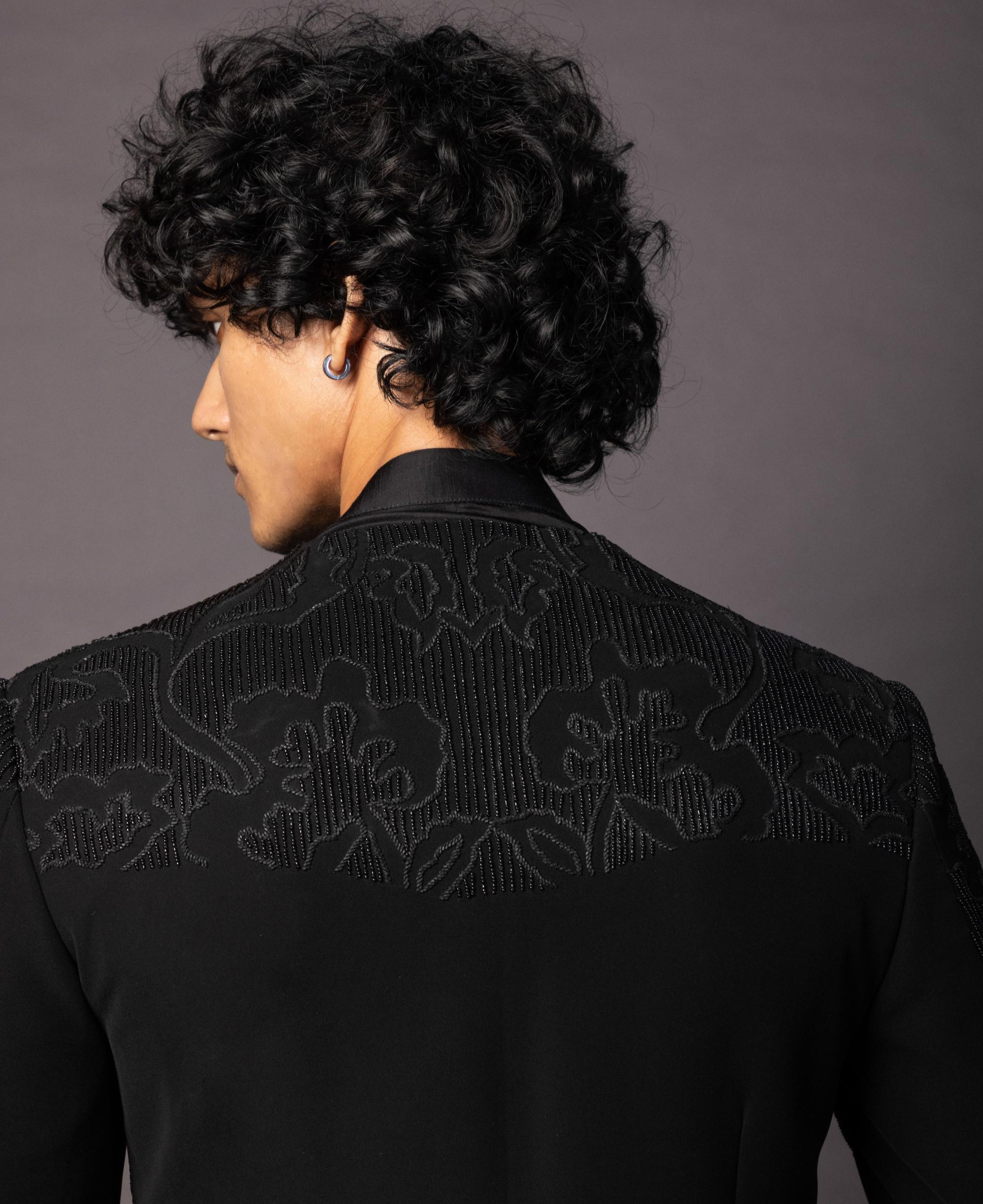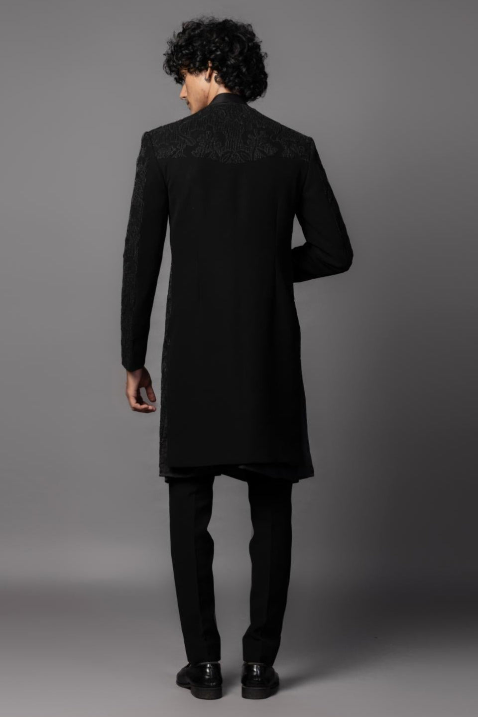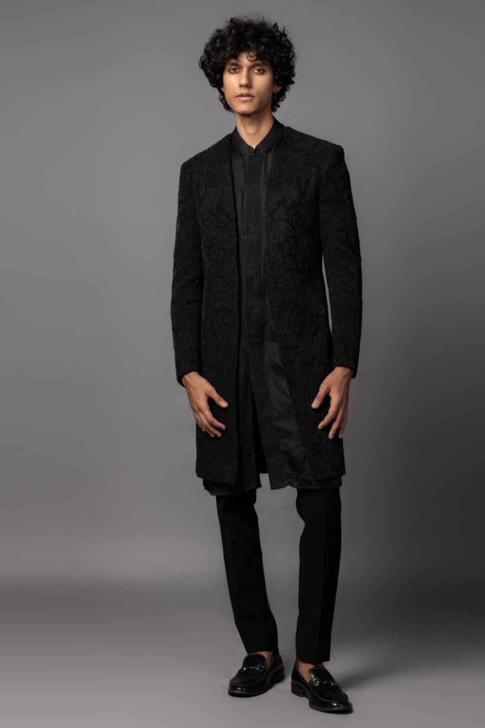 A black open jacket achkan, exquisitely embroidered with black moti and matte cutdana, exudes sophistication and modern charm. Paired with a matching kurta featuring the same intricate embroidery, this ensemble creates a seamless blend of texture and elegance. Perfect for evening celebrations, it offers a sleek, refined look for those who appreciate subtle yet impactful detailing.