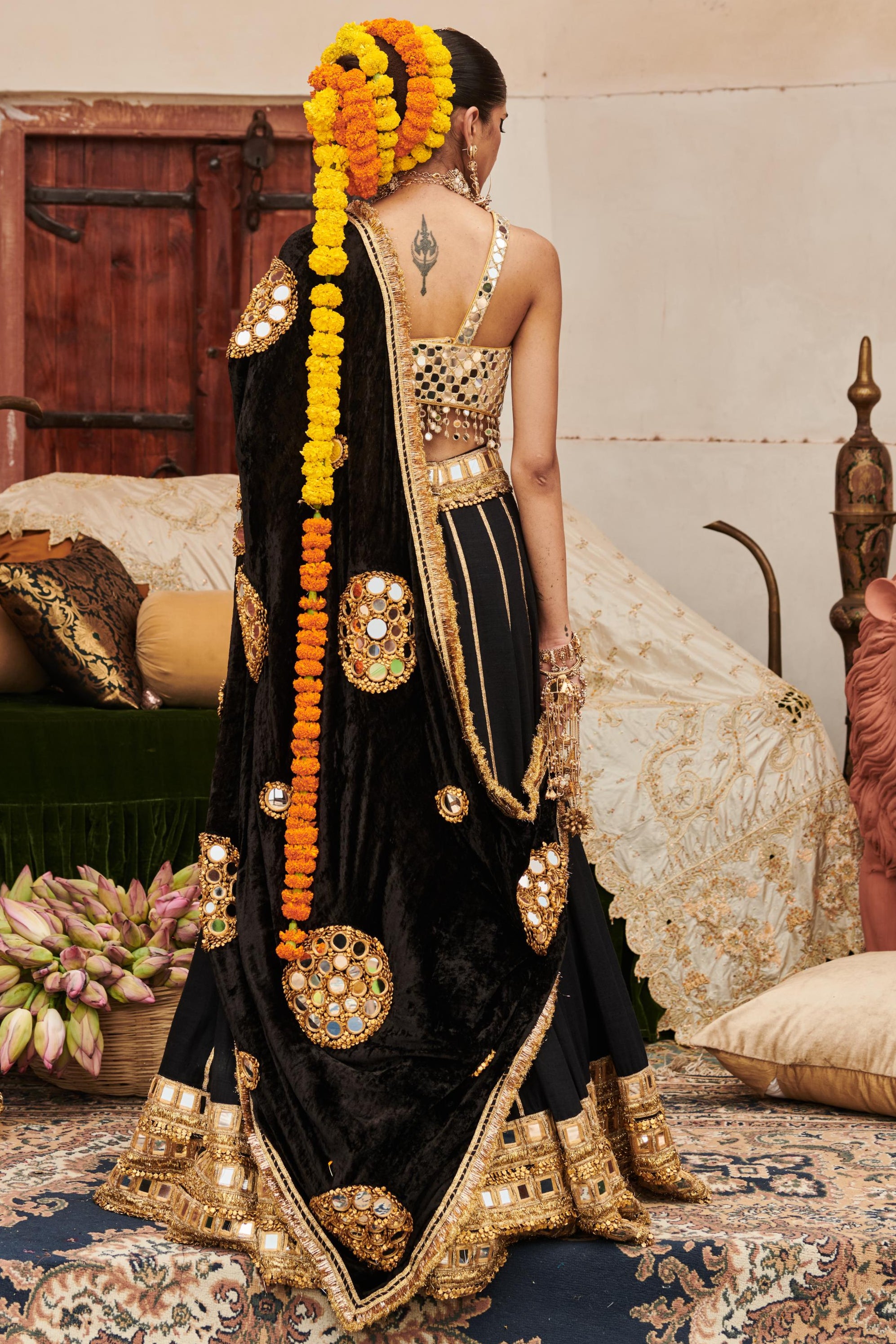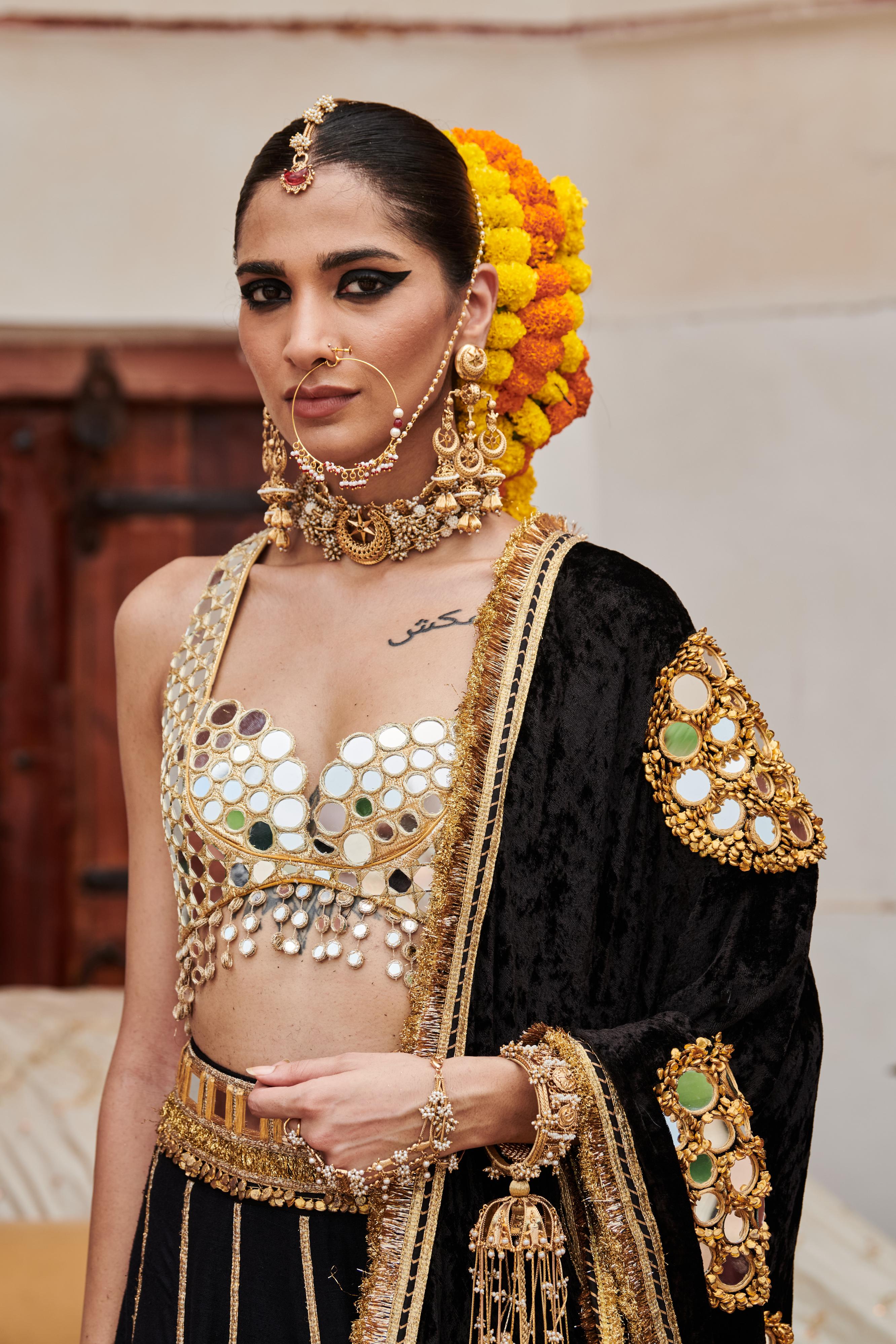 The black linen lehenga adorned with a mirror work border and elegant gota stripes is styled with a mirror work blouse on gota lined with luxurious chanderi silk. Paired with a richly embroidered velvet dupatta this ensemble exudes timeless sophistication perfect for grand celebrations and weddings.