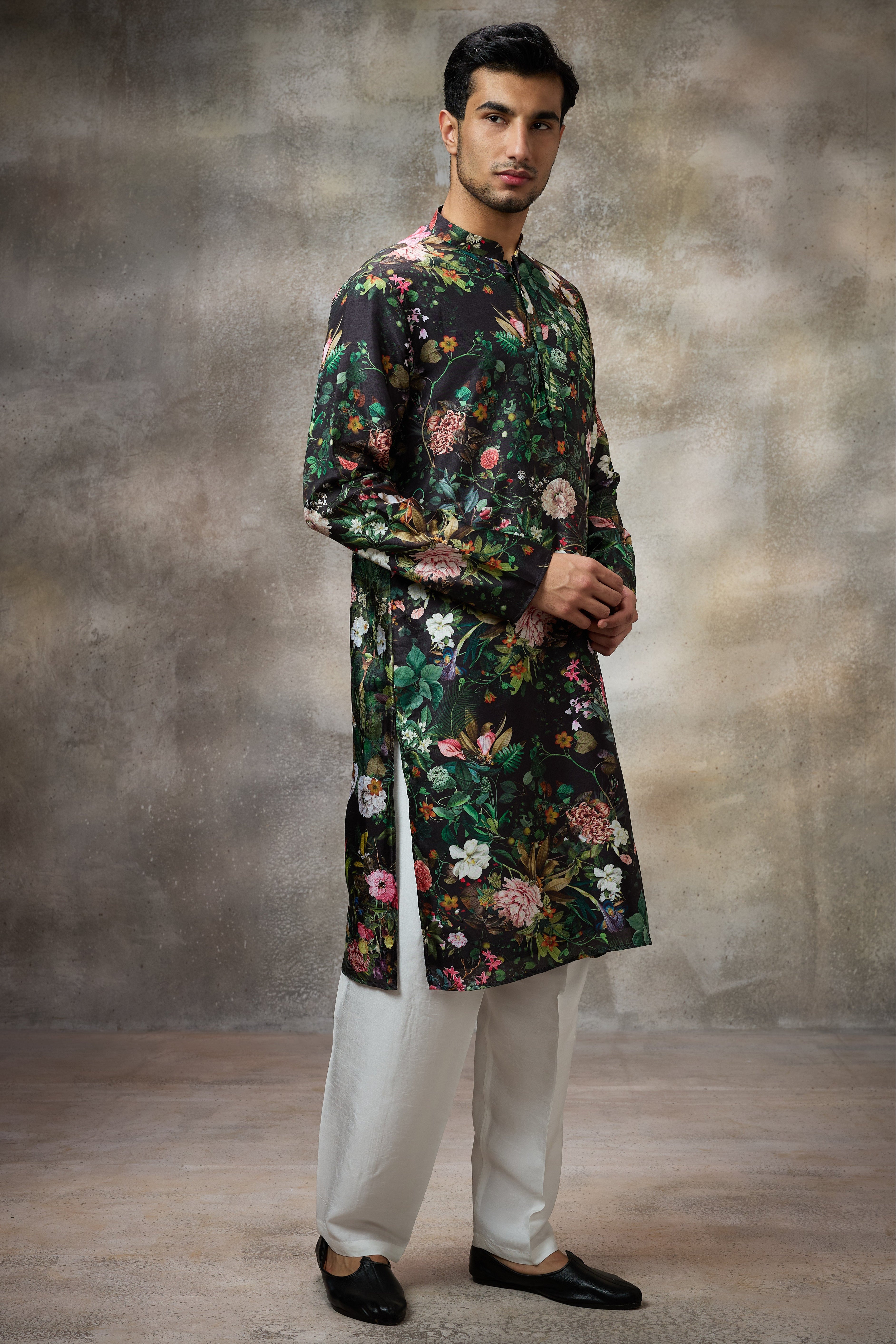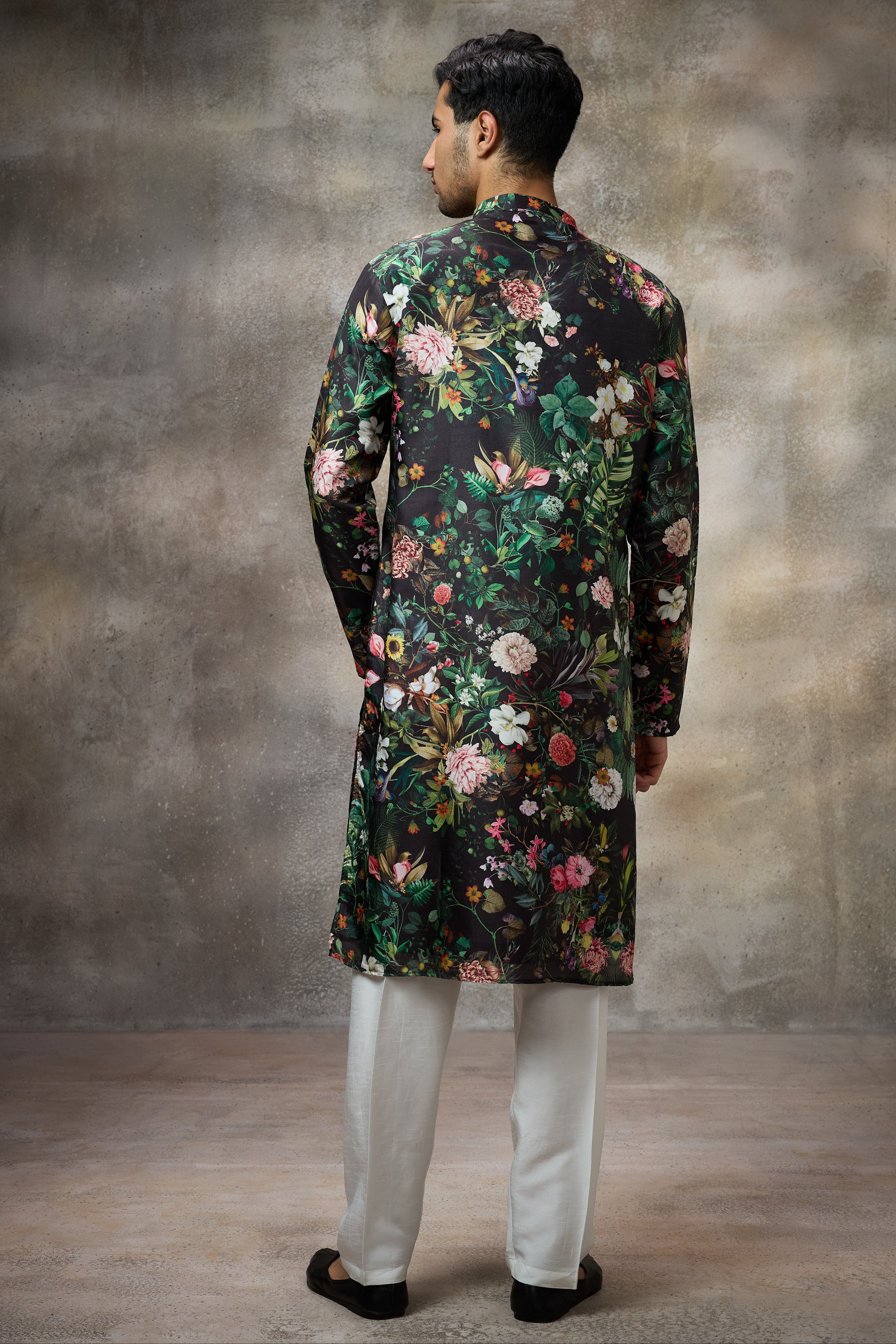 The Black Signature Floral Printed Kurta Set is bold and elegant. Intricate floral patterns stand out against the deep black base. A stylish silhouette adds sophistication to its overall design. Suitable for evening functions or festive events. A graceful fusion of tradition and contemporary appeal.