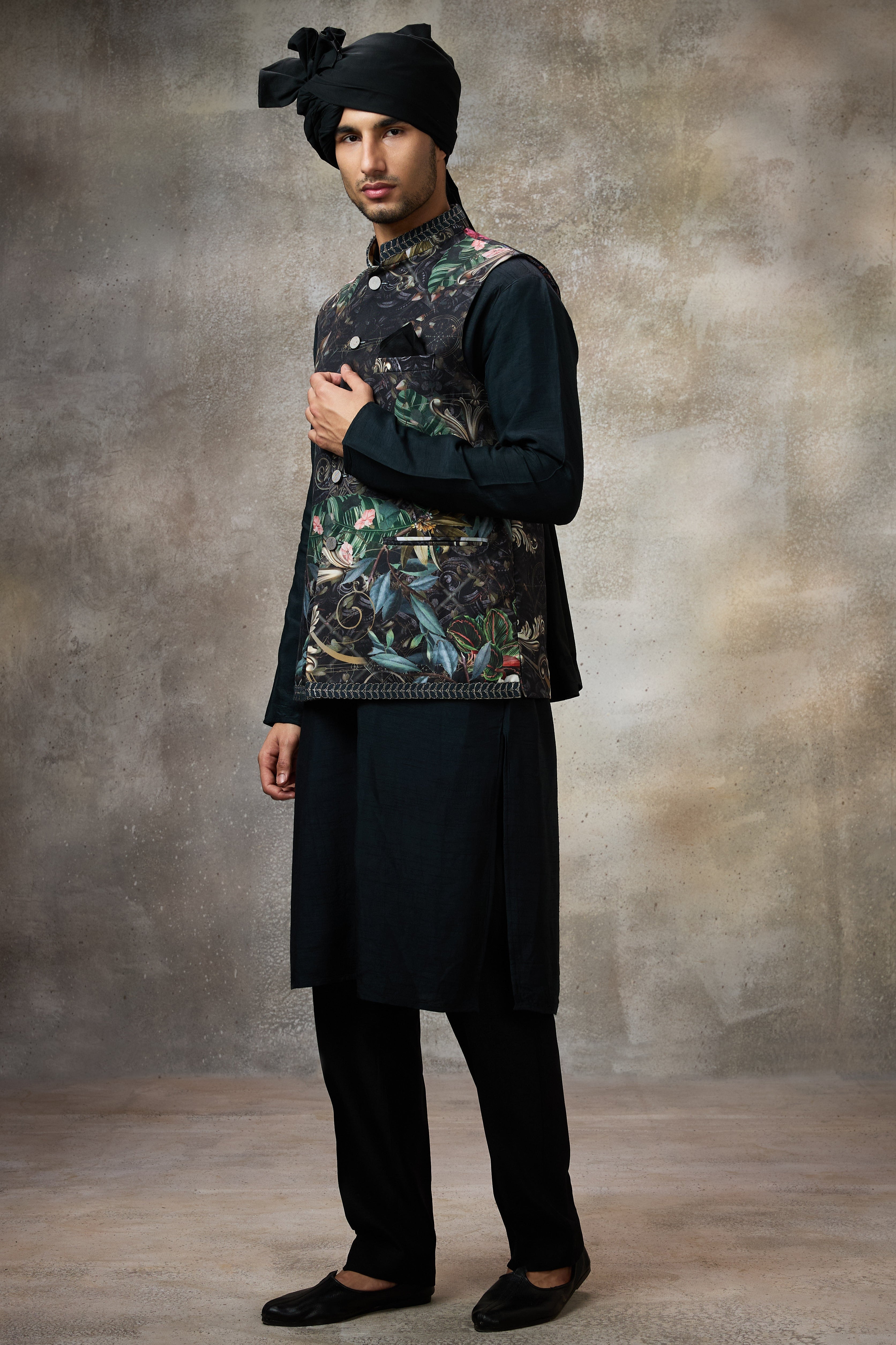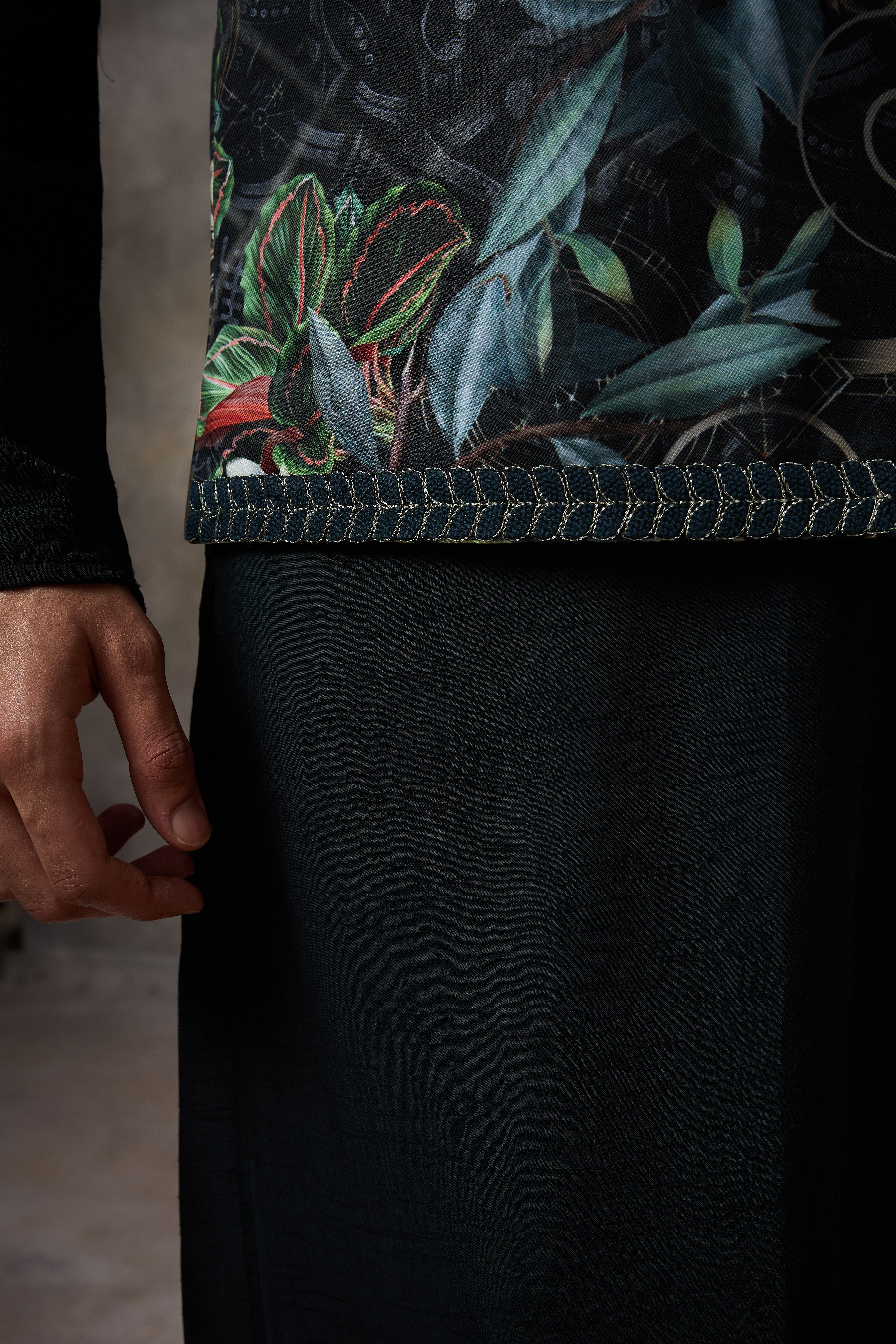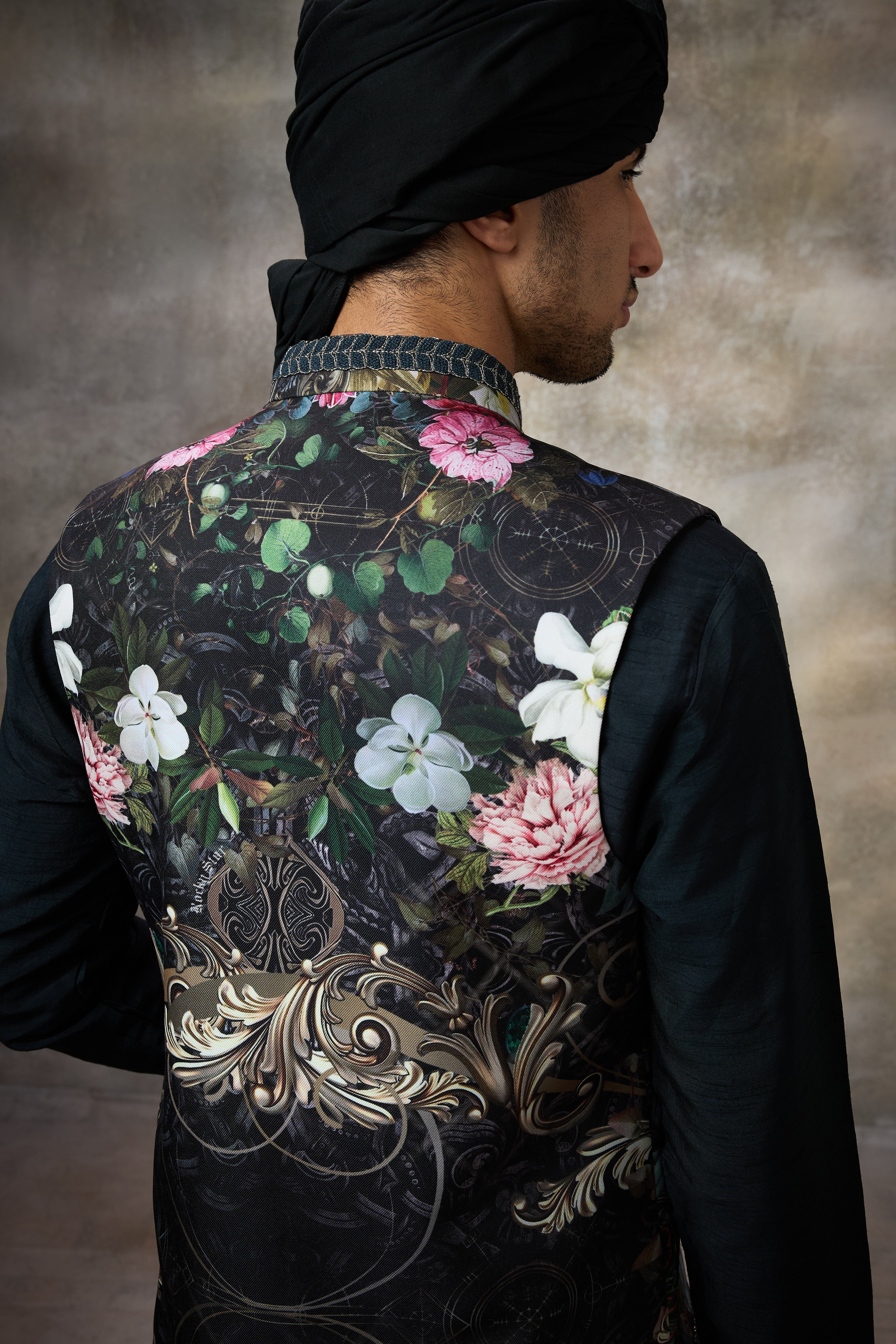 Classic with a twist, the Black Signature Koti Set combines elegance with bold details. The signature print adds depth and style to the all-black ensemble. Ideal for evening events or modern festive dressing. It's sleek, sharp, and versatile. A must-have for a refined, ethnic look.