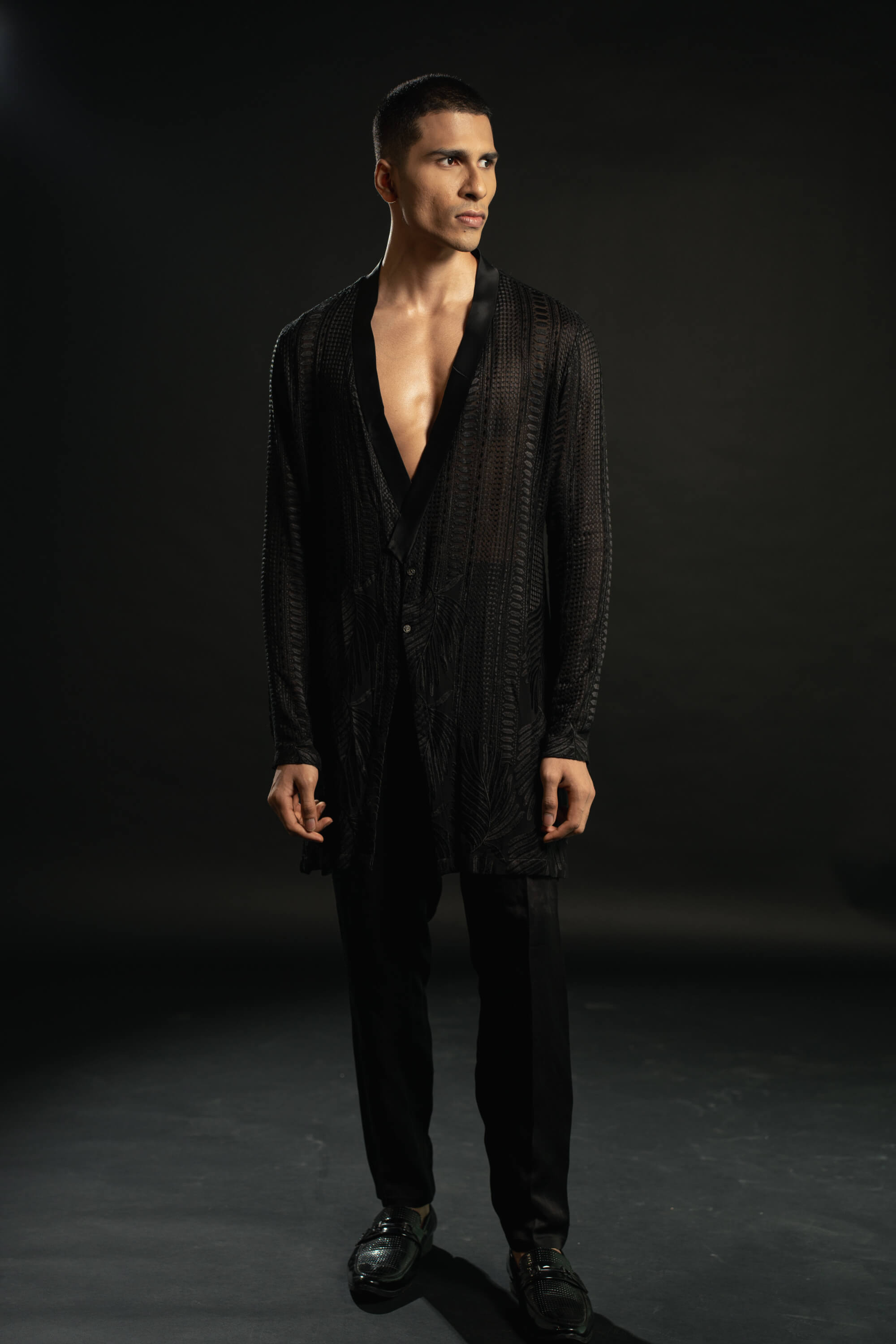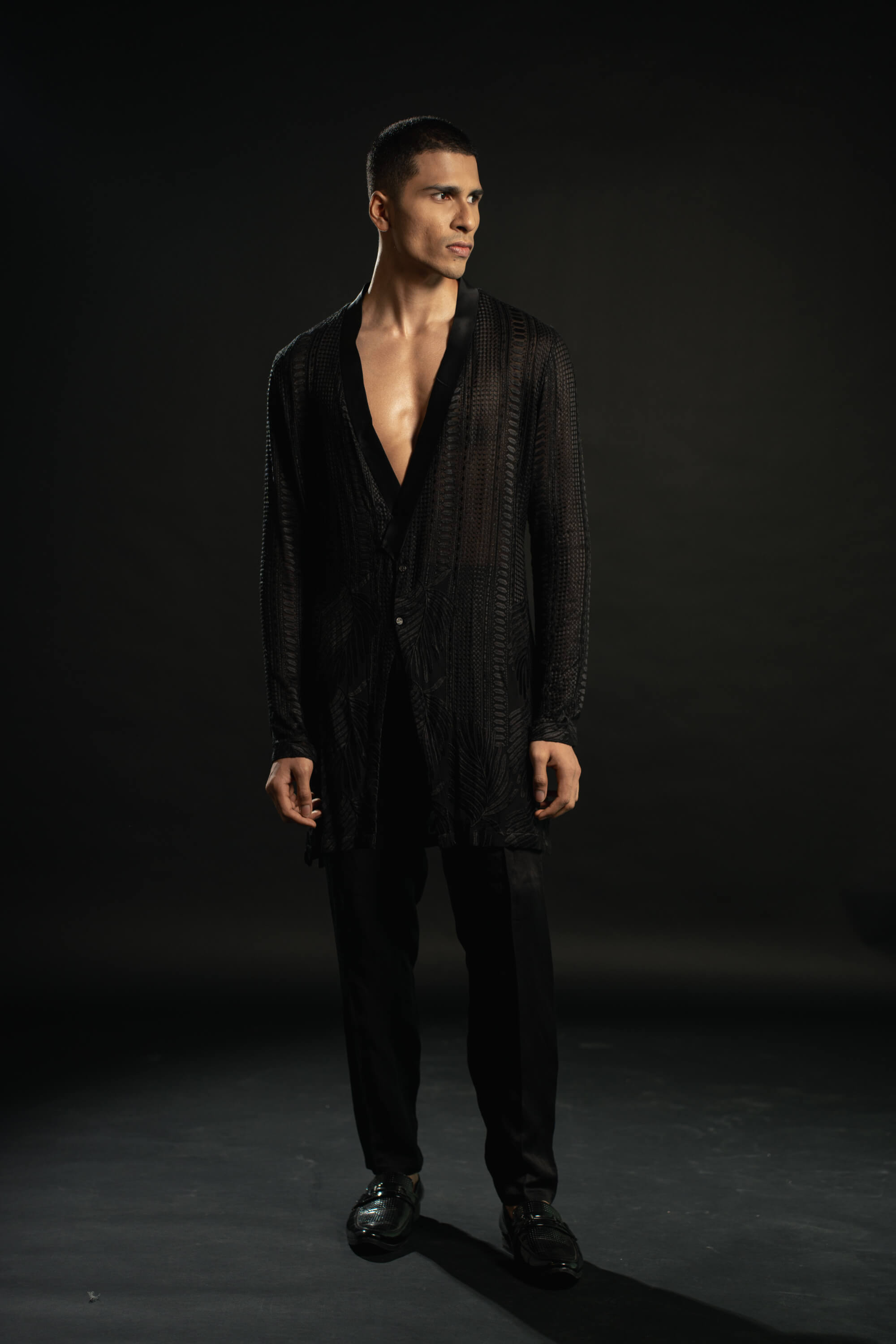 Crafted from luxurious georgette silk, this black kurta exudes effortless swagger with its low neckline and sleek pants, adding a contemporary edge. The sheer fabric enhances its elegance while embracing modernity, making it a standout statement piece for any occasion.
