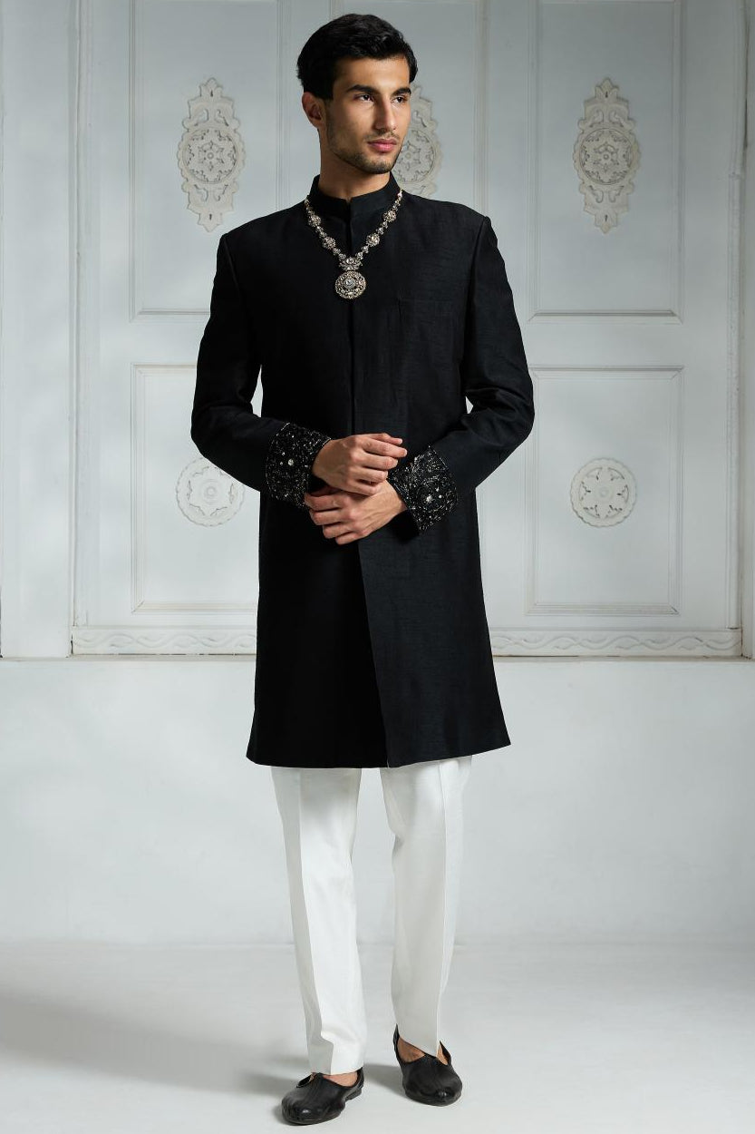 This black sherwani features a sleek high collar and a row of buttons down the front, offering a clean and classic silhouette. The cuffs are beautifully embellished with intricate black and silver embroidery, adding a touch of refined elegance. Paired with plain solid pants, it creates a timeless and sophisticated ensemble. Complete the look with a statement ring or bracelet—ideally featuring a gemstone that complements the sherwani’s dark palette—for an added element of luxury and style.