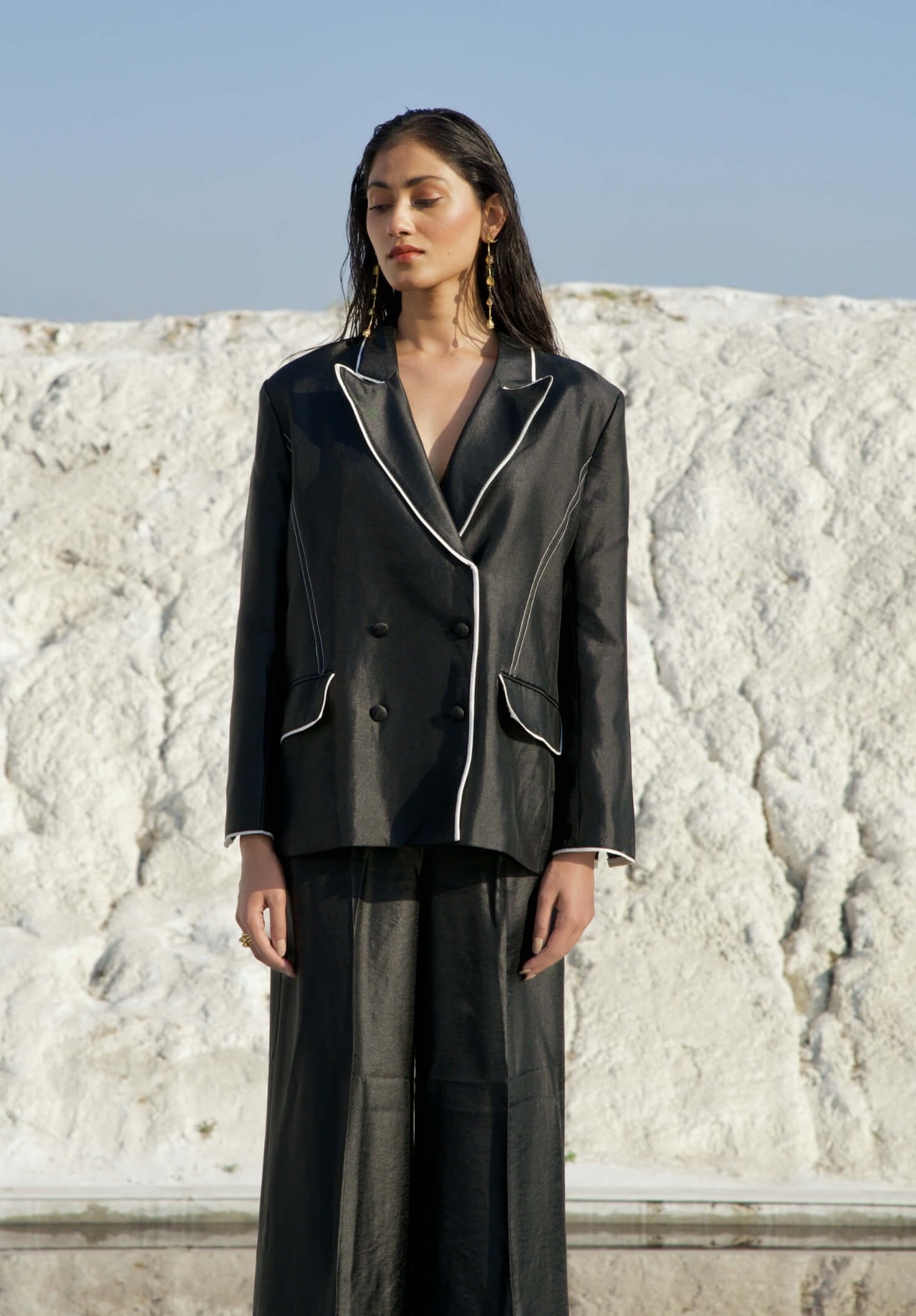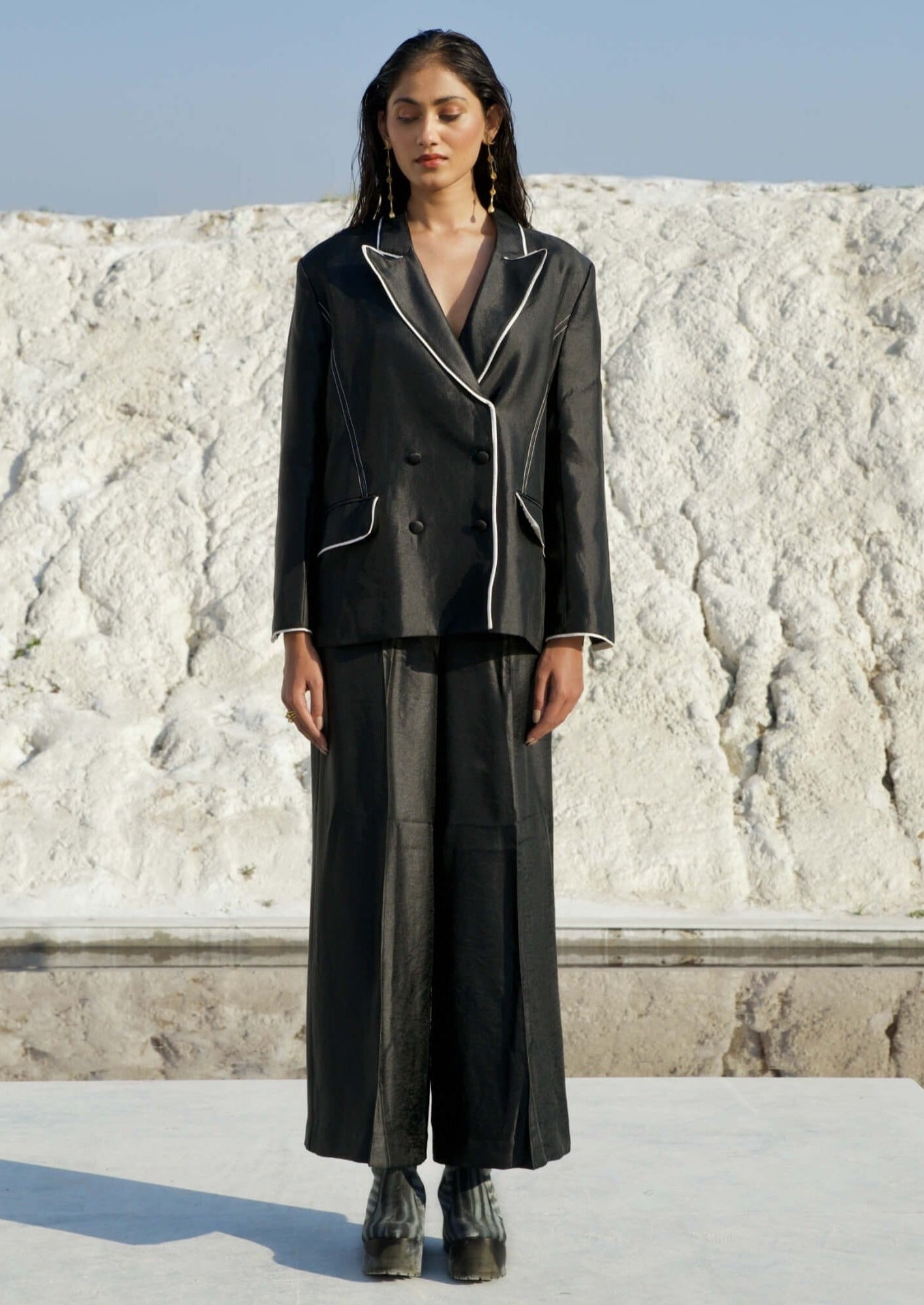 Introducing the 'Black Spade' co-ord set, crafted from fine silk satin handloom fabric for a luxurious feel. The double-breasted blazer features wide lapels and elegant covered buttons at the front, complemented by long sleeves with slit cuffs. It includes flap front pockets and straight-cut hems for a polished look.