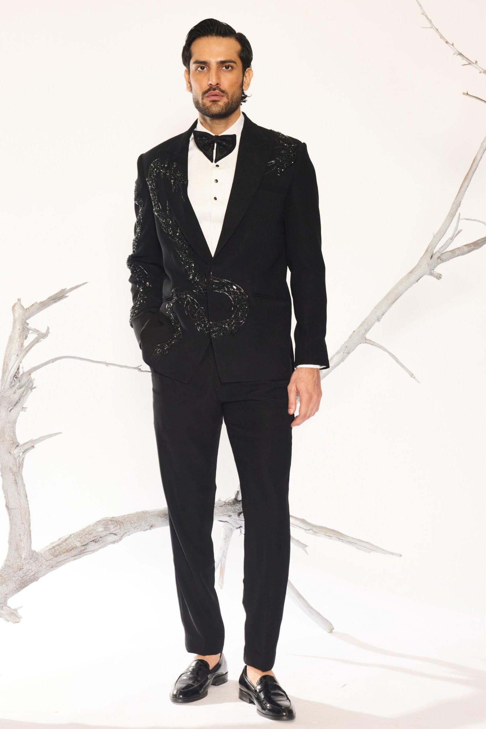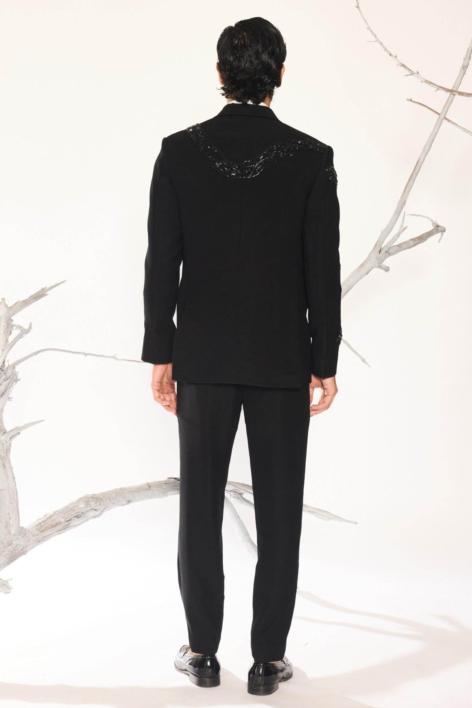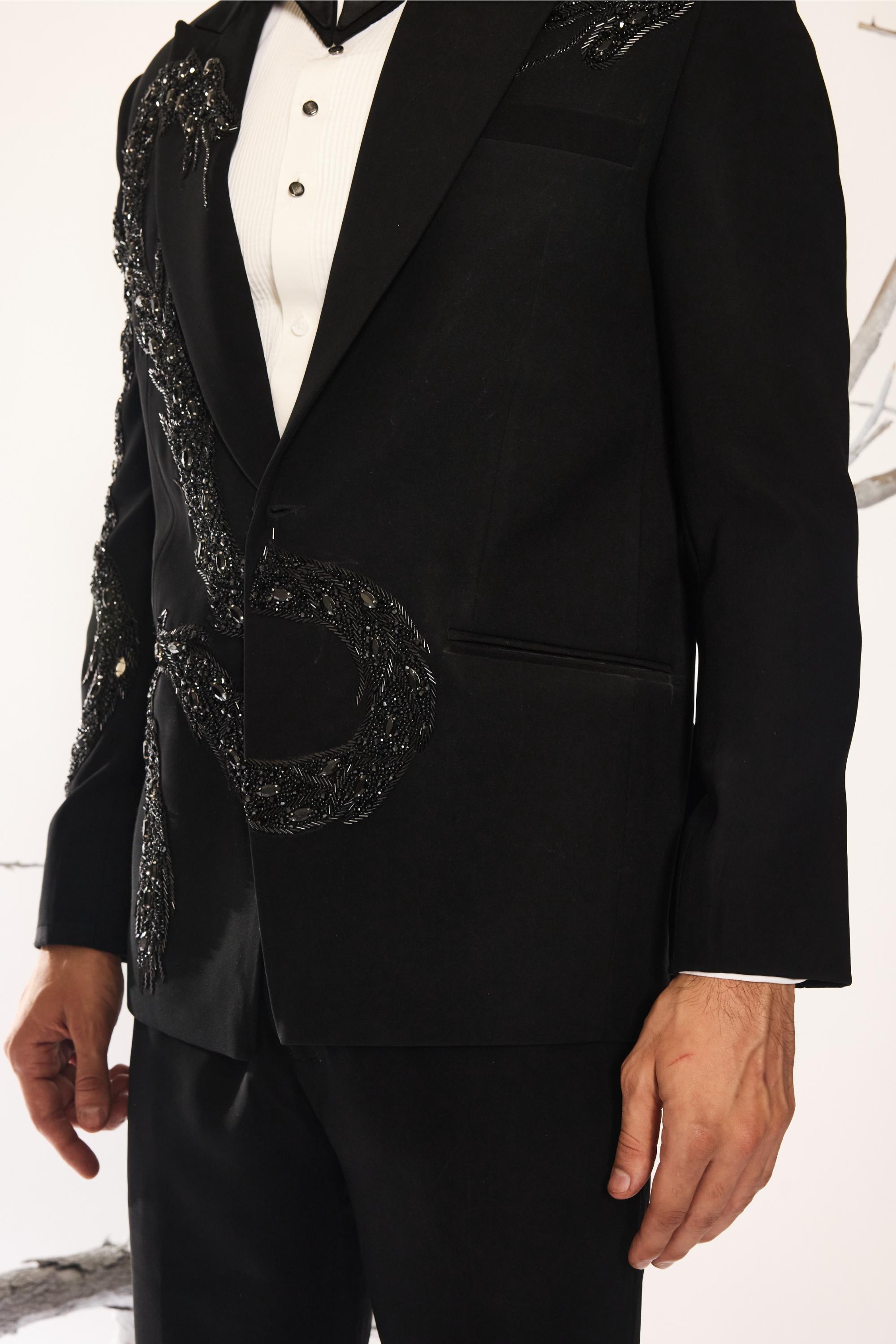 Step into a realm of illusion and light with the Black Stardust Astral Mirage Tuxedo—a masterpiece that blends cosmic surrealism with sharp sartorial edge. Cloaked in jet black and subtly dusted with astral shimmer, this tuxedo mirrors the mirage of distant galaxies and the quiet pull of the unknown. The silhouette is tailored to command, with clean lines and refined embellishments that glisten like scattered stardust. Ideal for receptions, red-carpet soirées, or midnight affairs, this piece is for the modern visionary—a man who dresses not just to impress, but to transcend.