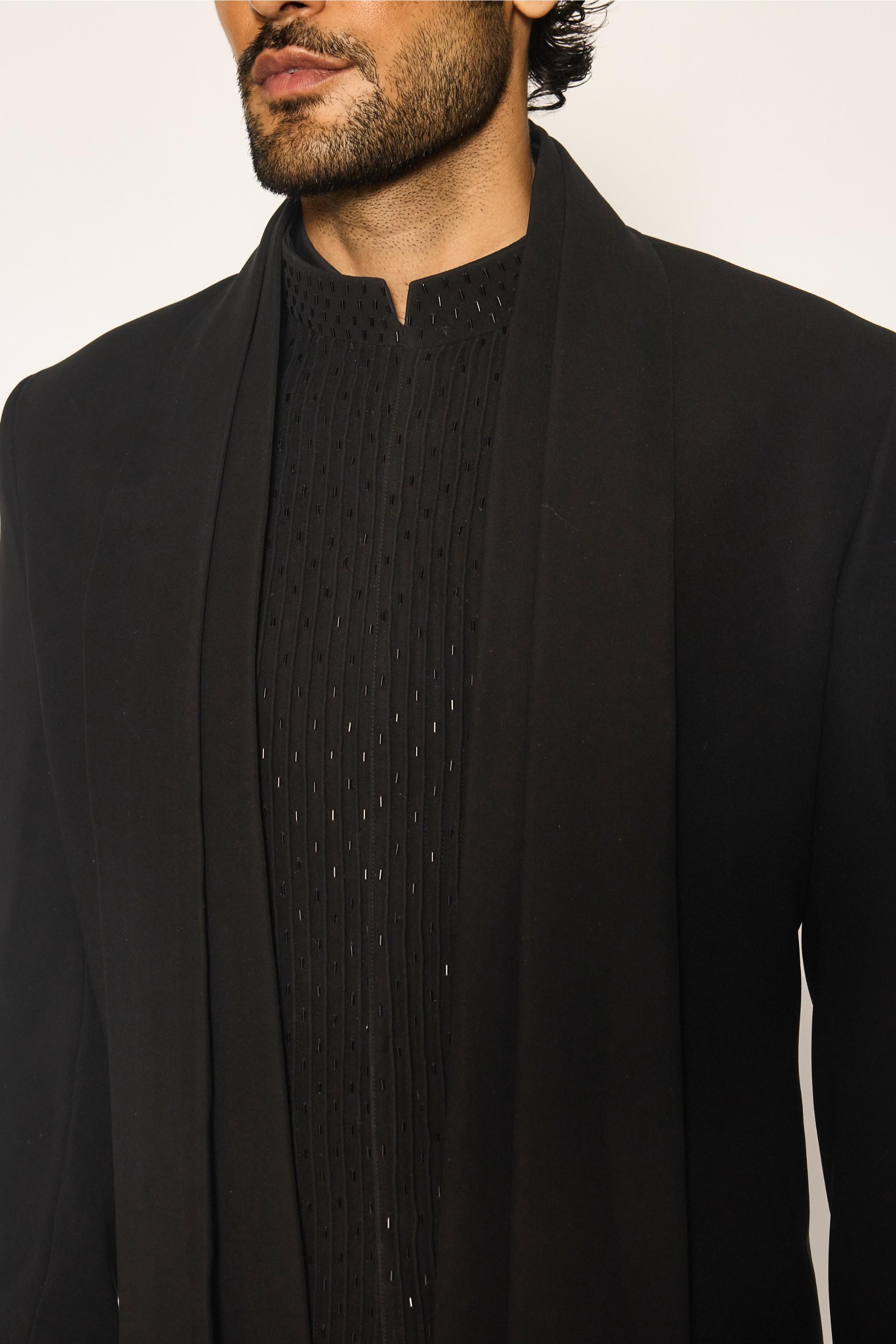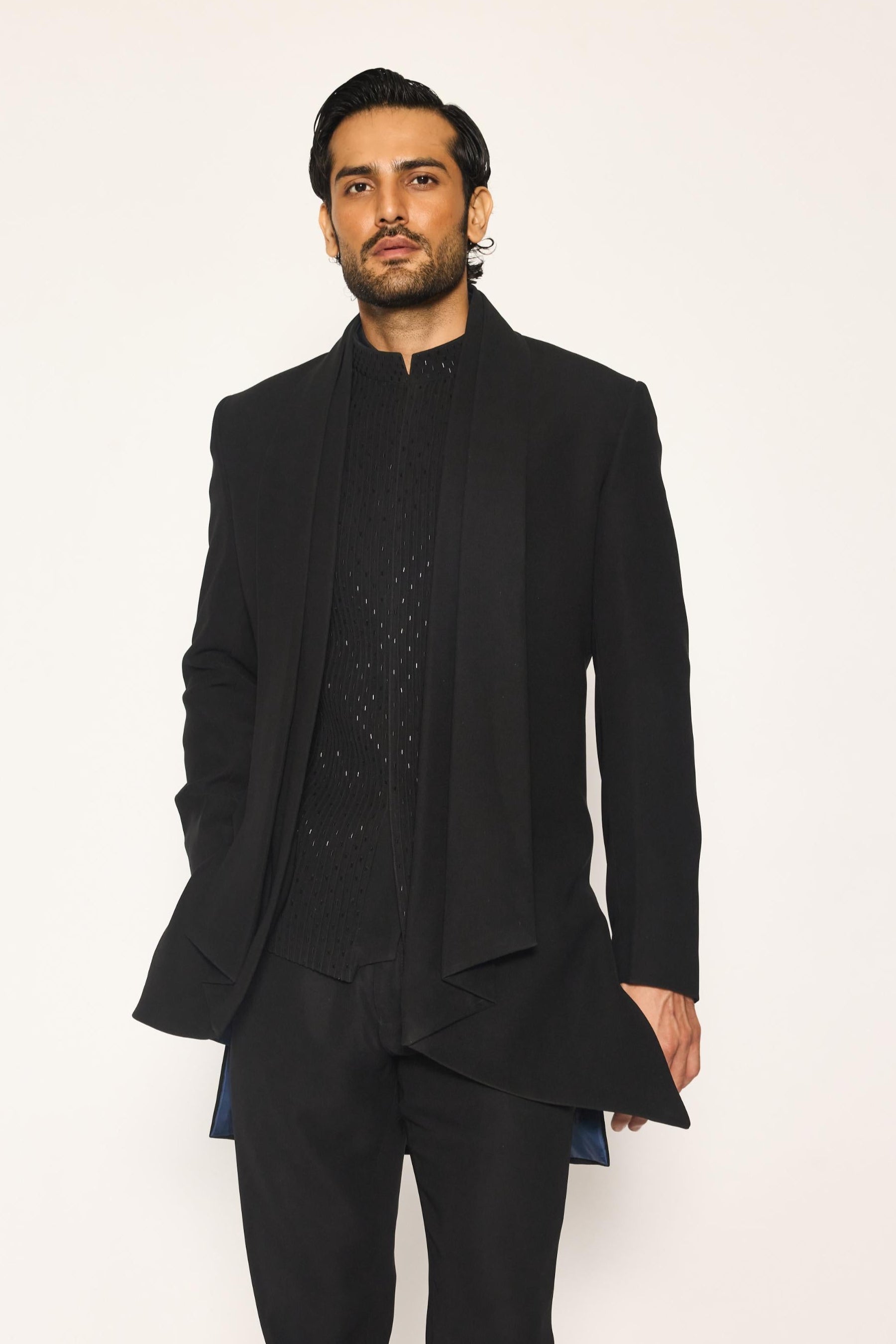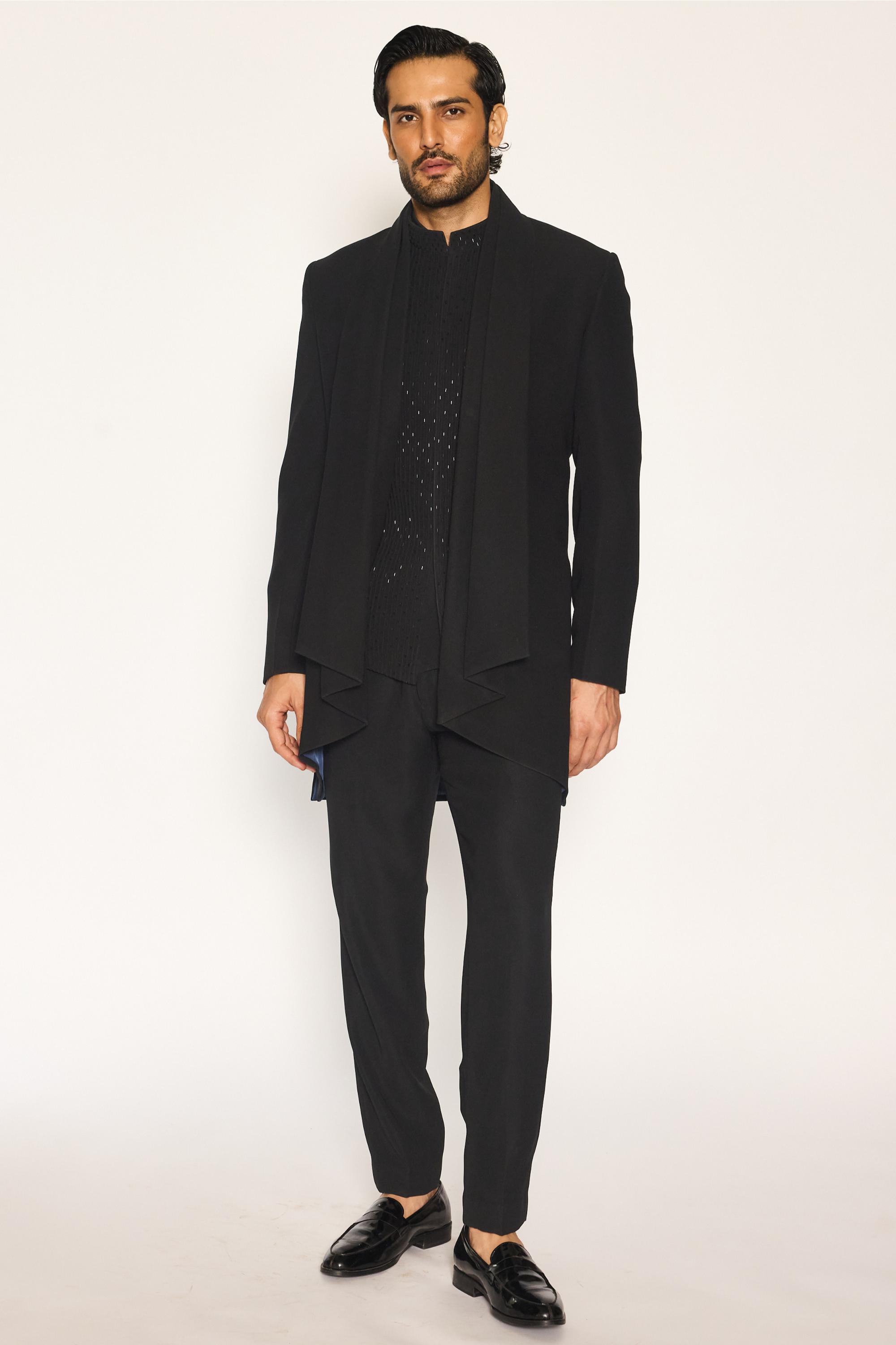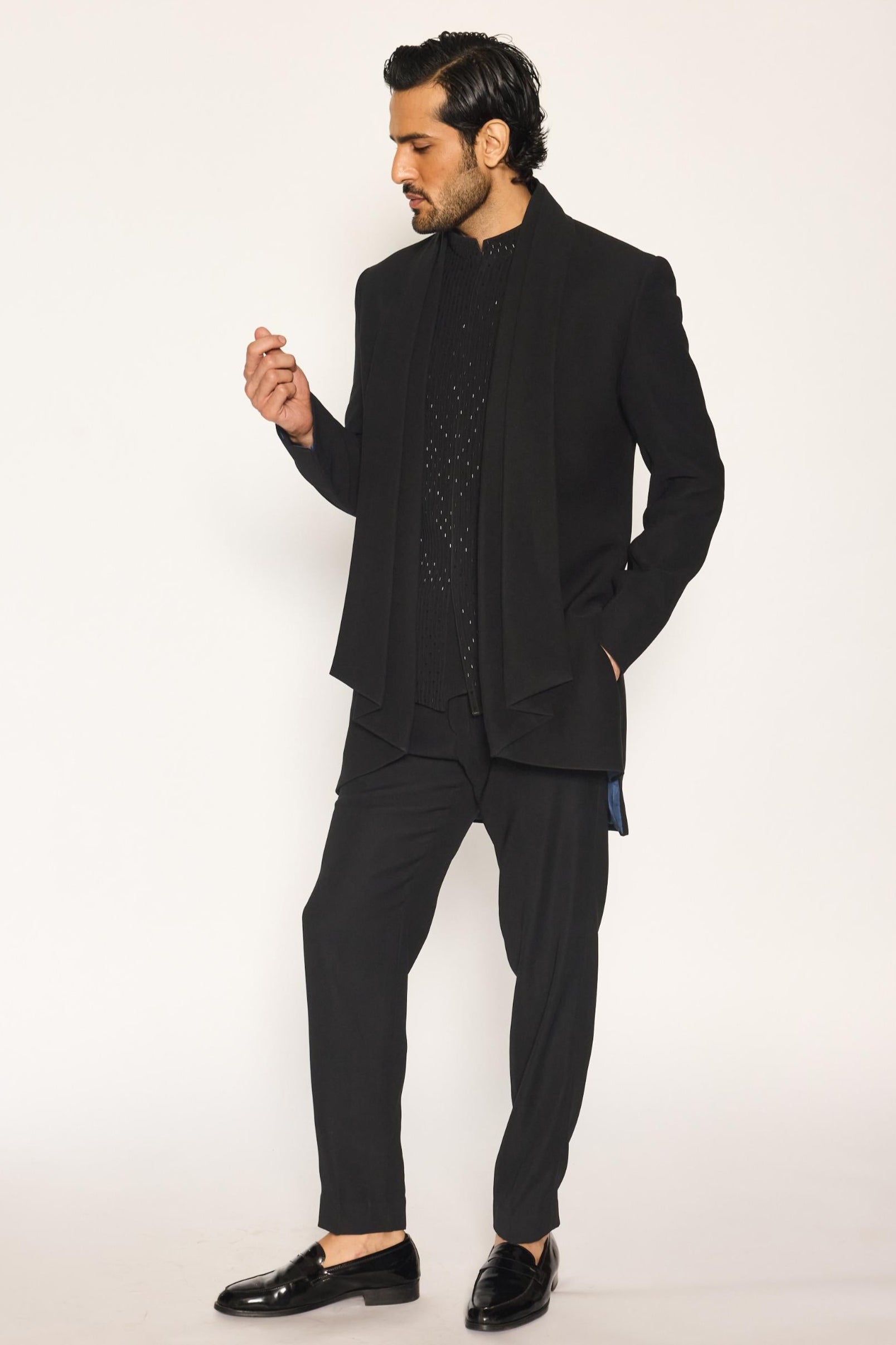 Components: 3 pieces (Draped outer jacket, inner pleated nehru jacket, trousers)