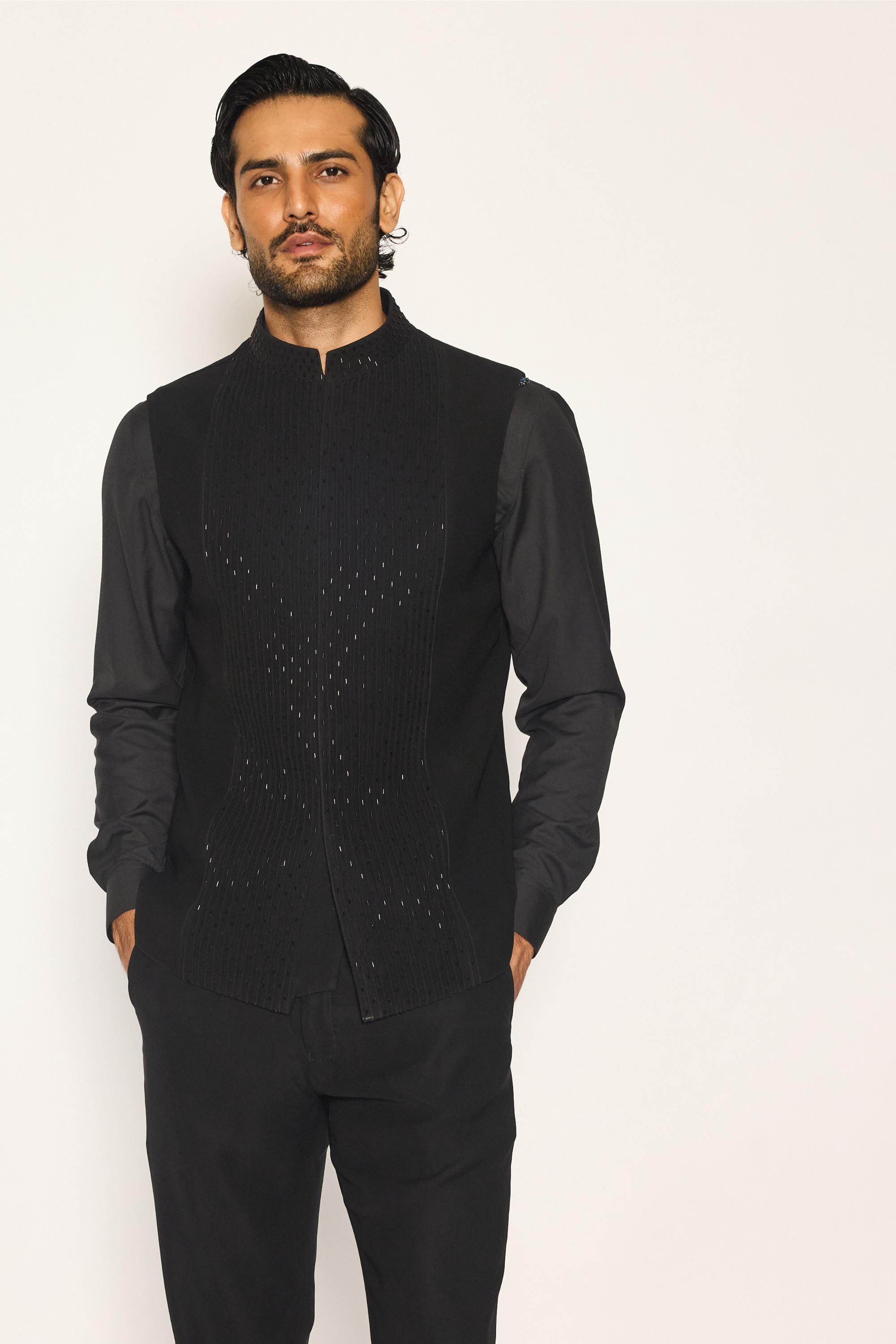 Bold. Mysterious. Unforgettable. The Black Stardust Onyx Line Indo Ensemble is where cosmic glamour meets structured sophistication. Inspired by the allure of midnight skies and the timeless depth of onyx, this Indo-Western creation is designed for the modern woman who commands attention with quiet strength. The deep black canvas is dusted with shimmering stardust-like accents, while the sleek silhouette offers a perfect balance of elegance and edge. Ideal for cocktail nights, festive evenings, or reception celebrations, this piece is a celebration of powerful femininity and refined fusion style.