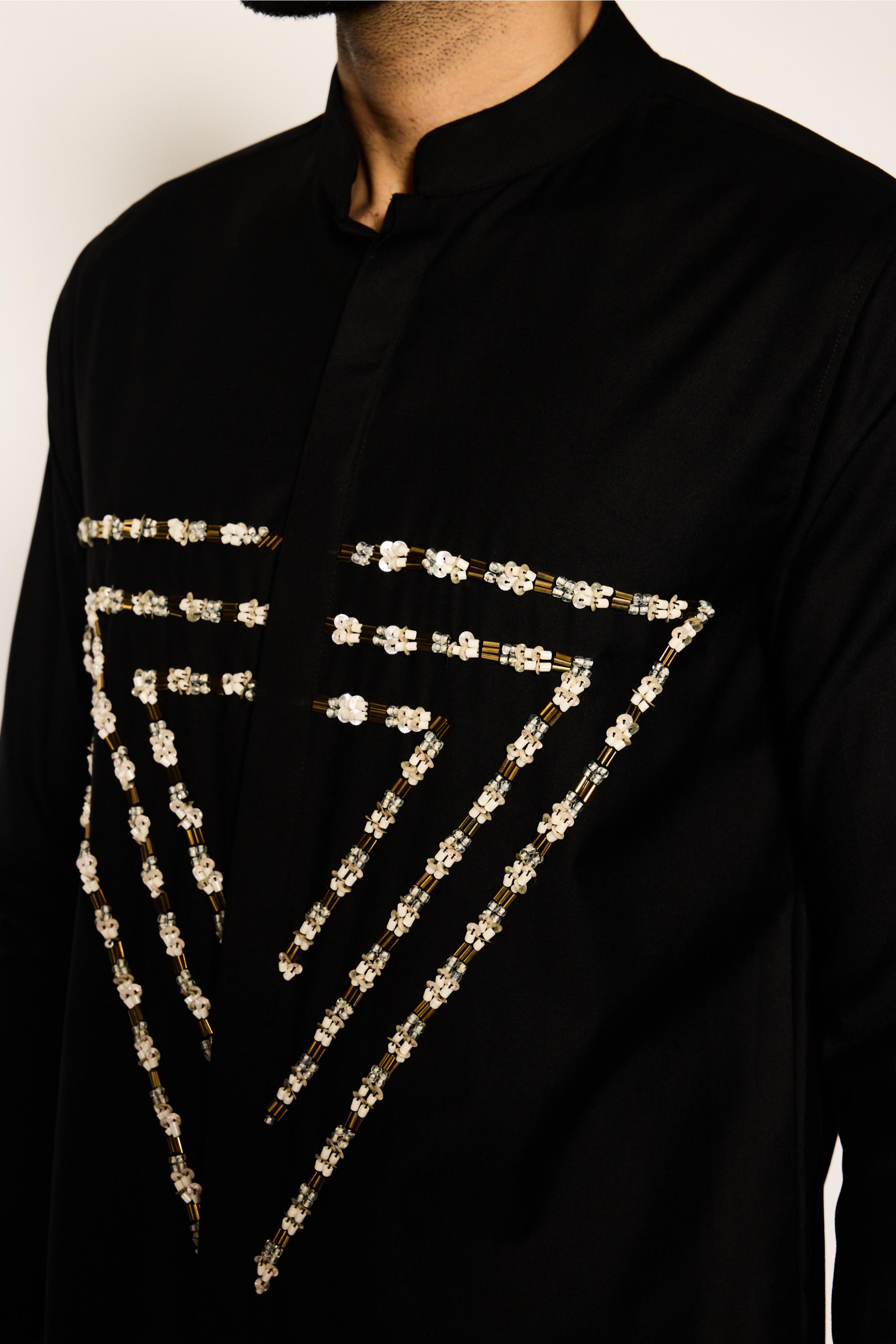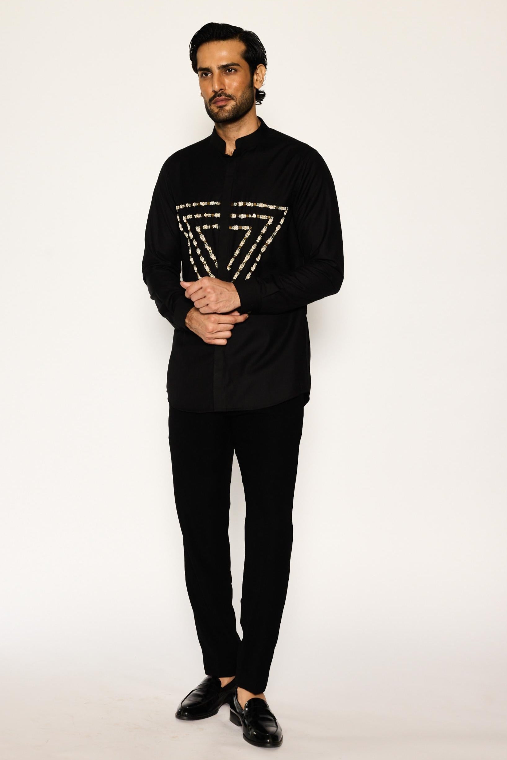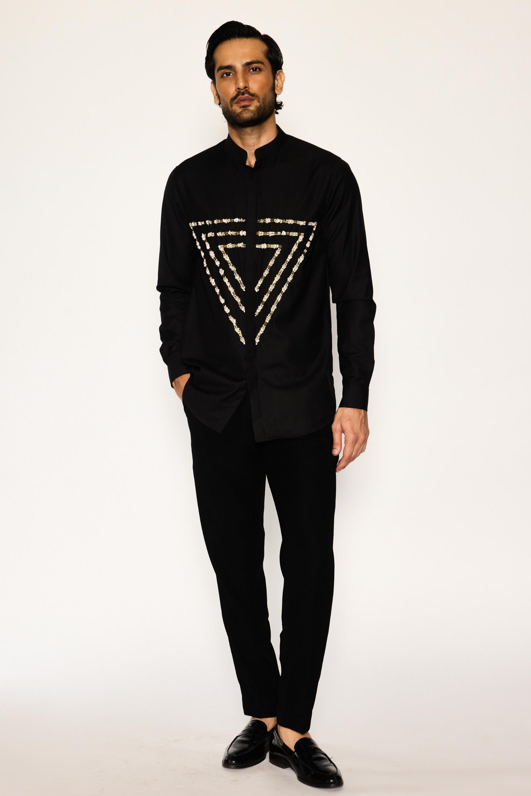 The Black Stardust Prism Path Axis Shirt exudes a futuristic charm with its shimmering prism-inspired detailing. Crafted from luxe fabric with a hint of iridescent sheen, it plays with light and movement, making it perfect for night events or high-concept fashion statements. The structured silhouette ensures a sharp profile, while the graphic pattern adds bold visual intrigue. Ideal for those who command attention without saying a word.