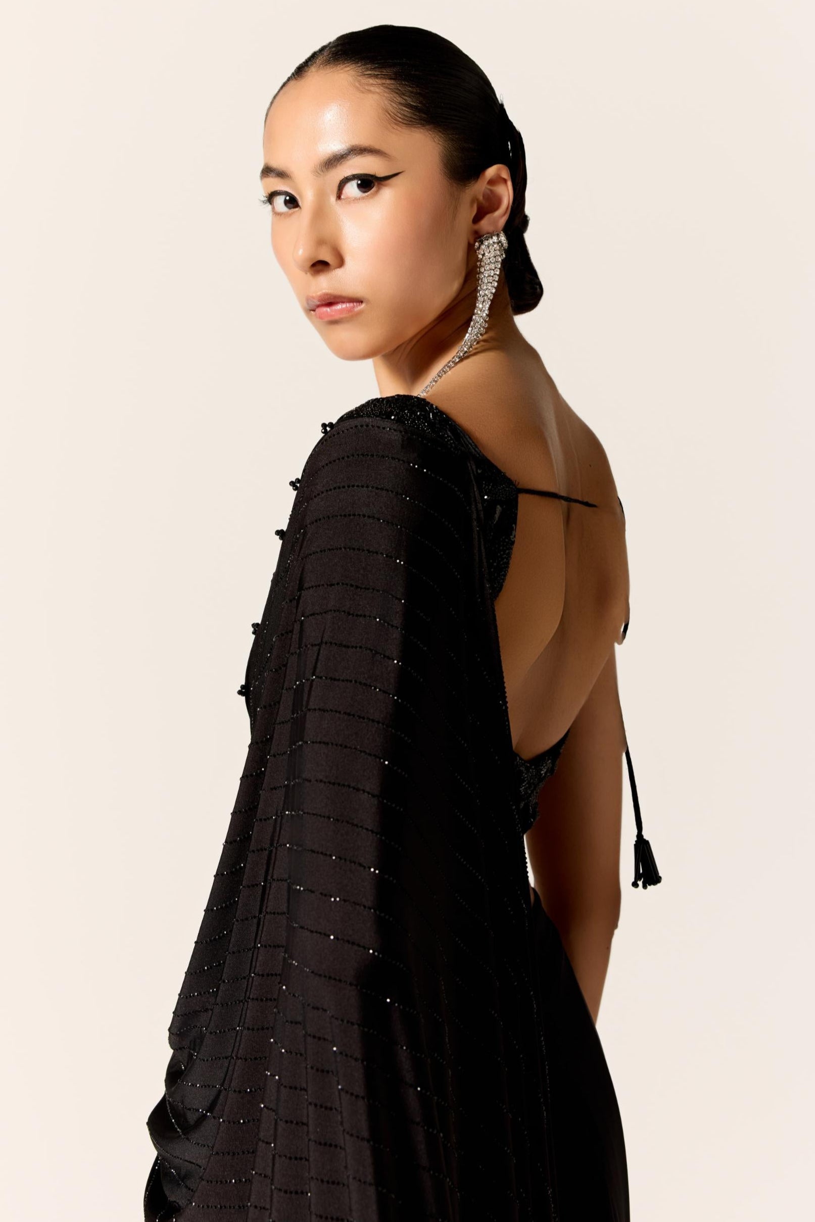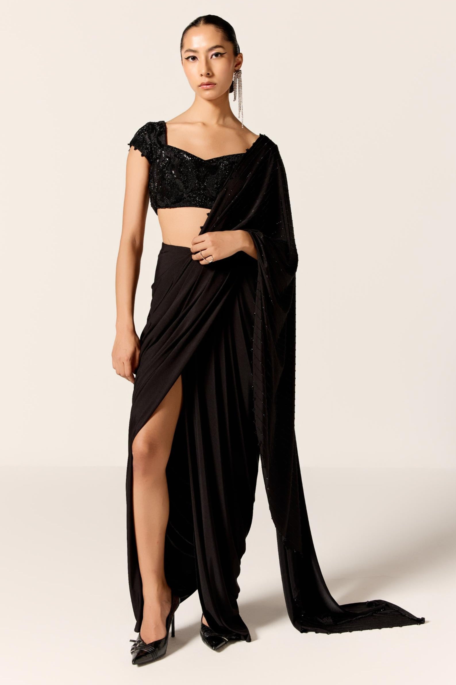 The Black Suha Eminence Saree is a timeless masterpiece that embodies grace and bold sophistication. Draped in a rich black hue, it features subtle embellishments or textures that add depth without overpowering its elegance. The fluid drape and refined detailing make it ideal for evening events, receptions, or formal gatherings. Modern yet rooted in tradition, it's a saree that speaks with quiet confidence. A true symbol of classic glamour.