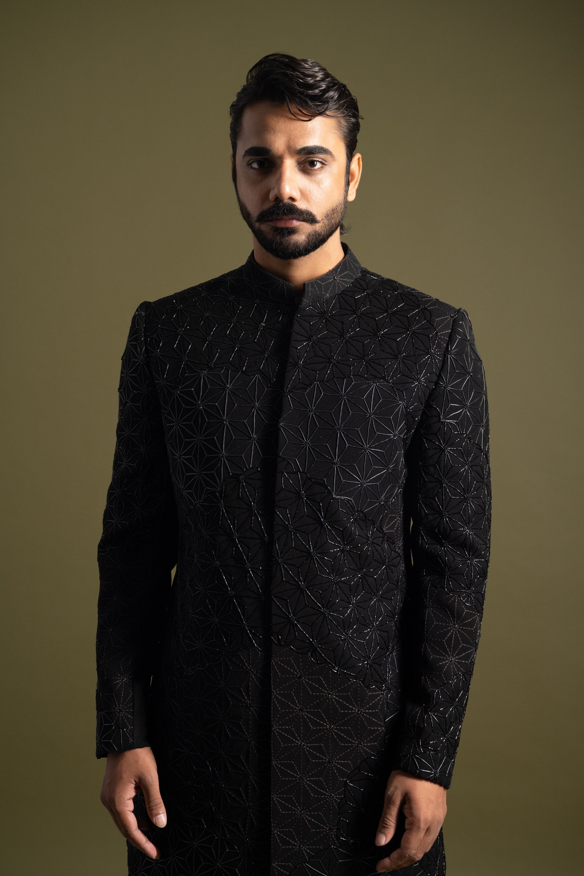 Discover the ultimate in luxury with our black suiting fabric achkan, meticulously designed with floral-geometric patterns. This striking piece features intricate leather cord detailing, complemented by elegant thread and cutdana embroidery that creates a rich, textured look. The achkan is paired with slim fit pants, offering a modern and tailored silhouette that enhances its classic charm. Perfect for formal occasions and high-profile events, this ensemble blends traditional craftsmanship with contemporary style.