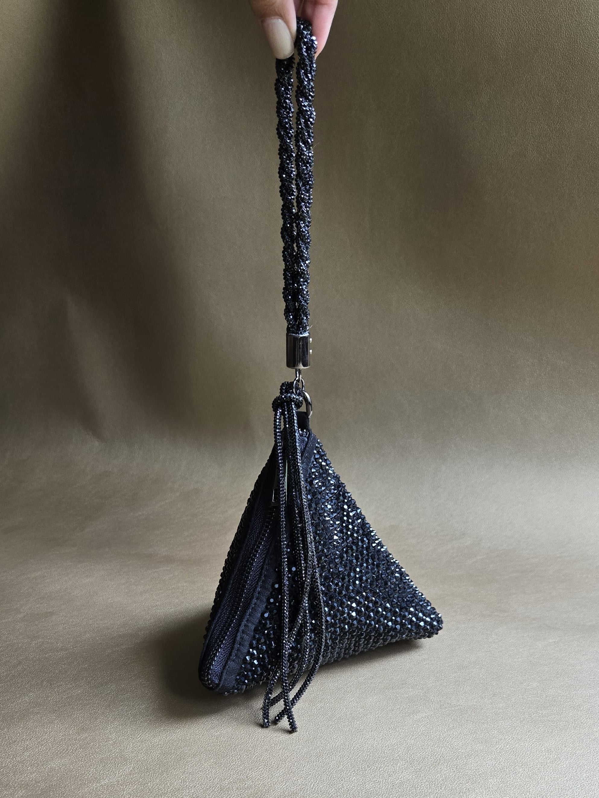 A bold mini pyramid bag inspired by India's vibrant capital! Embroidered with shimmering Swarovski crystals and featuring a striking rhinestone strap, this dazzling accessory is made for the fearless fashionista. Whether you're heading to a party, a gala, or a festive celebration, this statement piece ensures you shine bright and stand out in style!