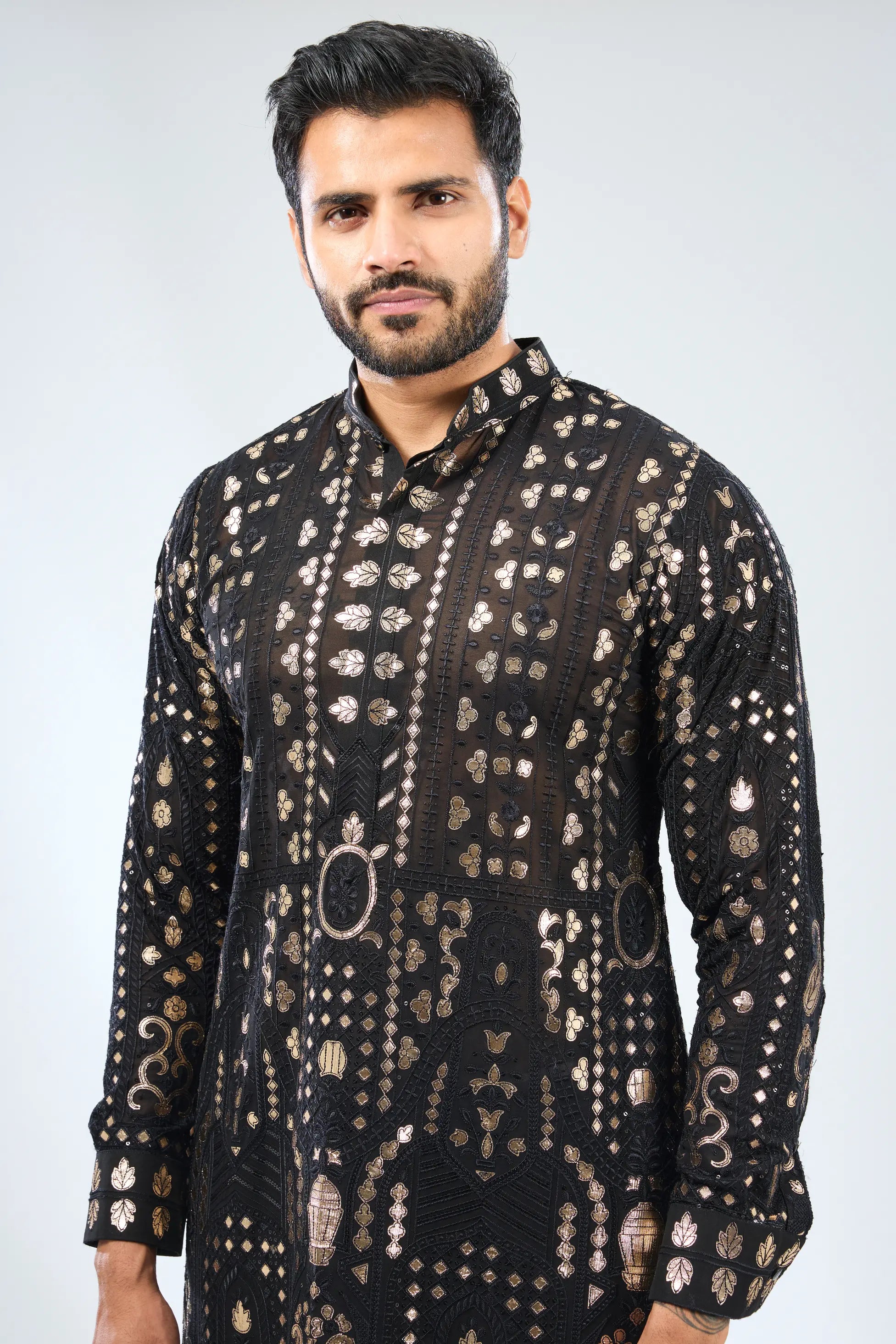 Embrace elegance with our black thread and gota work kurta, featuring intricate embroidery that adds a touch of sophistication. Paired with comfortable cotton silk pants, this ensemble is perfect for festive occasions and stylish gatherings. Experience the perfect fusion of traditional craftsmanship and contemporary design, making it a must-have addition to your ethnic wardrobe.