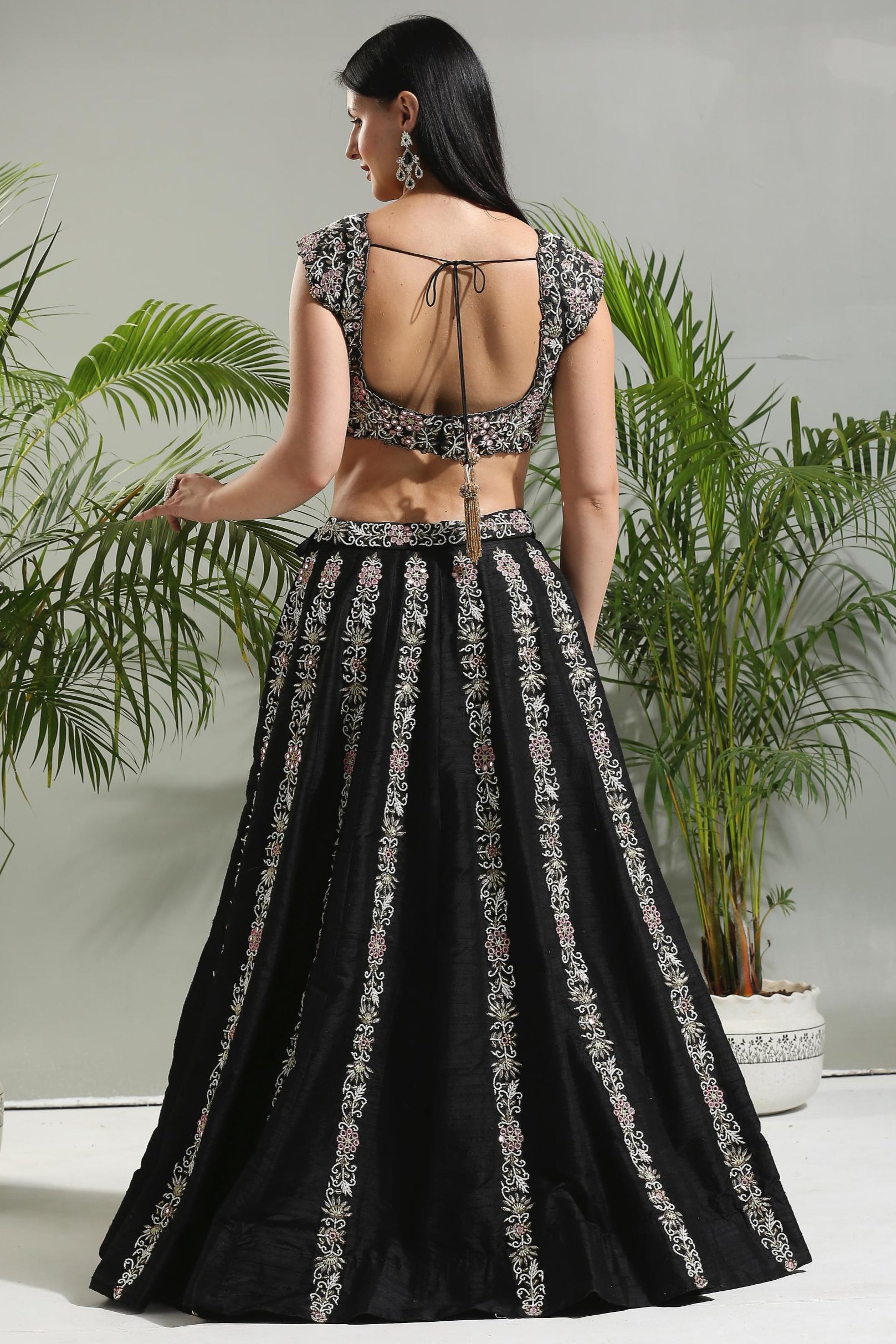 Black thread and mirror hand embroidered sunset bloom lehenga set