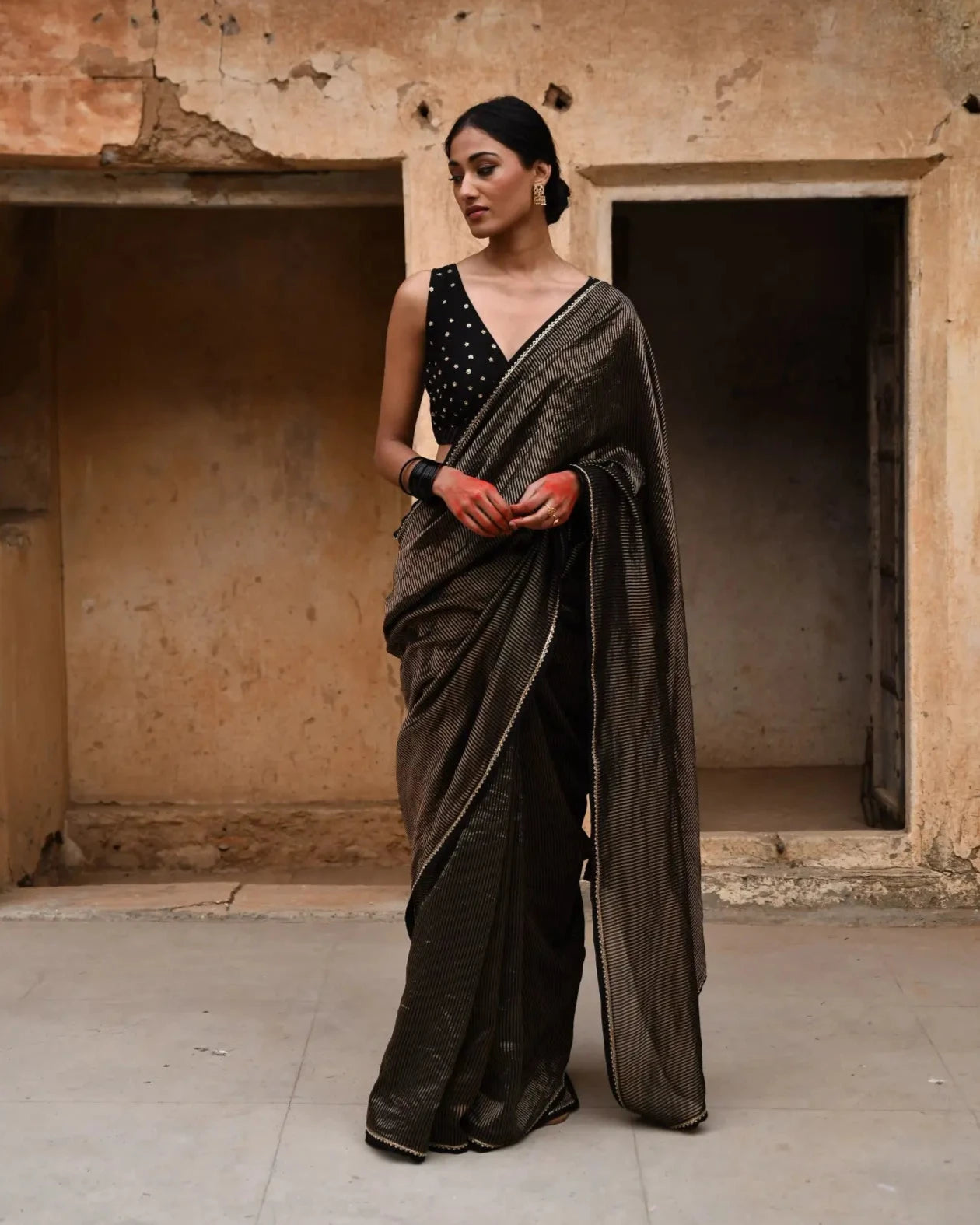 This elegant black tissue striped saree features stunning hand-embroidered triangles in zardosi along the border, adding a sophisticated and artistic touch to its design. The lightweight fabric drapes beautifully, creating a graceful silhouette that enhances your style. Paired with a blouse adorned with delicate gana se halka phool boota embroidery in zari and zardosi, this ensemble perfectly balances traditional craftsmanship with contemporary flair. Ideal for festive occasions or special events, this saree is a timeless addition to any wardrobe, ensuring you make a lasting impression.