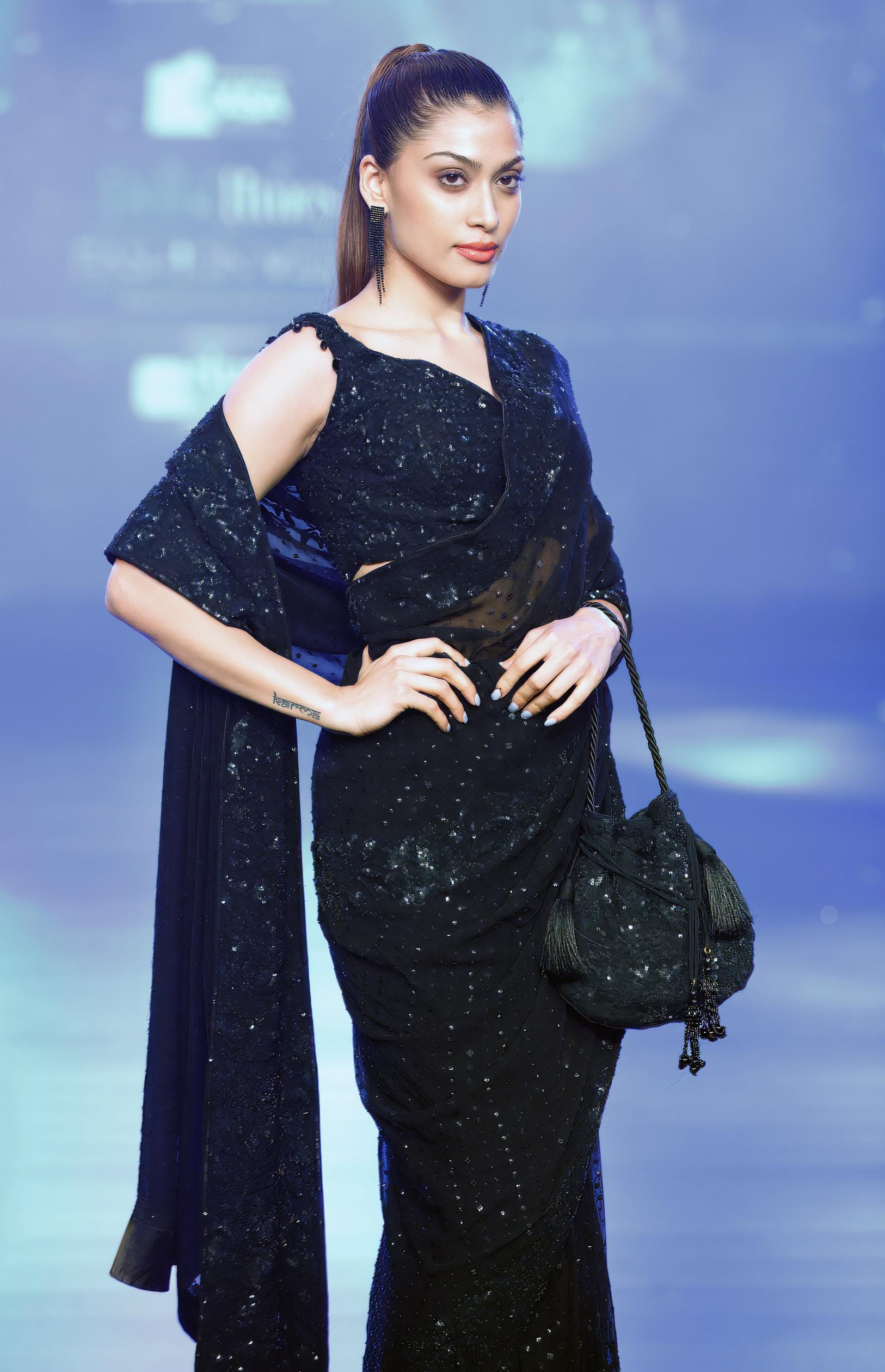 The Black Georgette Mumtaz Tonal Work Saree Set is a perfect fusion of timeless elegance and modern sophistication. The saree features intricate Mumtaz tonal embroidery, adding subtle depth and texture to the flowing black georgette fabric. The rich, detailed work creates an elegant, understated glamour, making it ideal for formal events, weddings, or special occasions. Paired with a matching blouse, this saree offers a refined, luxurious silhouette that effortlessly combines tradition with contemporary charm.