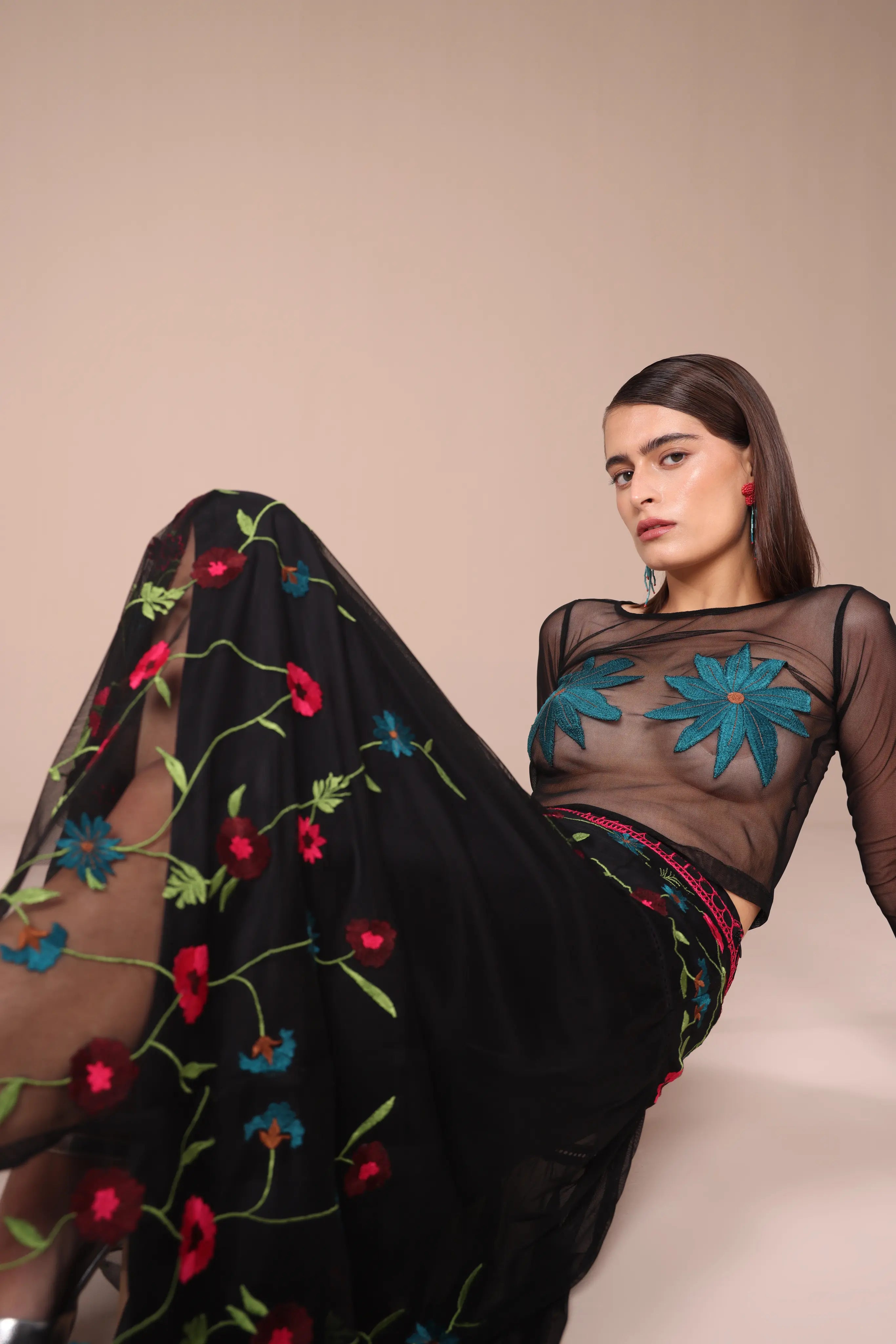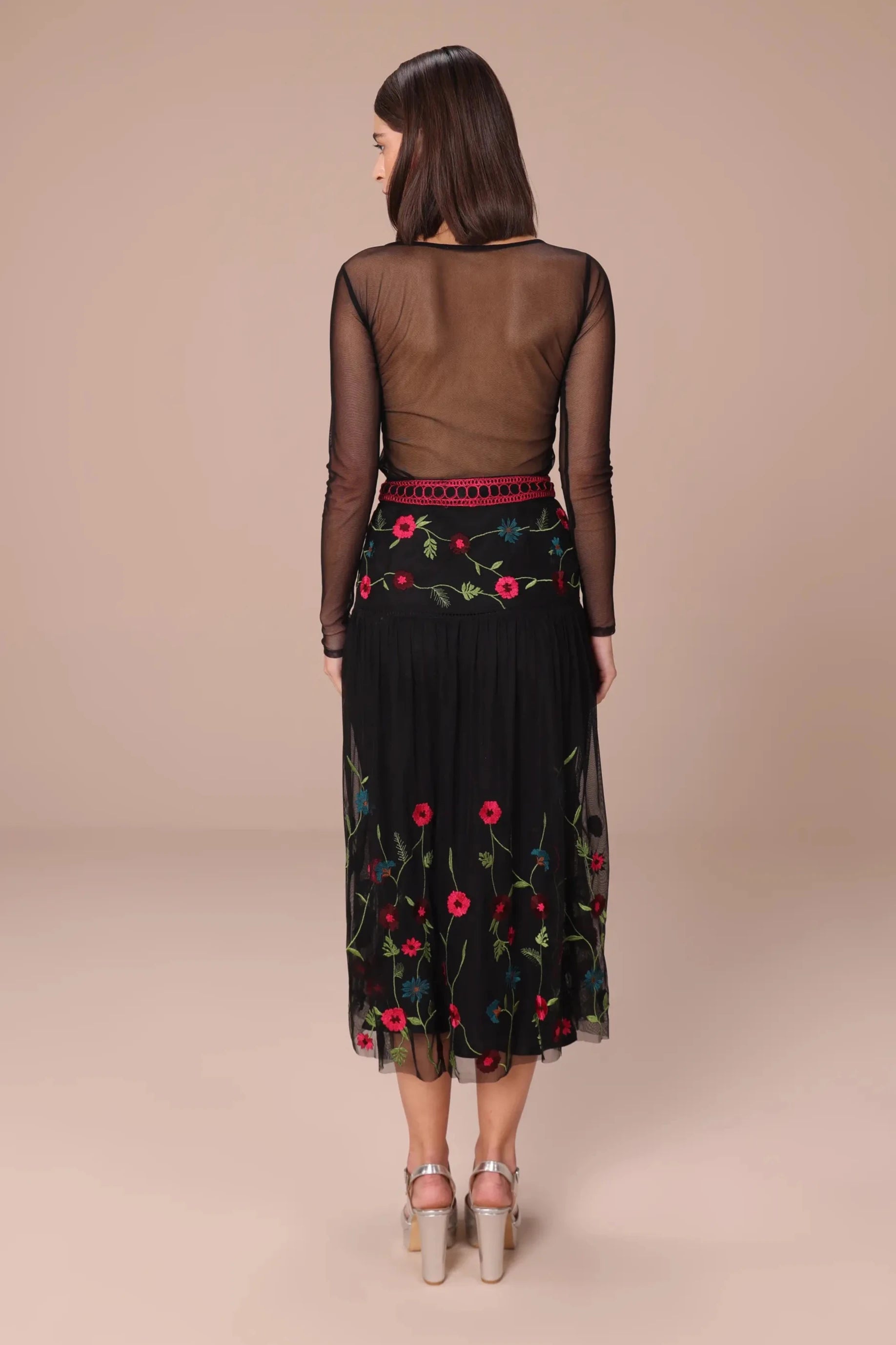 The Black with Multicolor Embroidery Midi Skirt combines the timeless appeal of black with vibrant multicolor embroidery for a stunning, eye-catching look. Featuring intricate floral or geometric patterns, this midi skirt offers a flattering, versatile silhouette that can be dressed up or down for any occasion. The bold embroidery adds texture and depth, making it a statement piece for both casual outings and special events. Elevate your wardrobe with this beautifully designed skirt, perfect for adding a pop of color to any ensemble.