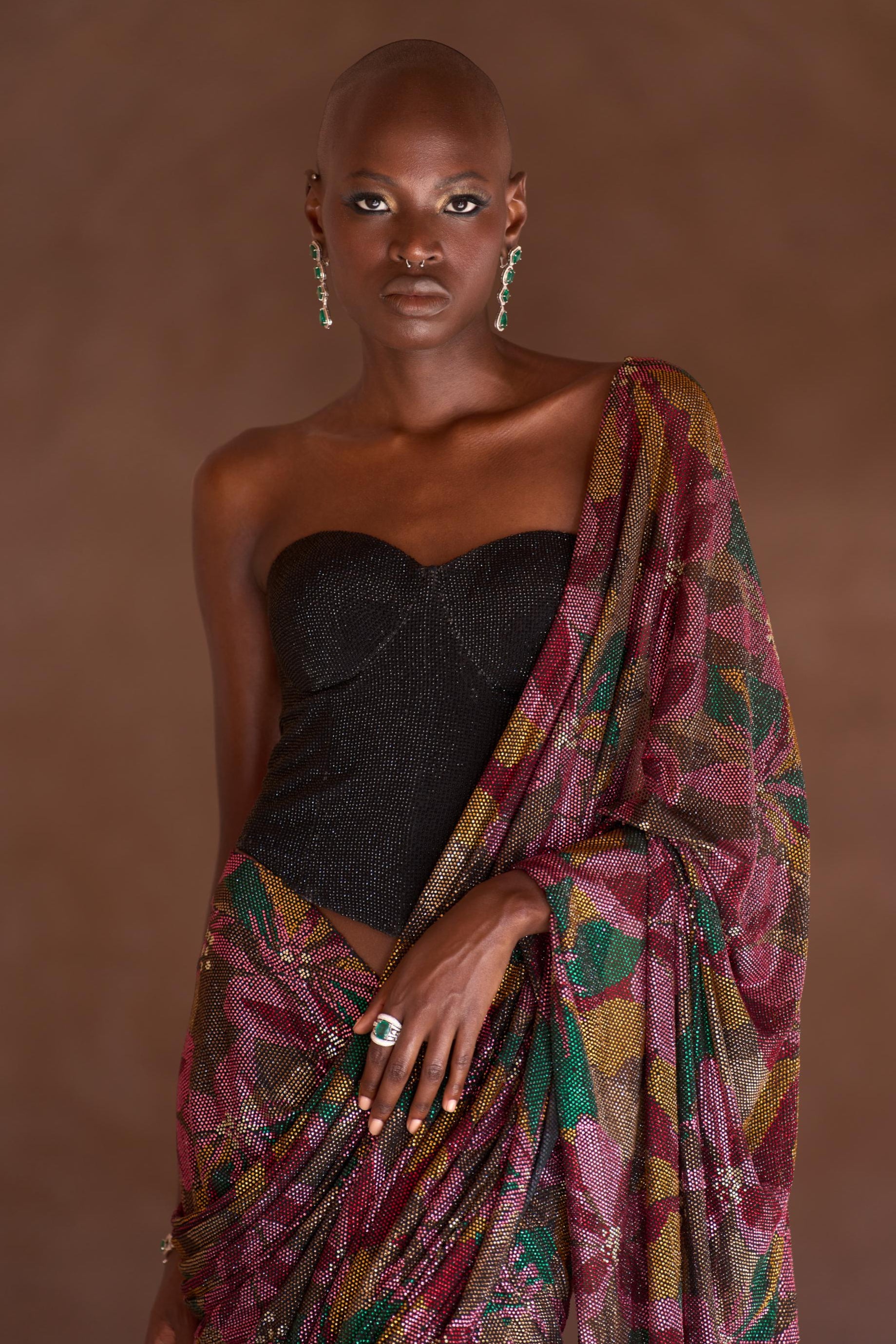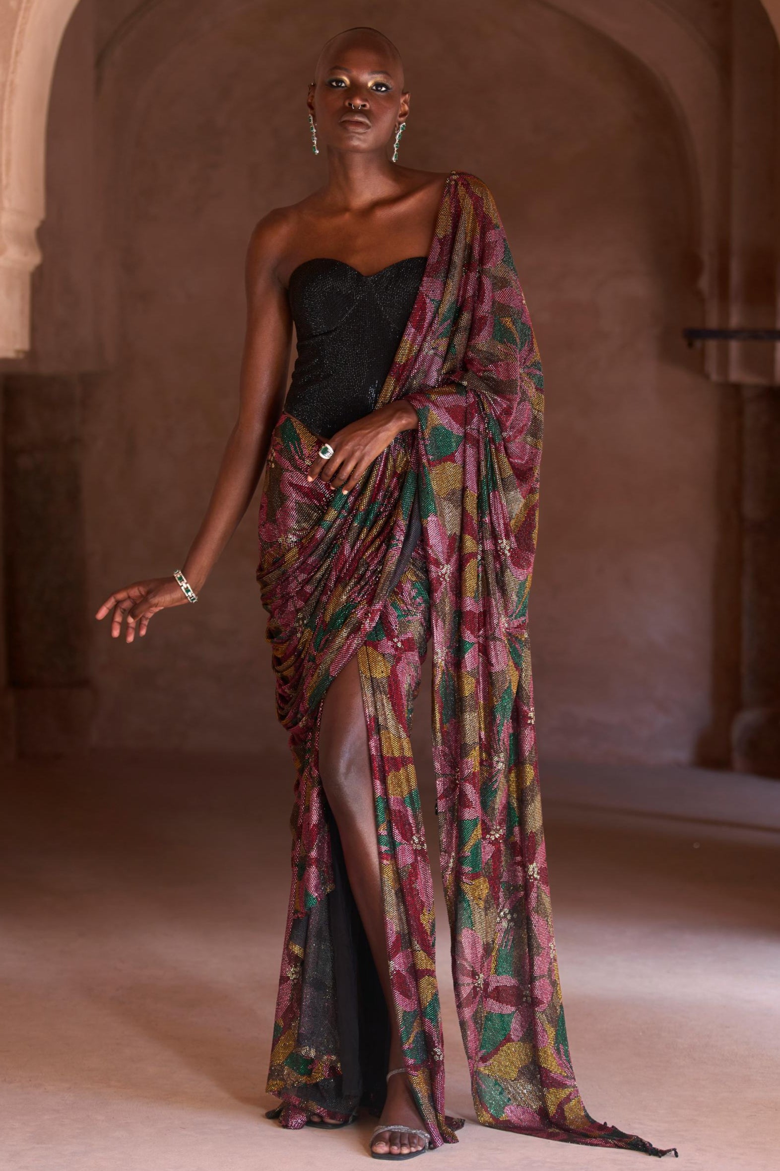 Step into sophisticated glamour with the Black Yasmeen Seher Corset Saree Set. The deep black hue creates a timeless elegant look while the corset detailing adds a modern flattering structure to the classic saree silhouette. Crafted from luxurious fabric this set effortlessly blends tradition with contemporary design making it perfect for festive occasions cultural events or glamorous evening affairs. The Black Yasmeen Seher Corset Saree Set is designed for those who love to make a bold statement with refined style.