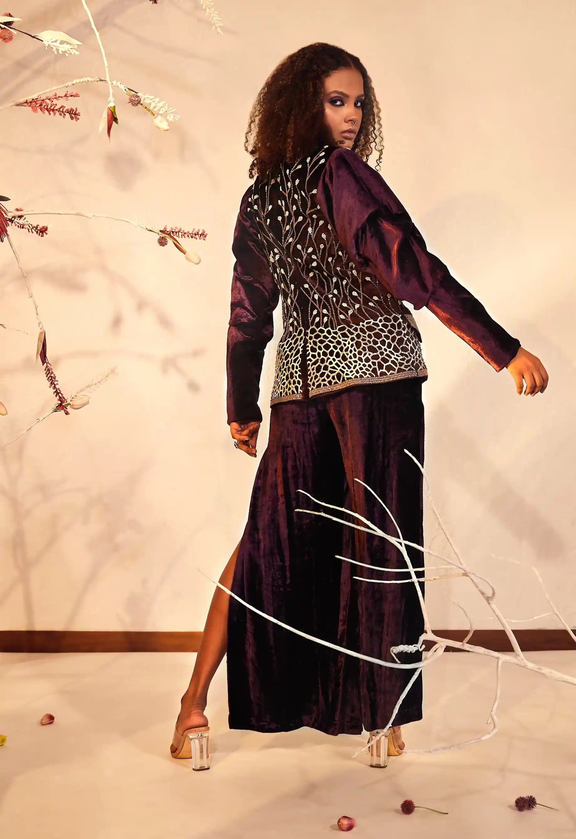 Elevate your style with this stunning blackberry wine blazer set, featuring a plunging lapel and dramatic gigot sleeves that create a striking silhouette. Adorned with exquisite floral hand embroidery, this piece showcases intricate fine thread work, delicate French knots, and shimmering crystals for a touch of opulence. The set is beautifully completed with luxurious velvet silk pants, combining comfort and sophistication. Perfect for upscale events or special occasions, this ensemble ensures you make a bold and unforgettable statement.