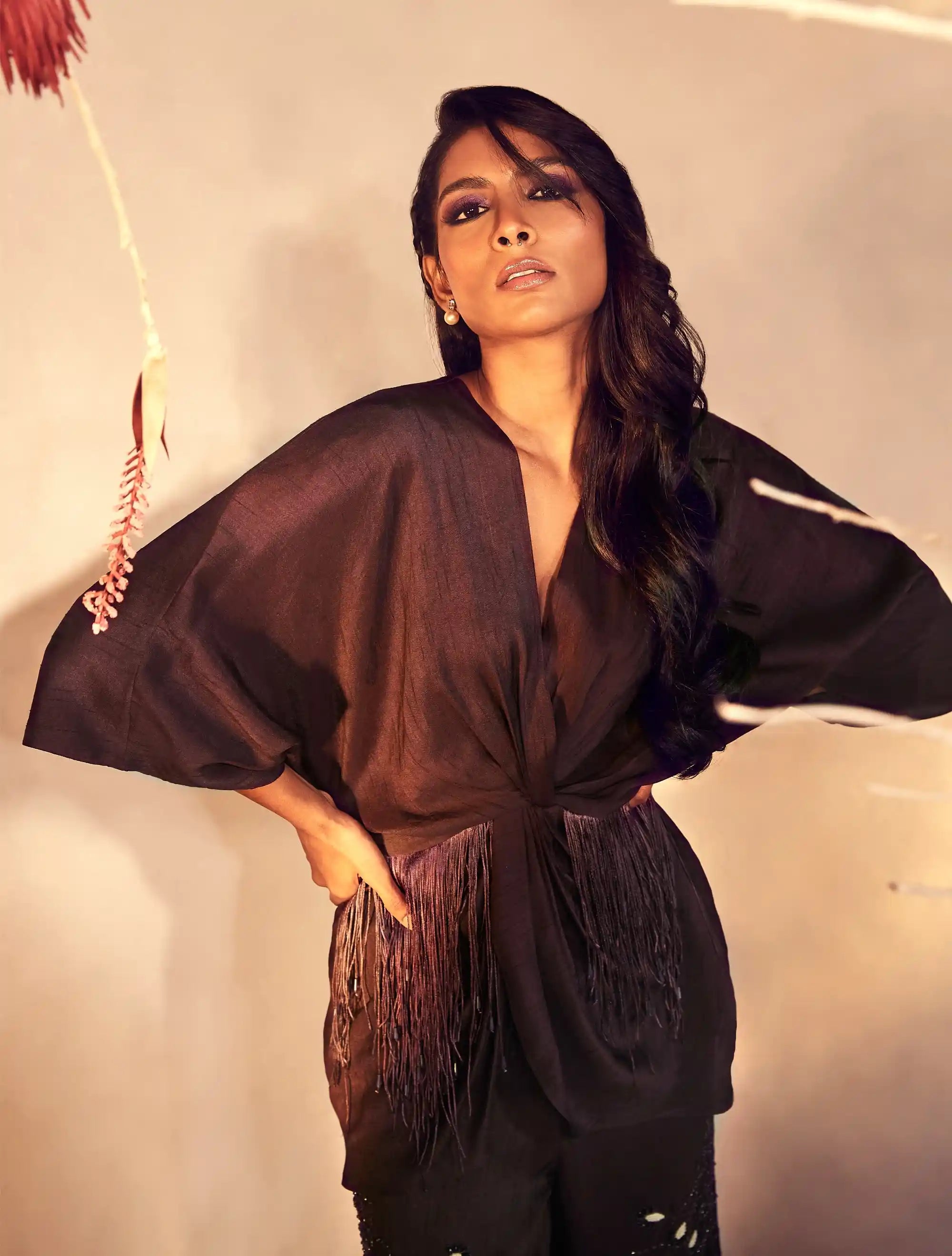 Step out in style with this blackberry wine co-ord set, featuring straight-fit pants beautifully embellished with intricate floral embroidery, delicate French knots, shimmering crystals, and chic cut pipes. The ensemble is complemented by a draped kimono top, designed with fringes at the waist for a sassy and sophisticated flair. Perfect for both casual gatherings and upscale events, this co-ord set seamlessly blends elegance with contemporary edge, ensuring you make a memorable impression.