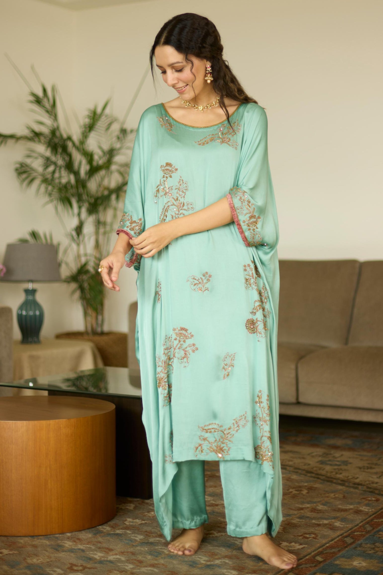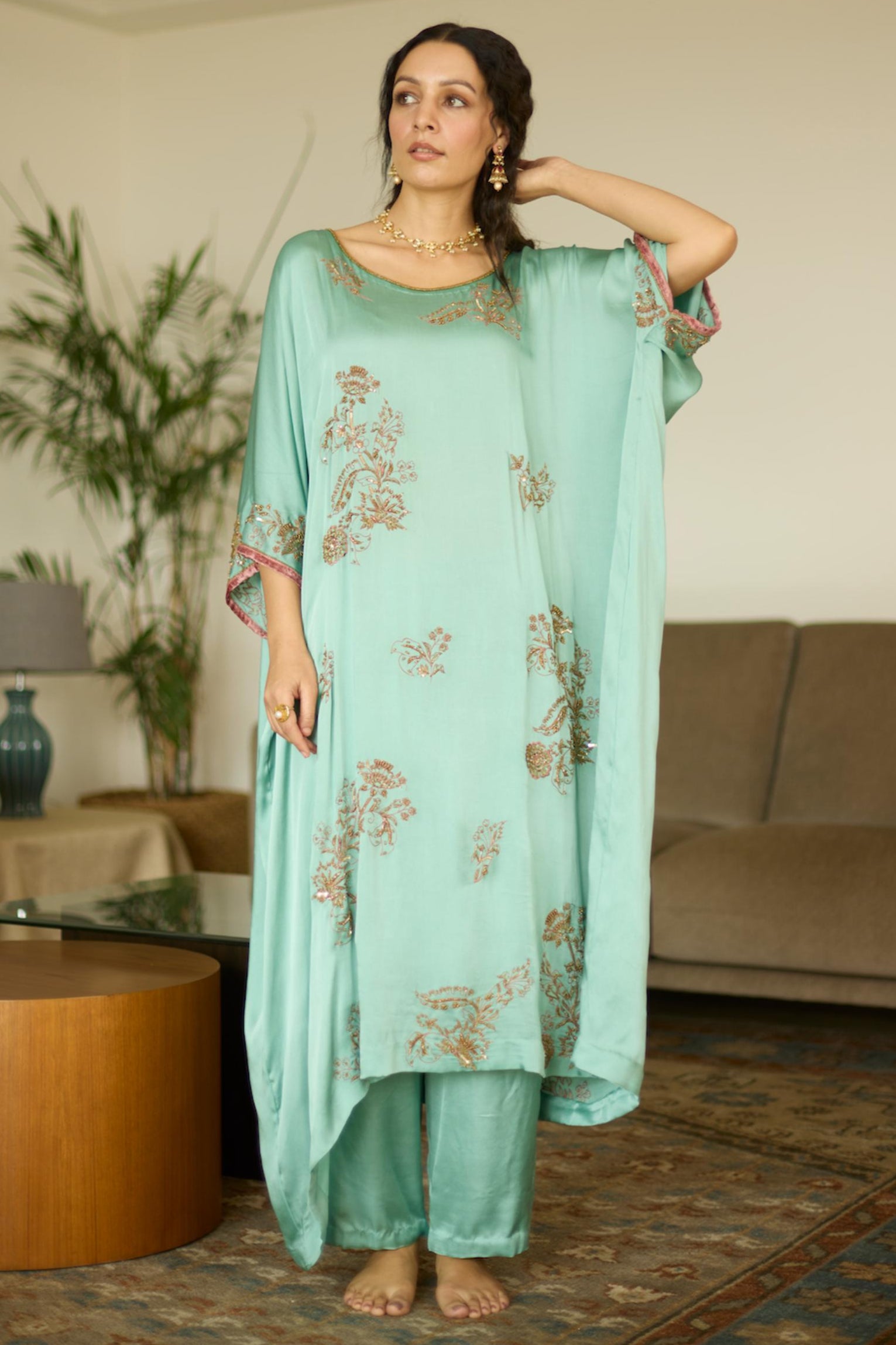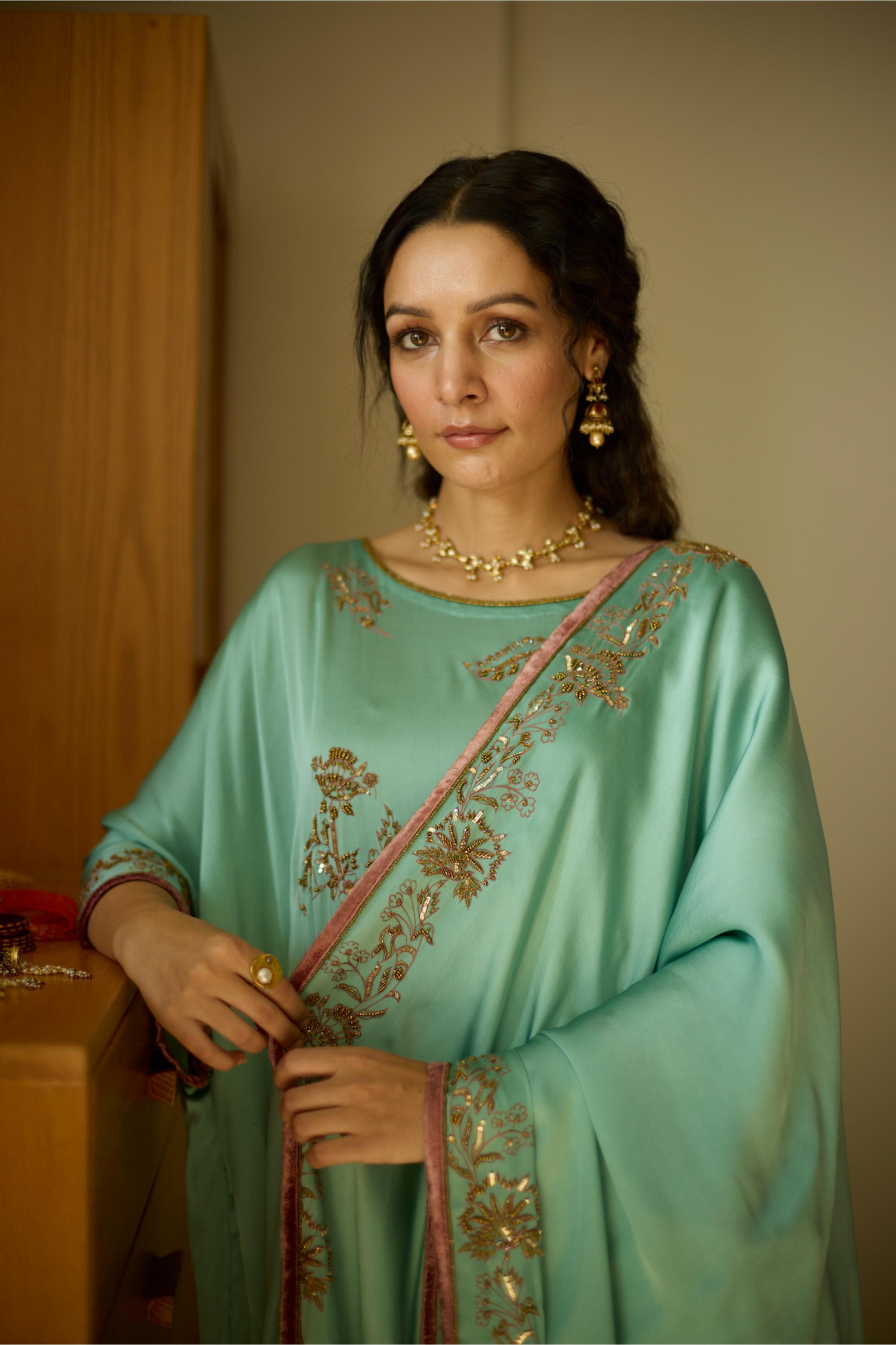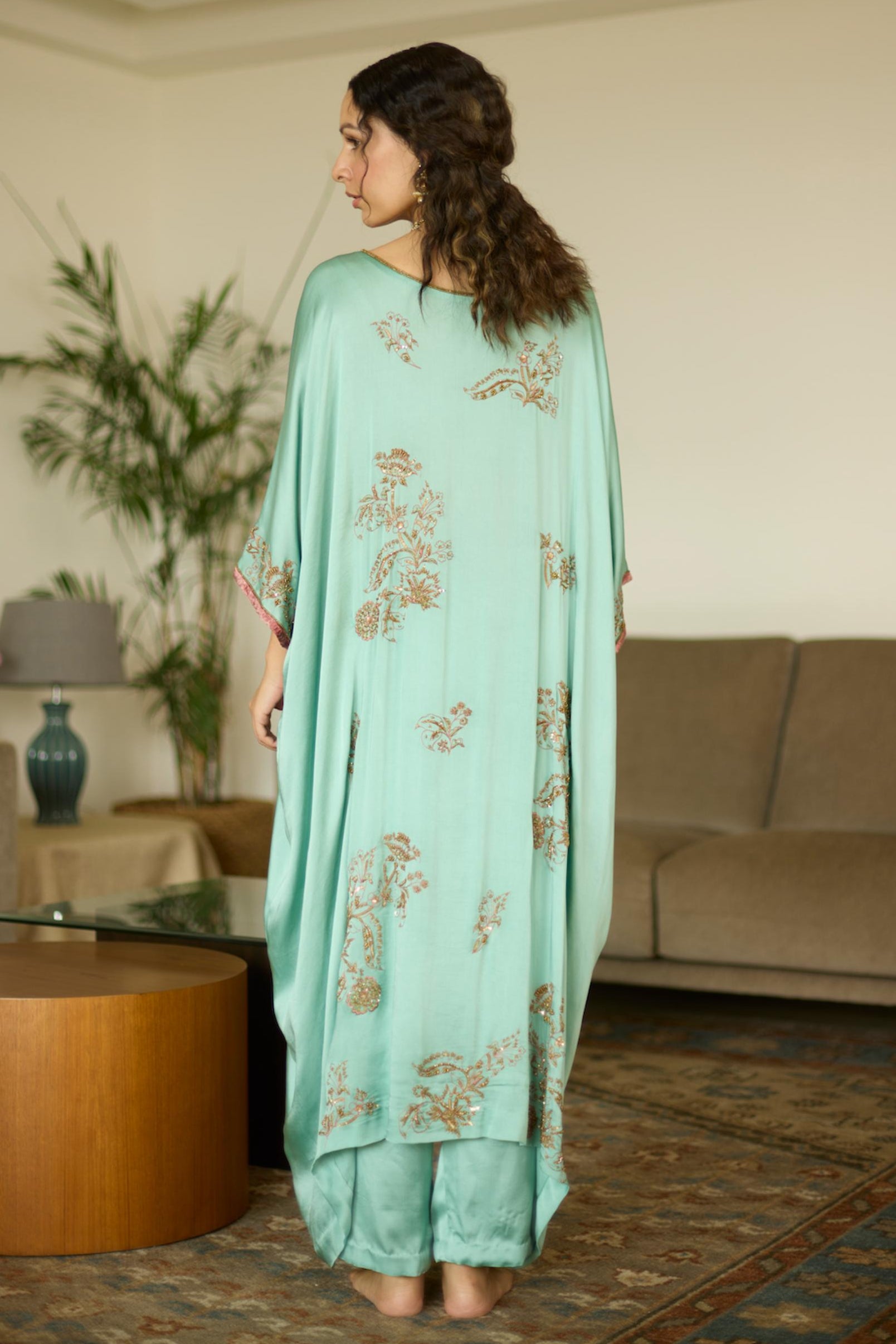 Embrace effortless elegance with the Blue Aarohi Hand-Embroidered Kaftan Set. Featuring intricate detailing and a flowy silhouette, this ensemble is perfect for festive celebrations, resort wear, and special occasions.