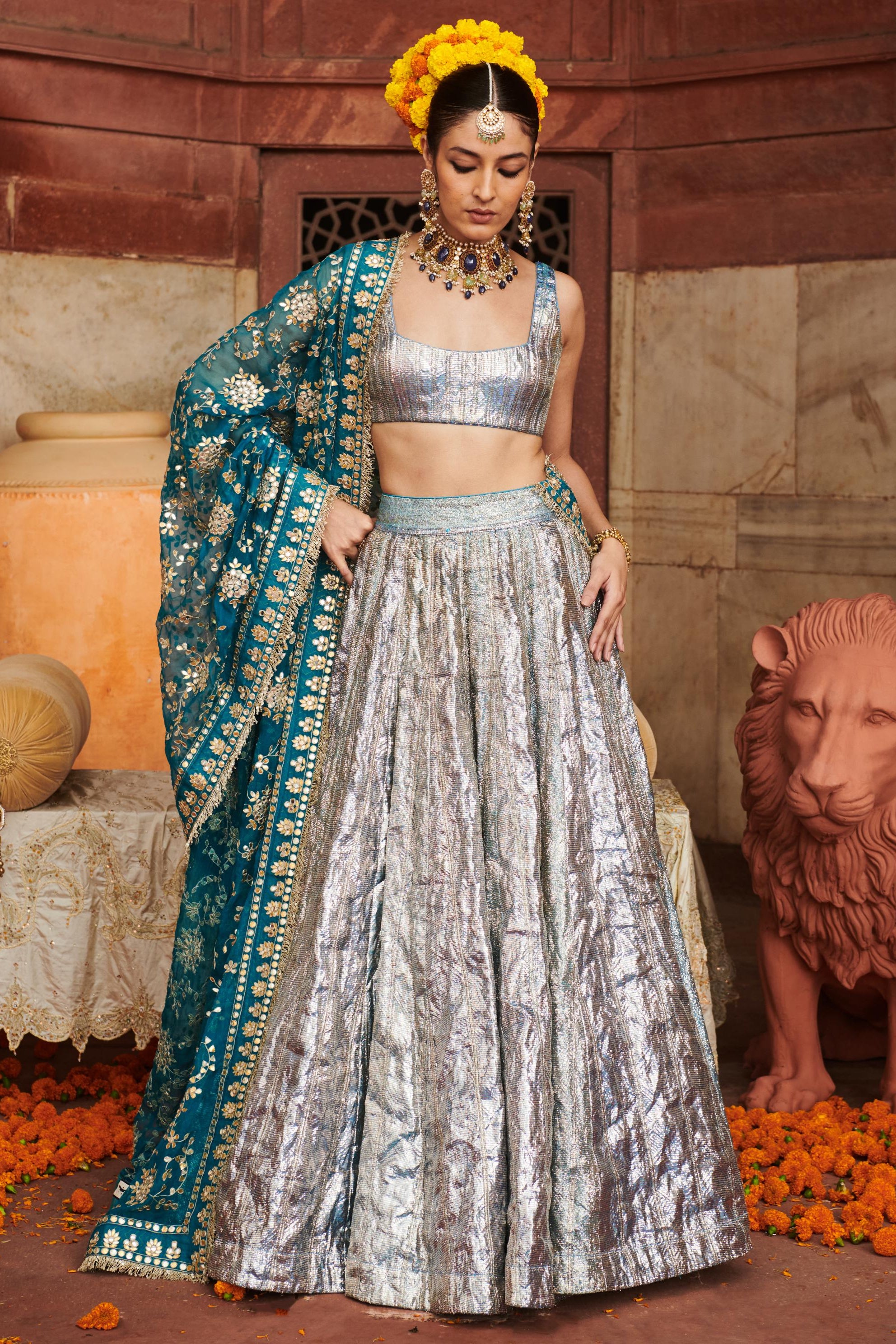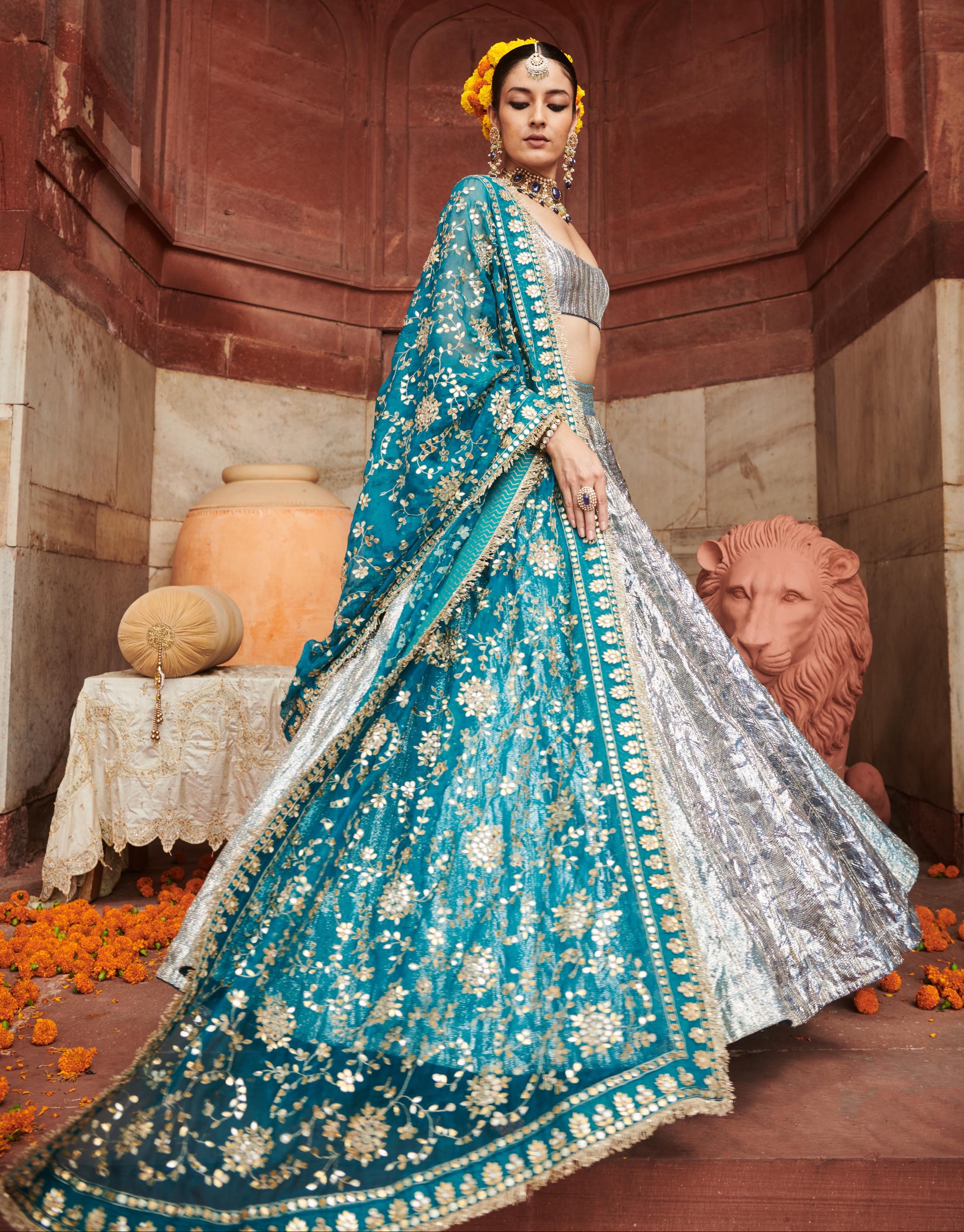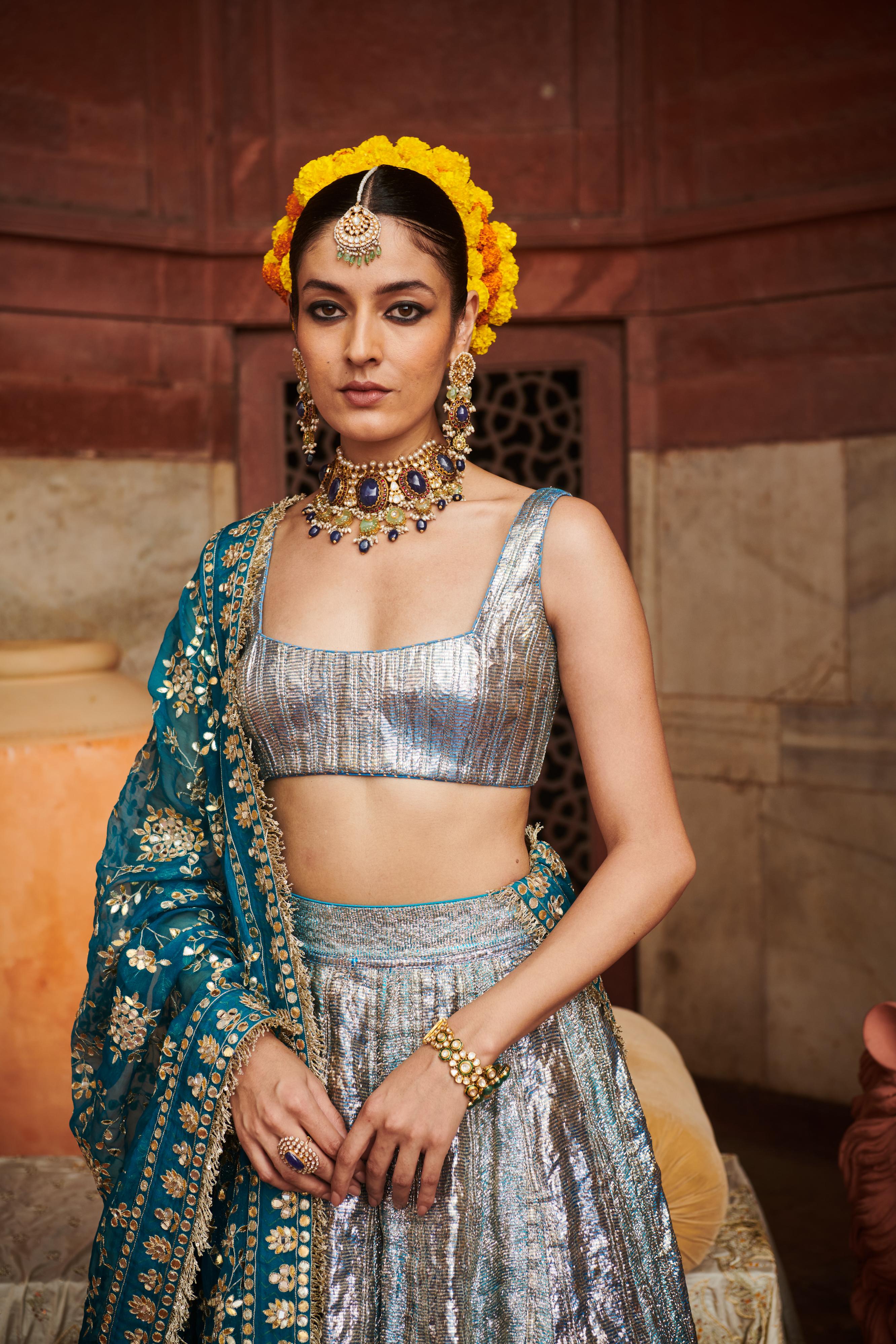 This blue lampi lehenga is paired with a matching square-neck blouse exuding timeless elegance. Highlighted with an organza dupatta adorned with intricate mirror work and fine kiran detailing this ensemble blends traditional charm with modern sophistication perfect for weddings and festive celebrations.