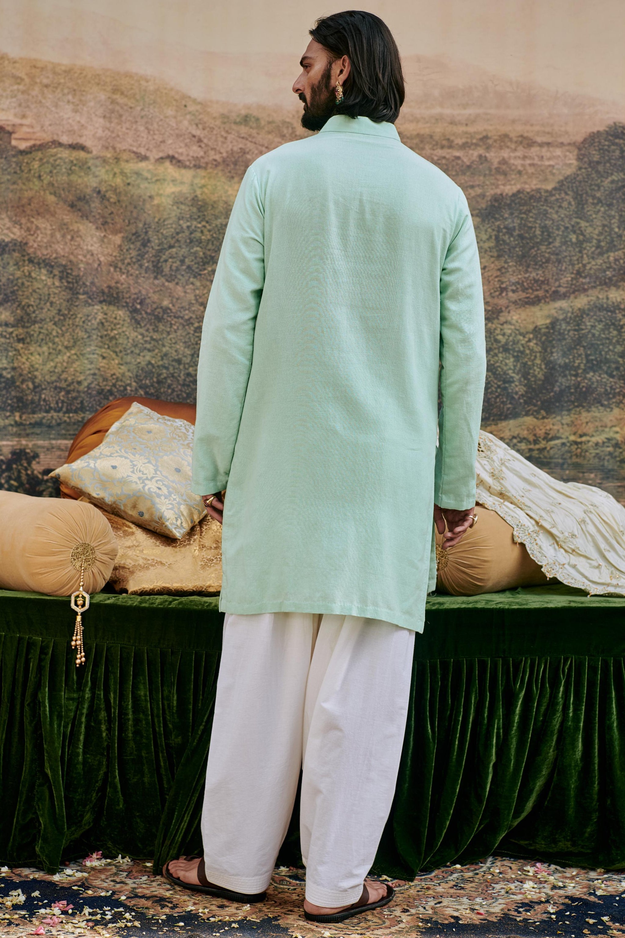 A refined blue linen kurta adorned with intricate mirror work on the neckline and full sleeves, paired with classic white cotton pants. This elegant ensemble is perfect for both casual and festive occasions.