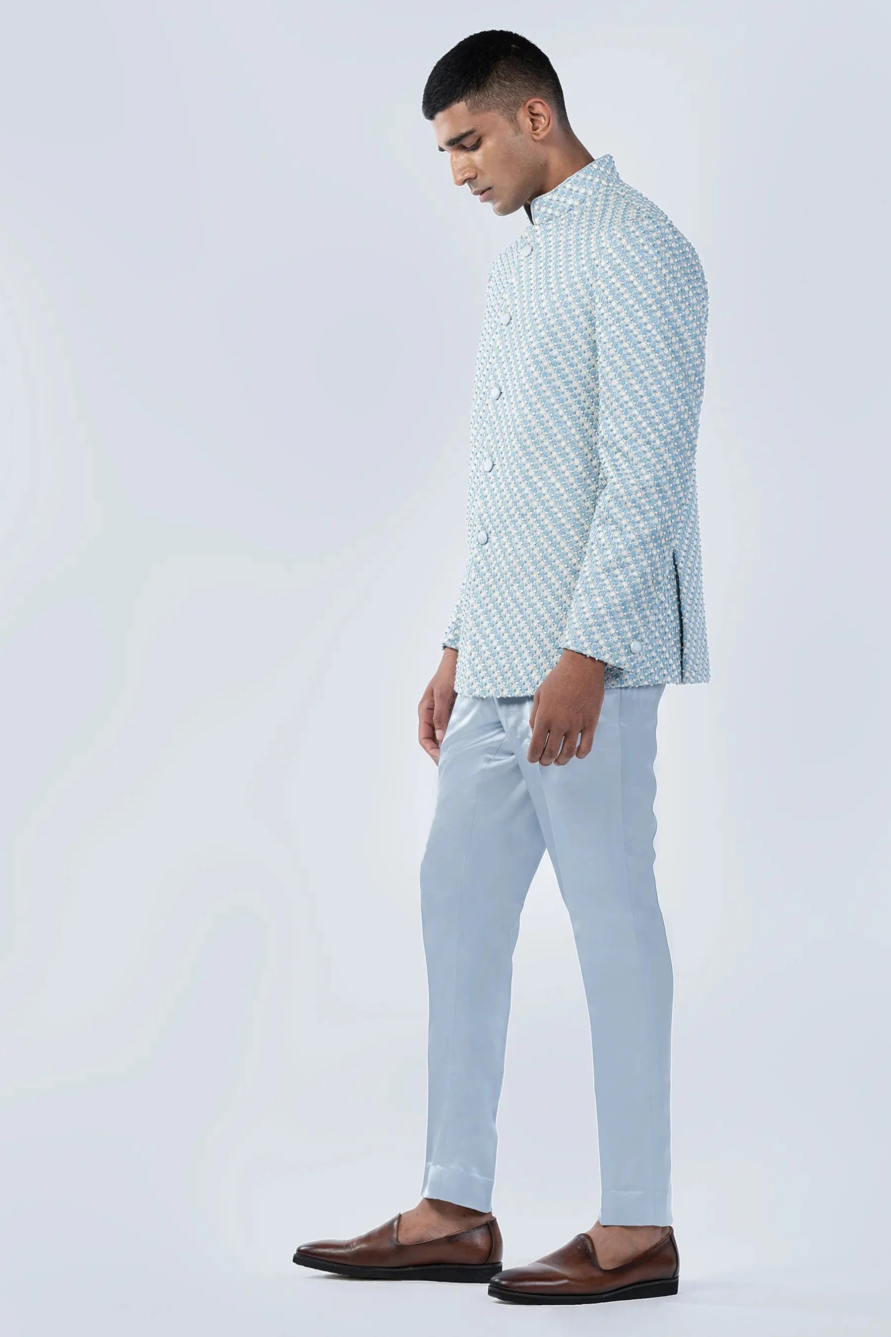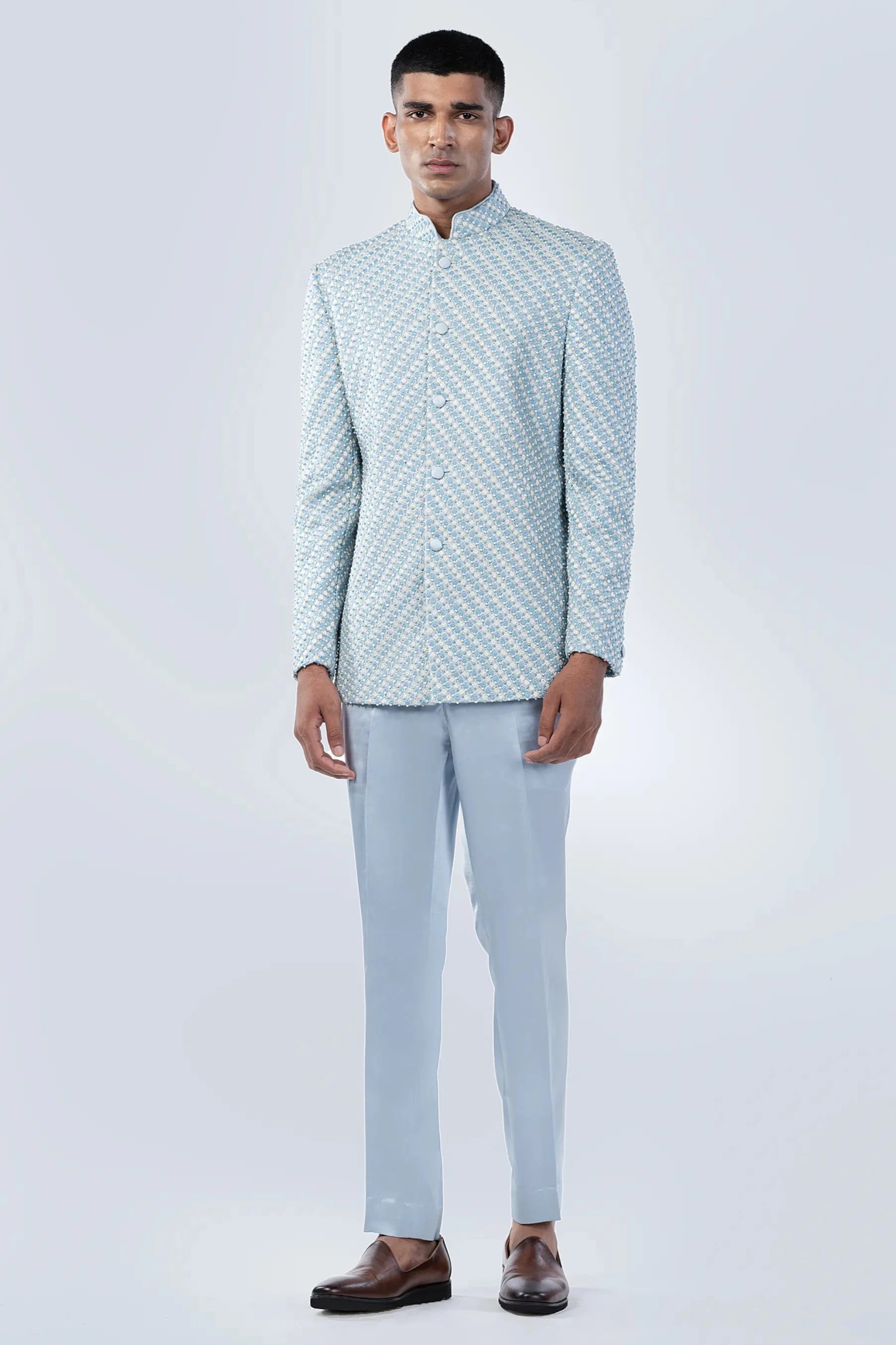 Make a statement of refined luxury with the Blue All Over French Knot Embroidered Bandgala Jacket, a stunning fusion of classic design and intricate craftsmanship. The rich blue fabric serves as the perfect backdrop for the exquisite all-over French knot embroidery, creating a sophisticated and timeless look. Ideal for weddings, festive occasions, or formal events, this Bandgala jacket exudes opulence and style.