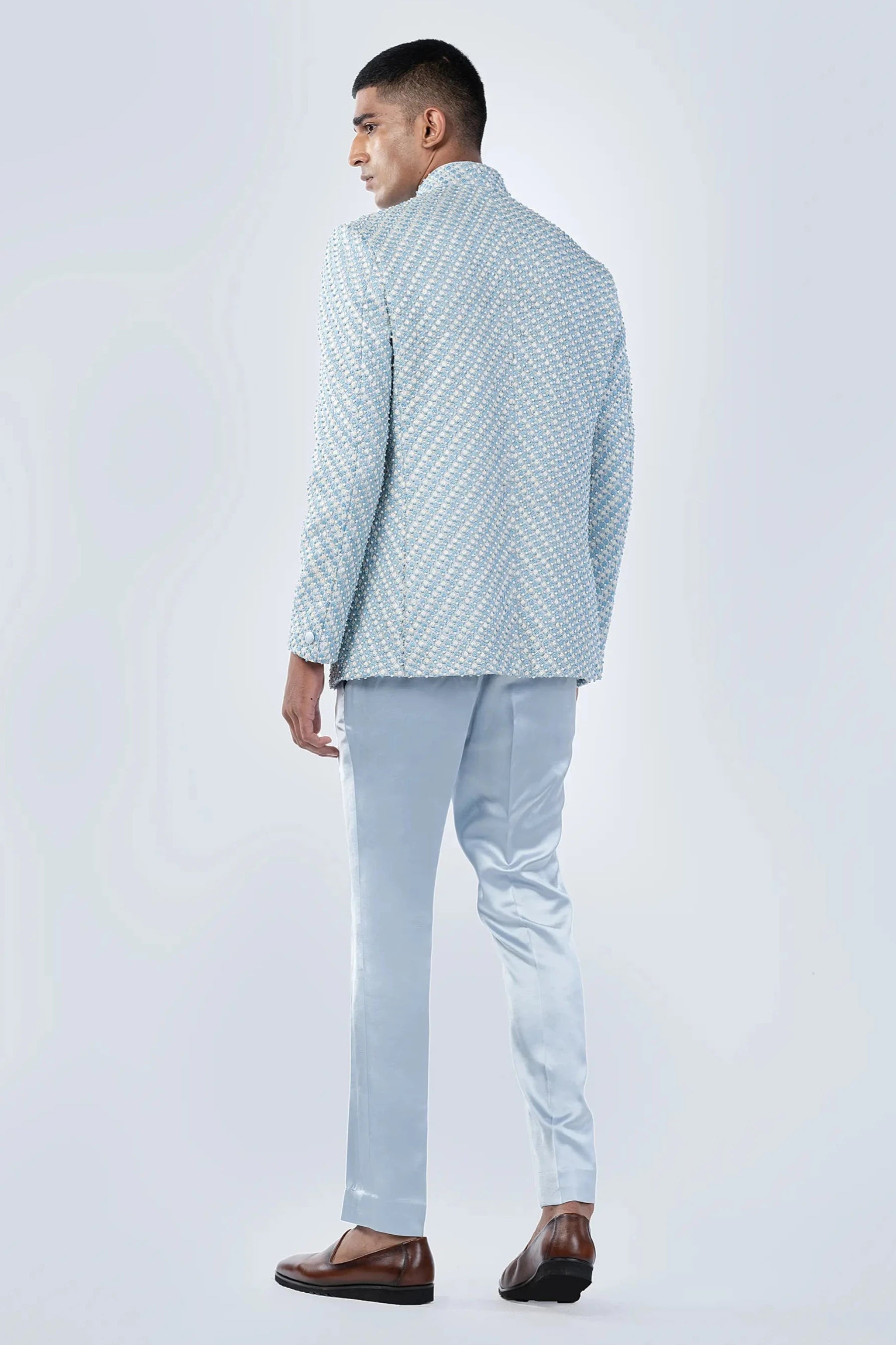 Make a statement of refined luxury with the Blue All Over French Knot Embroidered Bandgala Jacket, a stunning fusion of classic design and intricate craftsmanship. The rich blue fabric serves as the perfect backdrop for the exquisite all-over French knot embroidery, creating a sophisticated and timeless look. Ideal for weddings, festive occasions, or formal events, this Bandhgala jacket exudes opulence and style.