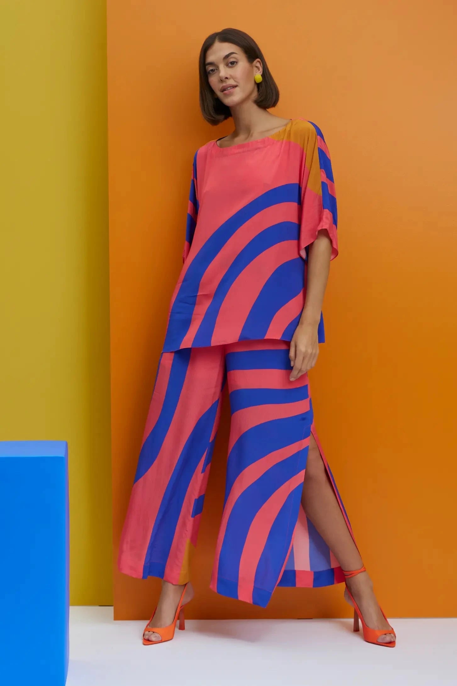 Bring vibrant color and modern style to your wardrobe with this blue and coral boxy top with slitted pants. The bold color combination and relaxed, boxy fit of the top offer a chic and contemporary look, while the slitted pants add a touch of edginess and sophistication. Perfect for casual outings or stylish events, this set combines comfort, versatility, and standout design for an effortlessly fashionable ensemble.