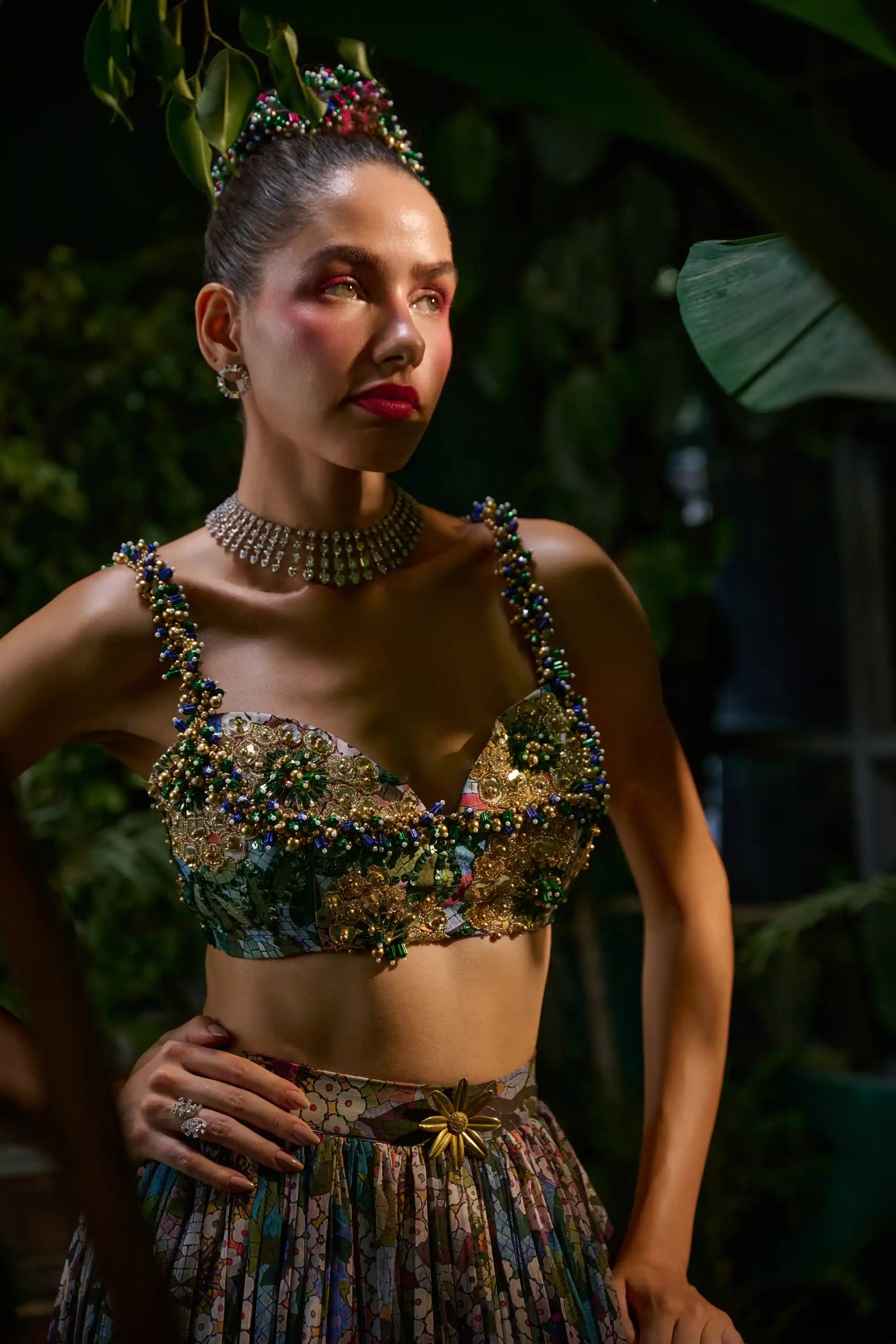 Embrace the essence of paradise with this tropical-inspired lehenga, featuring charming gathers at the waist and a floral trim at the band. The blouse showcases a flattering sweetheart neckline, meticulously handcrafted with delicate beads and crystals for a touch of glamour. The straps are elegantly adorned with drop beads, adding an enchanting detail to this stunning ensemble. Perfect for making a statement at any special occasion!