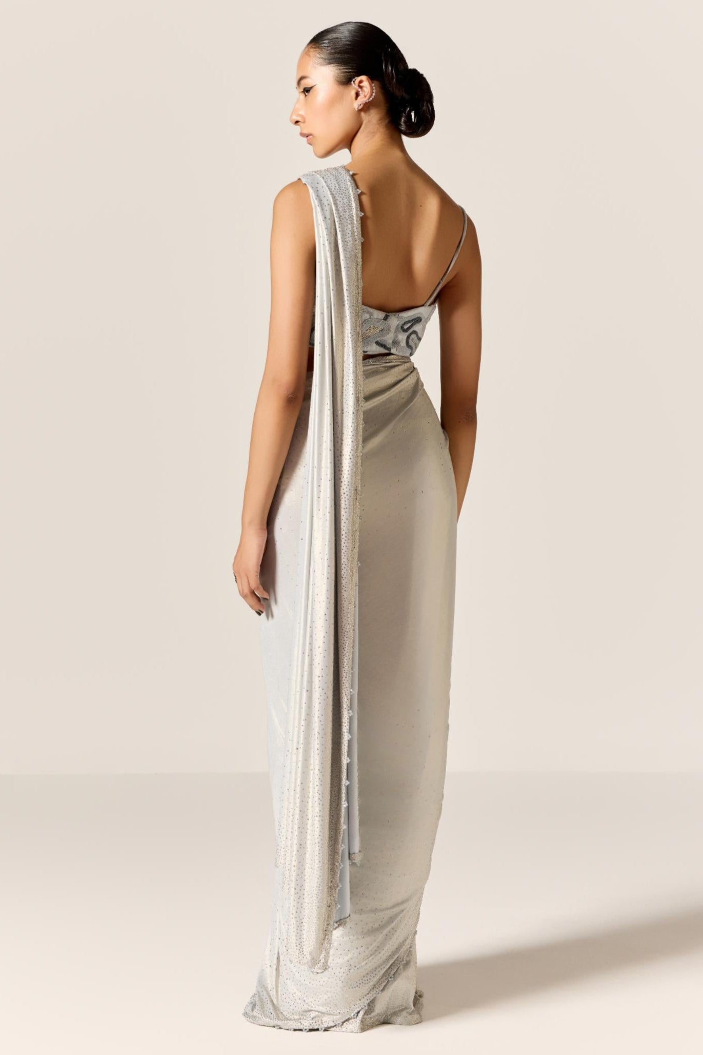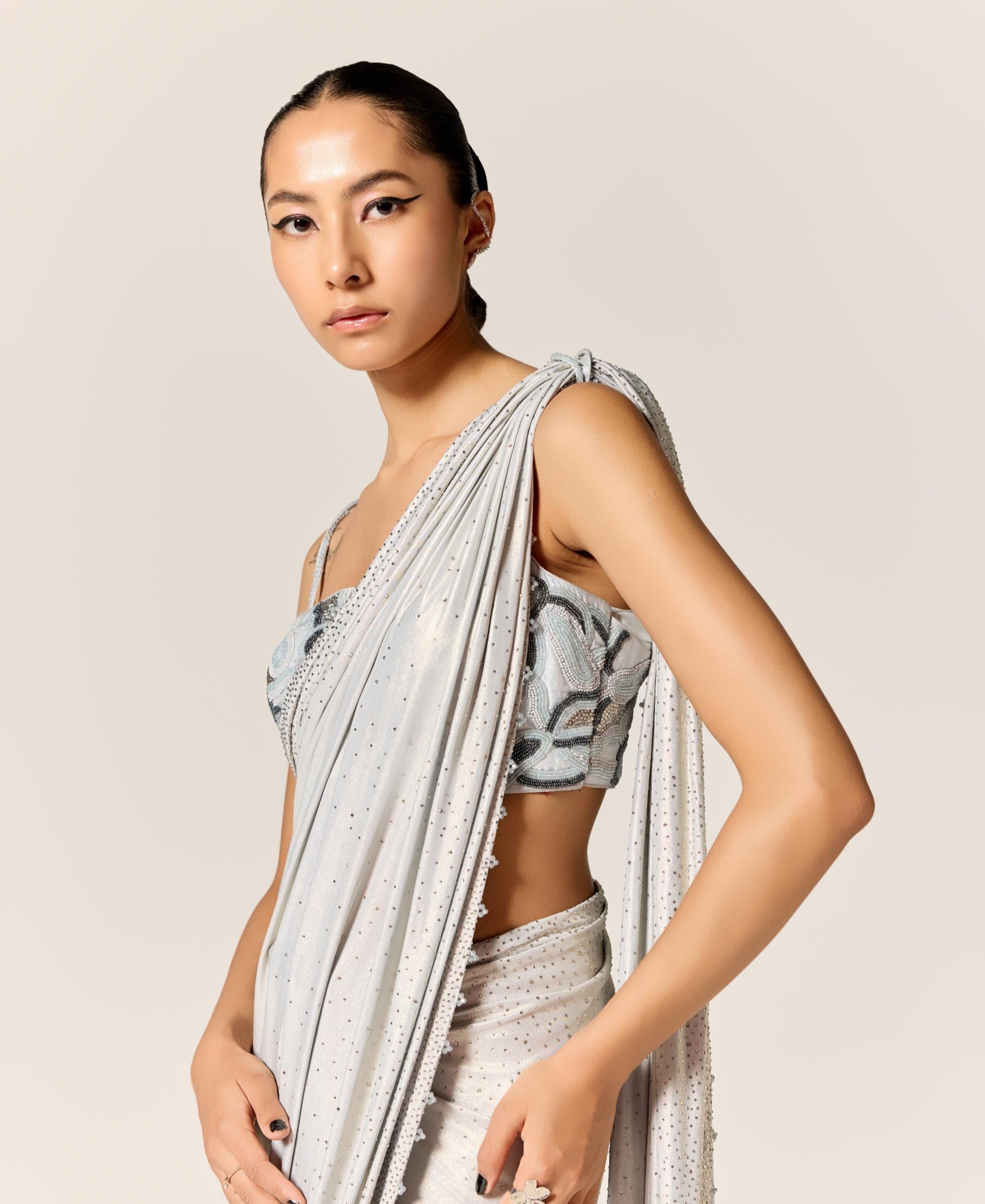 The Blue Asahi Eminence Saree is a serene and sophisticated creation that radiates quiet luxury. Draped in a calming blue tone, it features delicate craftsmanship and a graceful flow that enhances its refined silhouette. Ideal for formal events, festive gatherings, or elegant evenings, the saree offers a blend of tradition with modern poise. Its timeless appeal and effortless charm make it a wardrobe essential. A true celebration of elegance in motion.