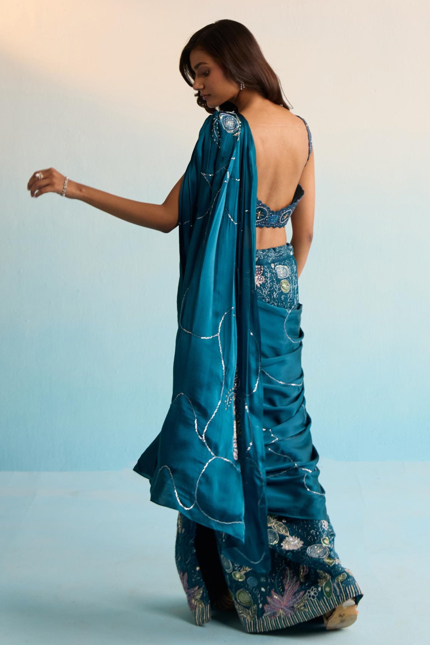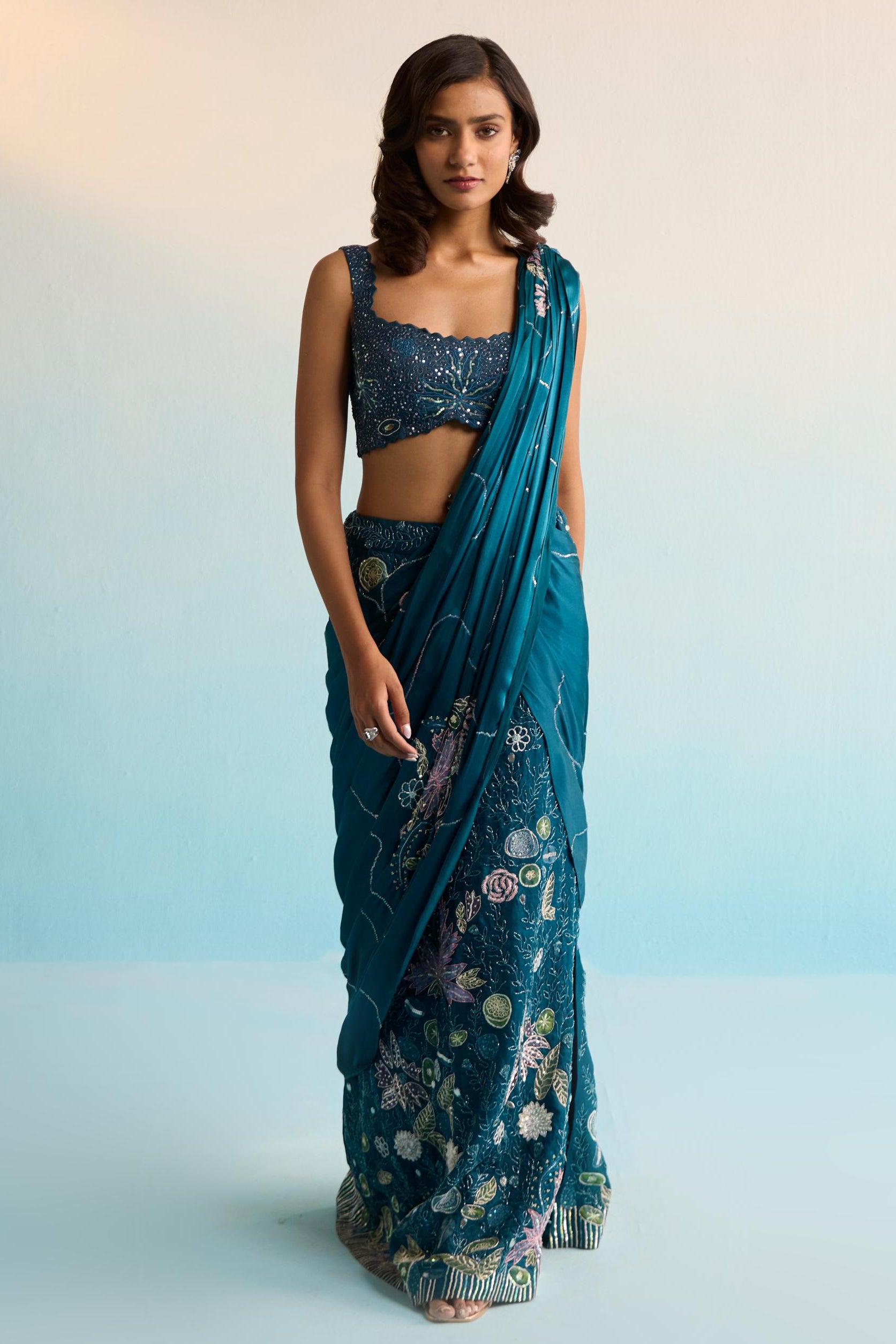 Effortless elegance meets contemporary ease in the Blue Bahaar Elira Pre-Draped Saree. Crafted in a flowing silhouette with pre-stitched pleats, this saree captures the beauty of traditional draping without the hassle. The rich blue hue evokes a sense of calm sophistication, while subtle detailing adds depth and movement. Ideal for cocktail parties, festive occasions, or destination weddings, the Blue Bahaar Elira Pre-Draped Saree is perfect for the modern woman who values comfort without compromising on style.