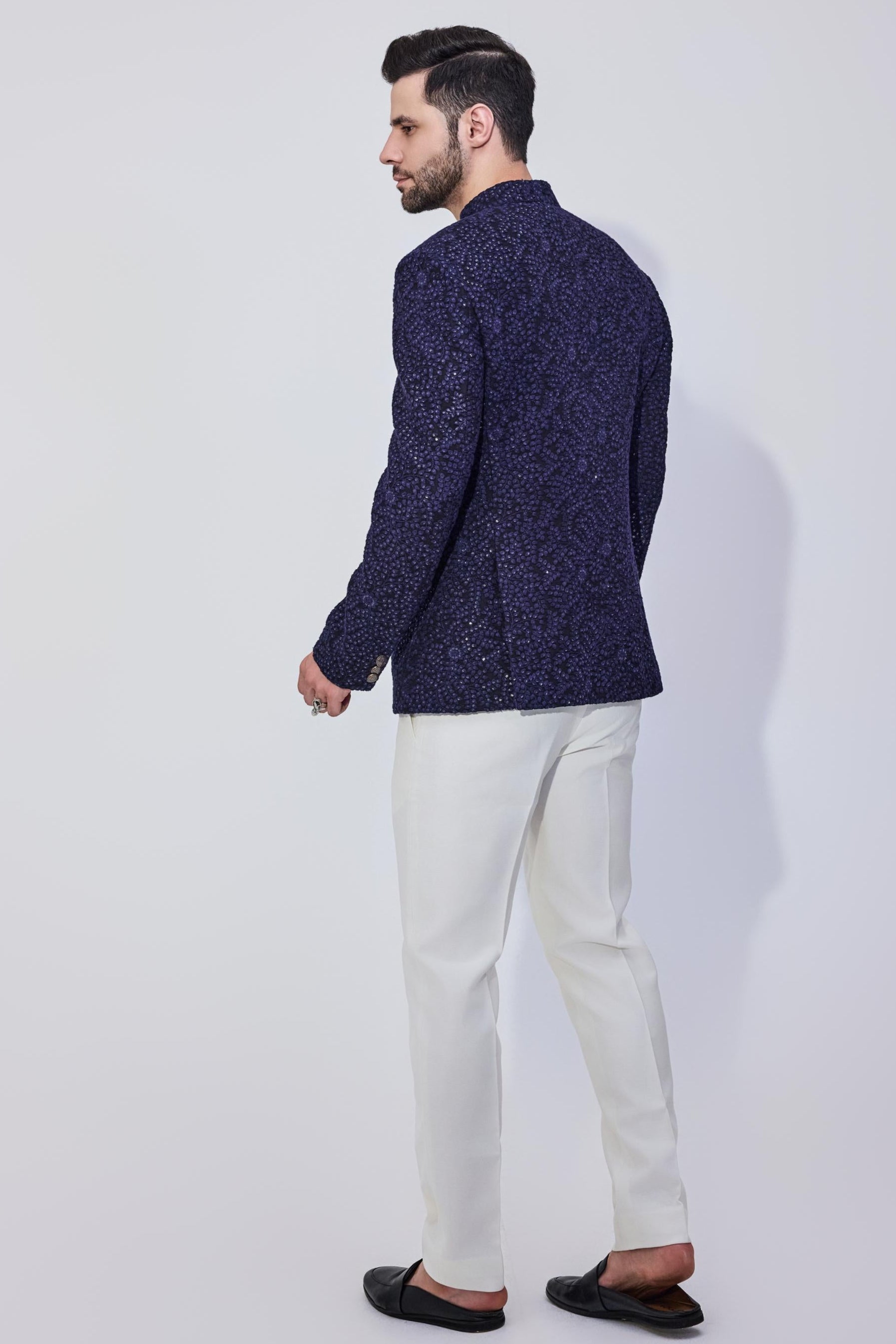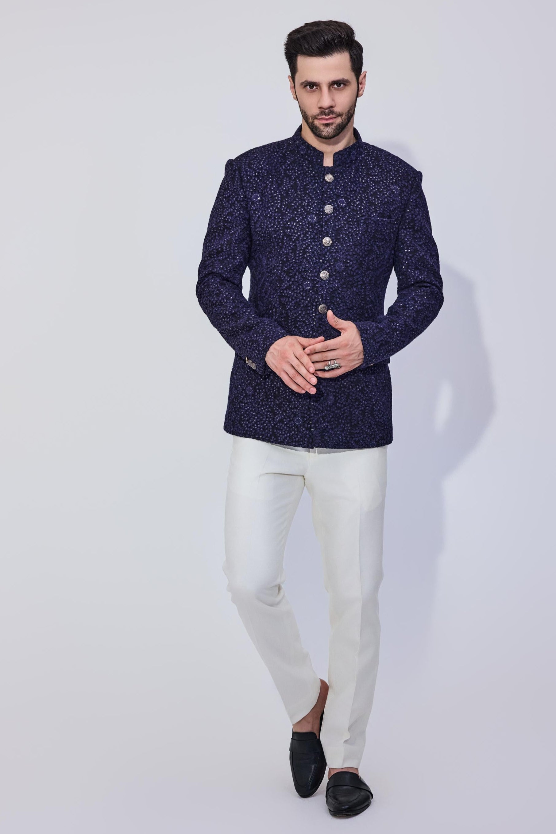 Elevate your festive wardrobe with the Blue Sequins Bandhgala paired with Off-White Pants — a refined ensemble that strikes the perfect balance between tradition and glamour. The deep blue bandhgala is embellished with delicate sequin embroidery that catches the light with every move, adding a touch of understated shimmer. Contrasted with crisp off-white pants, this look is tailored for celebrations, evening weddings, and formal gatherings. Ideal for the modern man who values heritage silhouettes with a contemporary, polished finish.