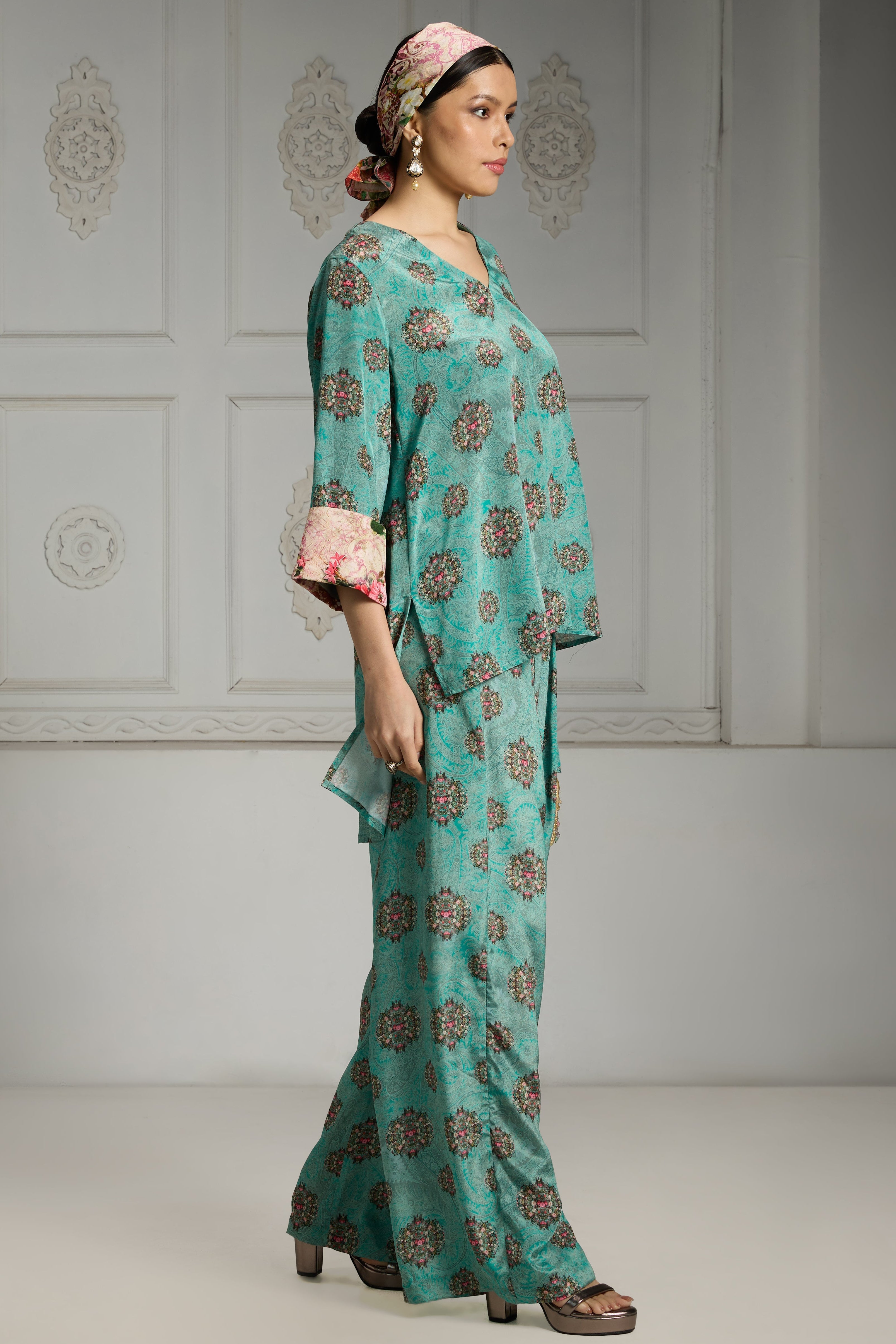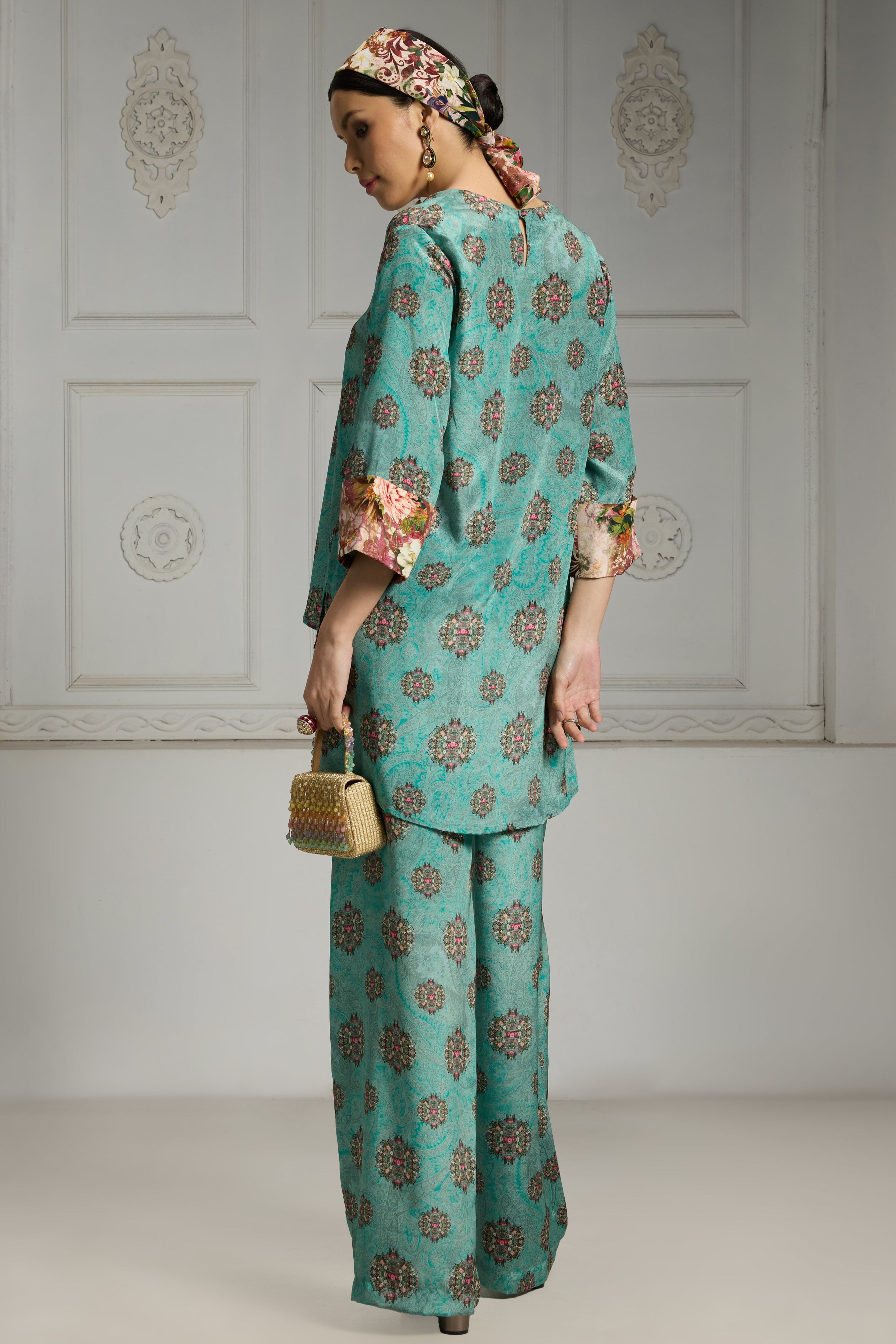 The Blue Butti Printed Tunic Set is a perfect blend of tradition and comfort. Featuring delicate butti prints on a soothing blue base, this coordinated set offers an effortlessly elegant look for daytime gatherings or casual festive wear. With its relaxed fit and timeless detailing, it's a versatile choice for those who love subtle prints with cultural charm.