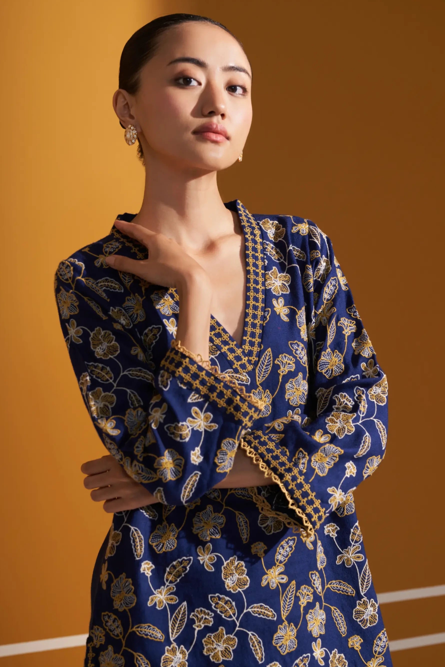 Embrace winter elegance with this royal blue woolen kurta set. Featuring intricate gold floral embroidery, a V-neckline, and embroidered cuffs, the straight-cut kurta offers both comfort and sophistication. Paired with matching straight-leg pants, this chic ensemble is perfect for evening gatherings or festive occasions, blending timeless charm with cozy warmth for the modern woman.