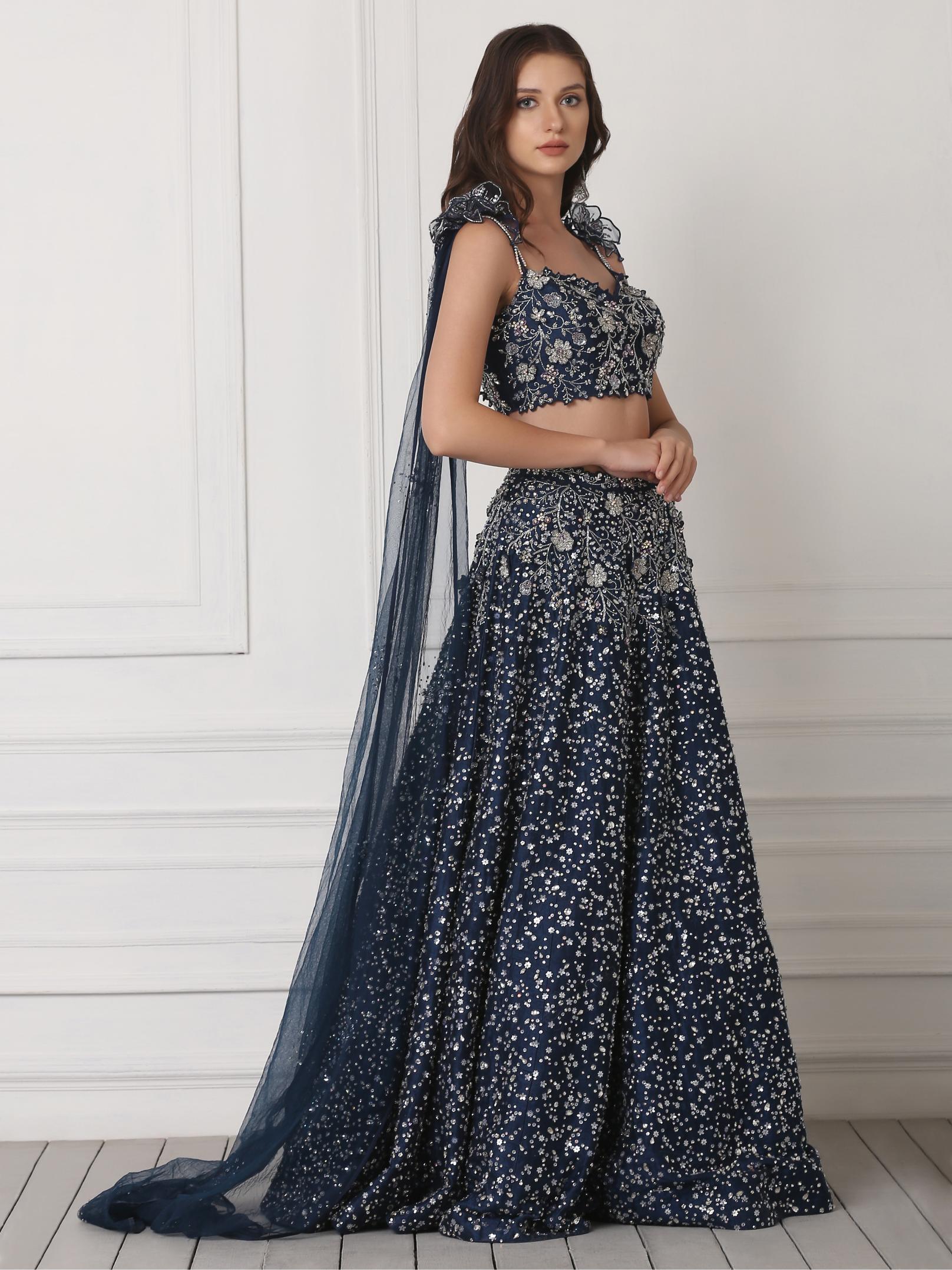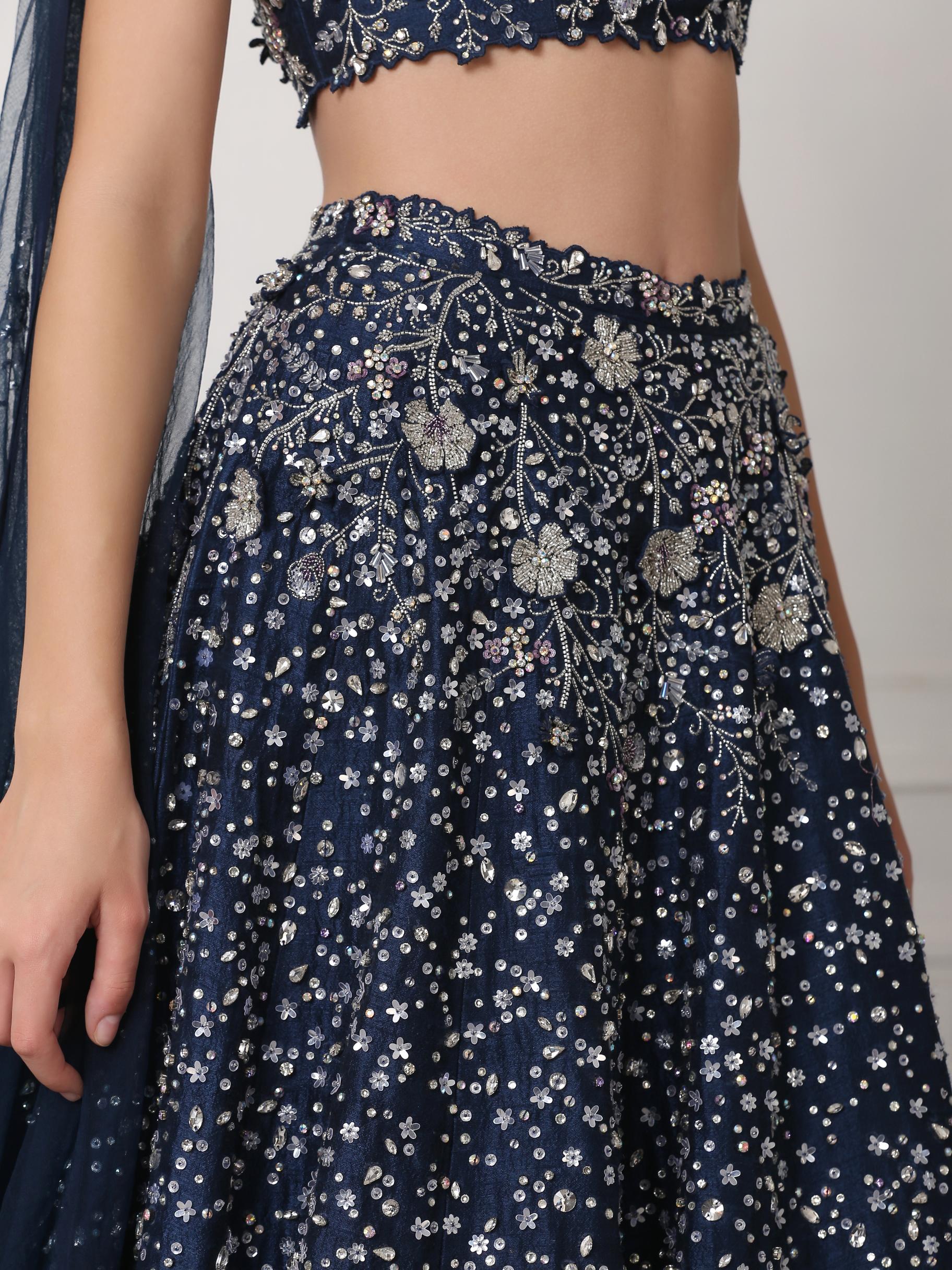 Blue crystal and 3d flower embellished lehenga set