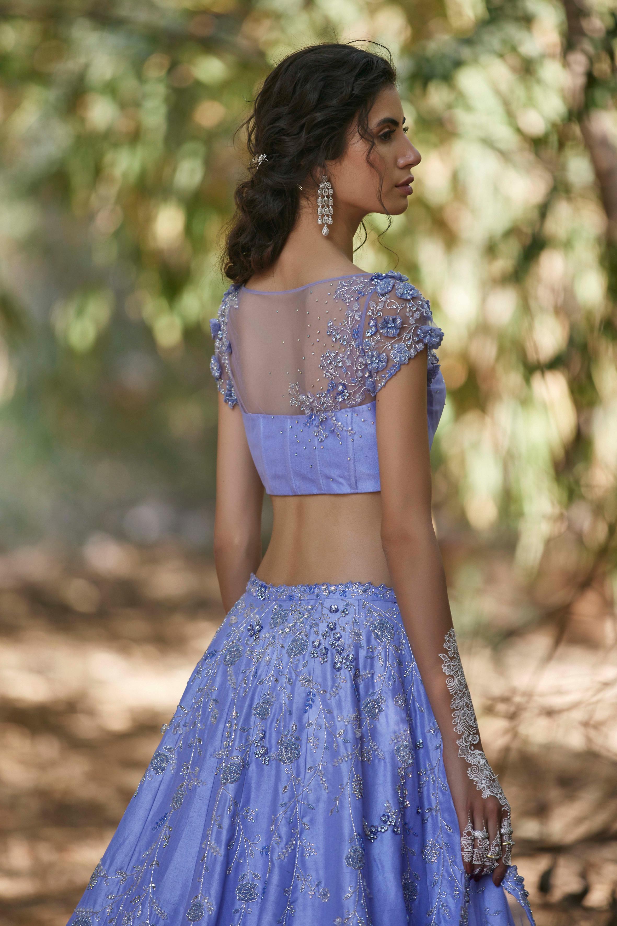 This periwinkle lehenga set is beautifully embellished with crystals and sequins, featuring an elegant floral design. The corsetted blouse is accentuated with floral-embroidered shoulders, adding a touch of sophistication. Both the lehenga and dupatta are intricately embroidered with delicate floral motifs, creating a stunning, cohesive look. The modern ensemble is completed with a gorgeous cutwork-edged dupatta, perfect for a contemporary yet timeless bridal or event look.