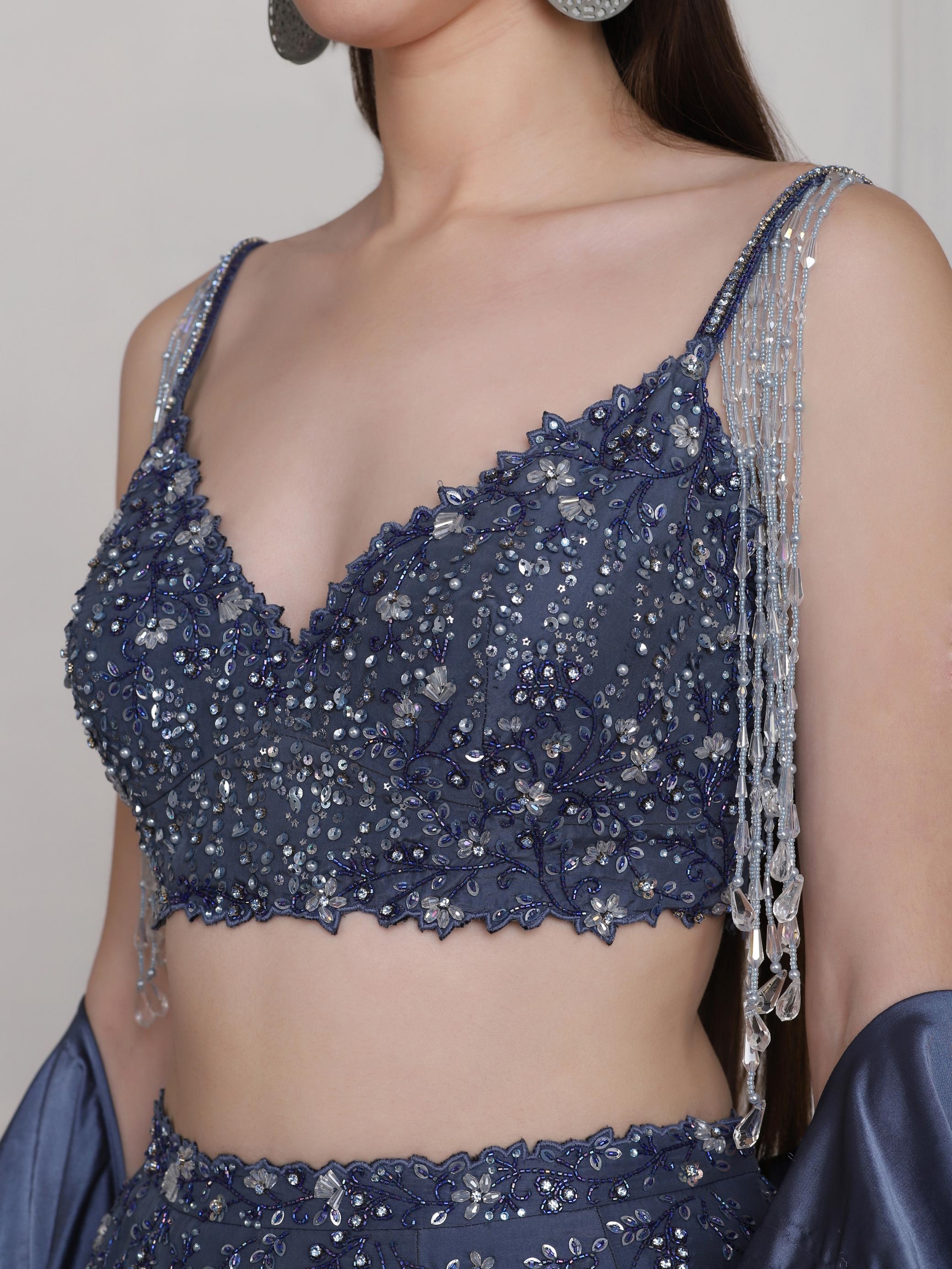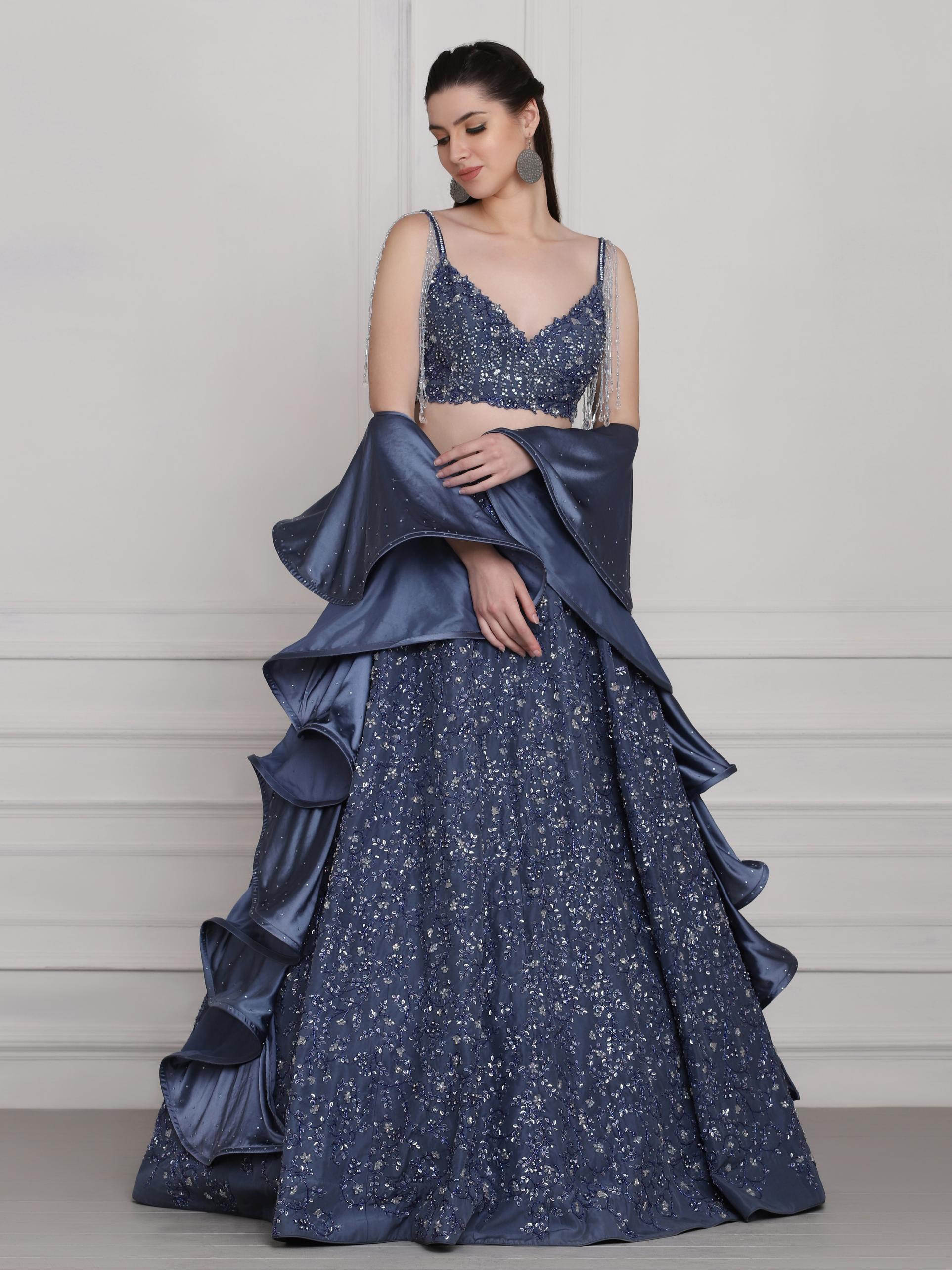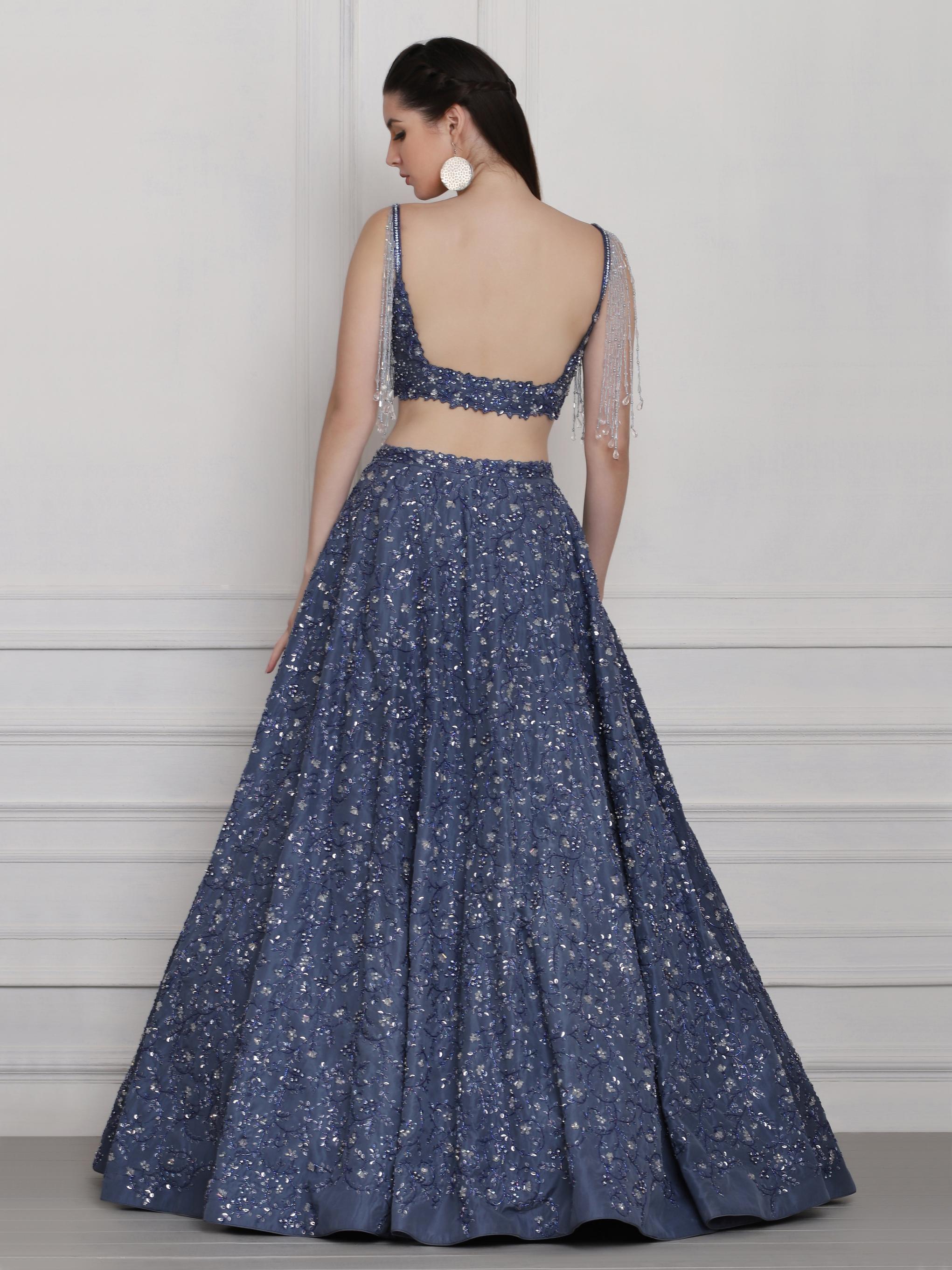 Dazzle in sophistication with this blue crystal and Katdana-embellished lehenga set, a perfect fusion of modern glamour and intricate craftsmanship. The shimmering crystal embellishments lend a celestial glow, while the delicate Katdana work adds texture and depth, creating a mesmerizing interplay of light and movement. The voluminous lehenga paired with a meticulously designed blouse offers an effortlessly regal silhouette, making it an ideal choice for receptions, festive soirŽes, and grand celebrations.