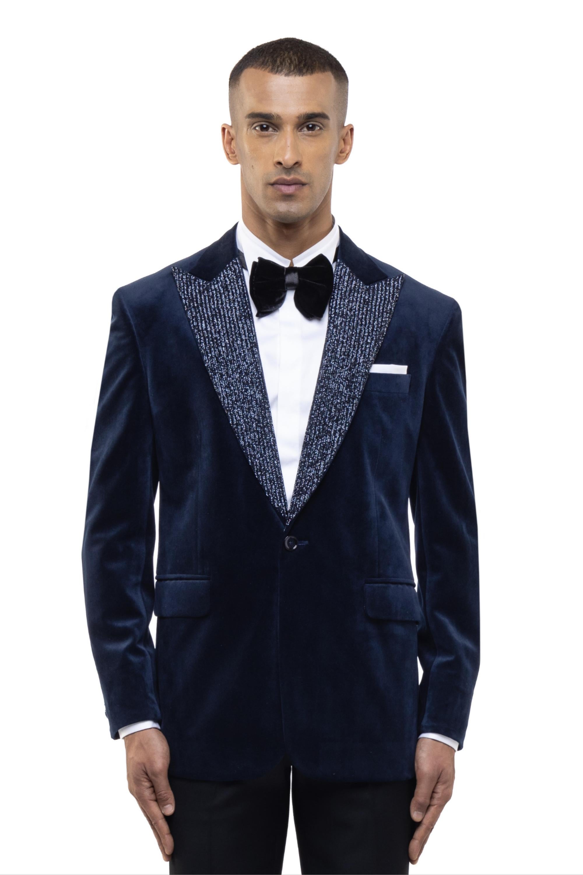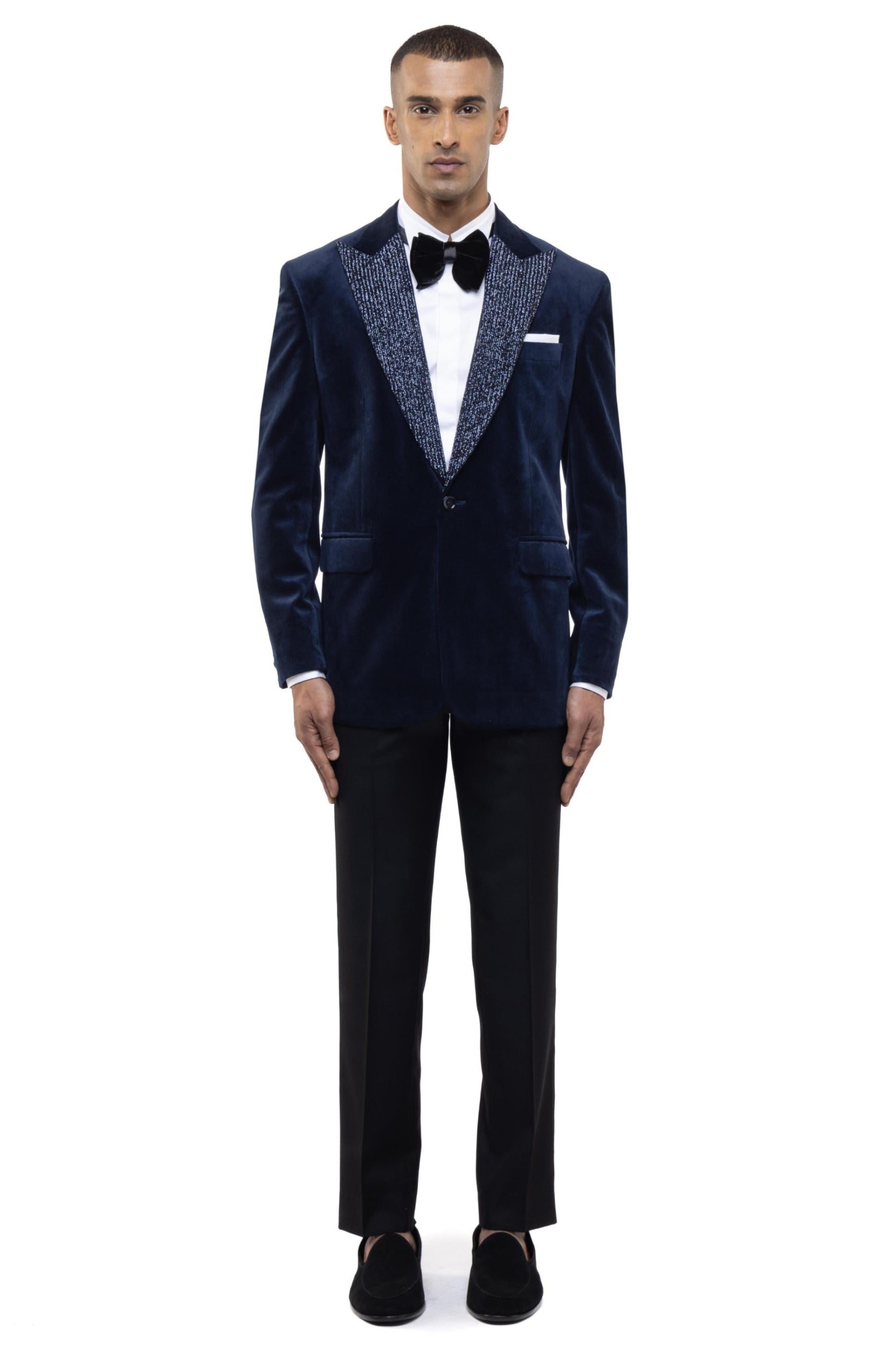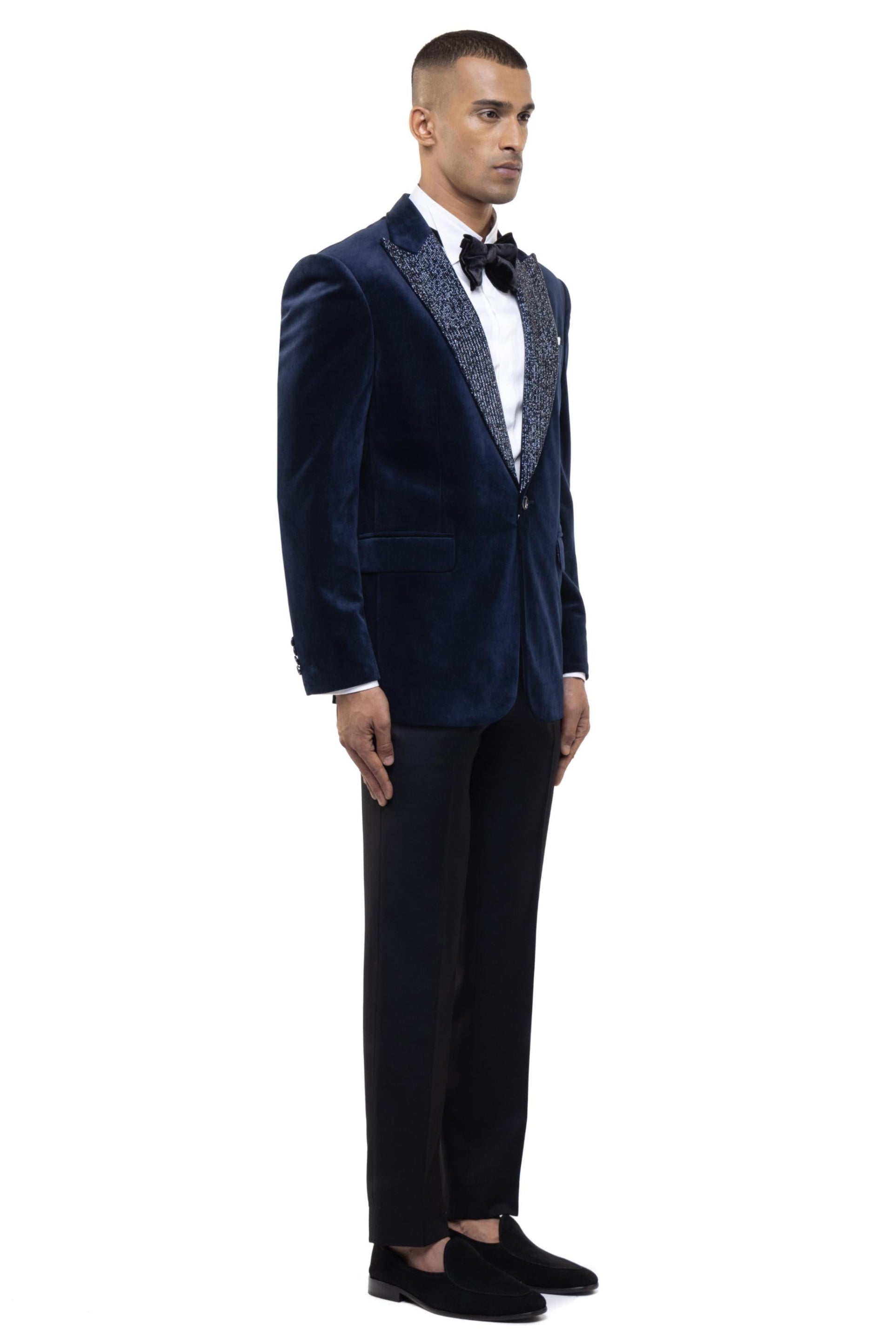 Step into refined luxury with the Blue Cutdana Peak Lapel Tuxedo Set, a striking ensemble that merges timeless tailoring with intricate embellishment. Crafted in a deep blue hue, this tuxedo features a sharp peak lapel adorned with delicate cutdana embroidery, adding just the right touch of shimmer. Perfect for receptions, black-tie events, and elegant evening affairs, the Blue Cutdana Peak Lapel Tuxedo Set is designed for the gentleman who values elegance with an edge.