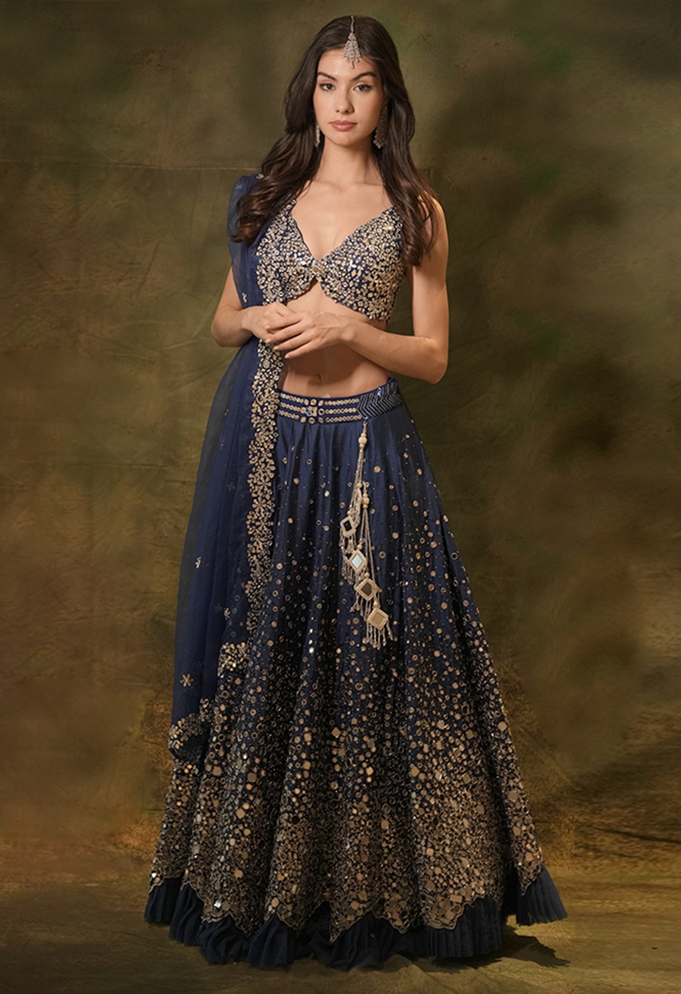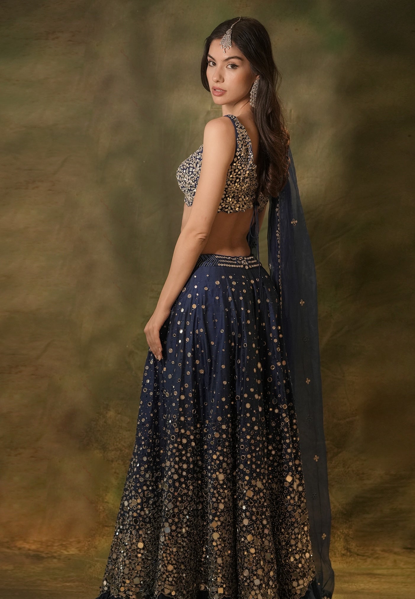 Experience the captivating allure of this lehenga, where bold blue hues are beautifully complemented by reflective mirror work. Crafted with meticulous hand-done mirror work by specialized artisans, this lehenga shines with intricate detailing. It is paired with a matching embroidered blouse and an embellished dupatta, completing the ensemble with elegance.